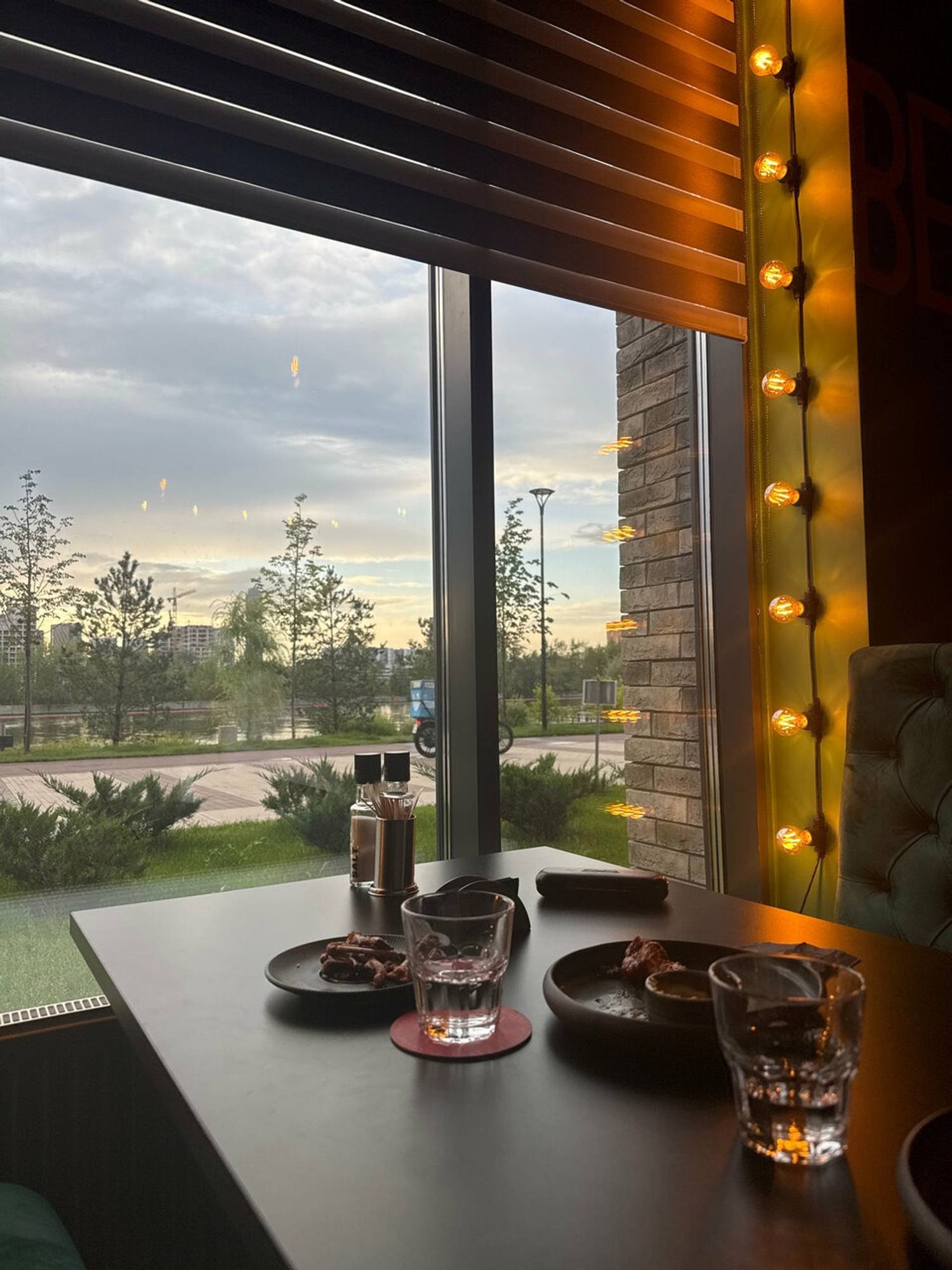 Еда и напитки. В меню — черный бургер с вишневым конфитюром, колбаски гриль, спагетти карбонара, мидии в сливочном соусе с вялеными томатами и чиабаттой. Из соусов подают: блю чиз, клюквенный, сырный и халапеньо.