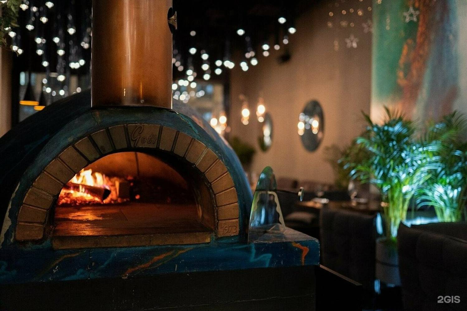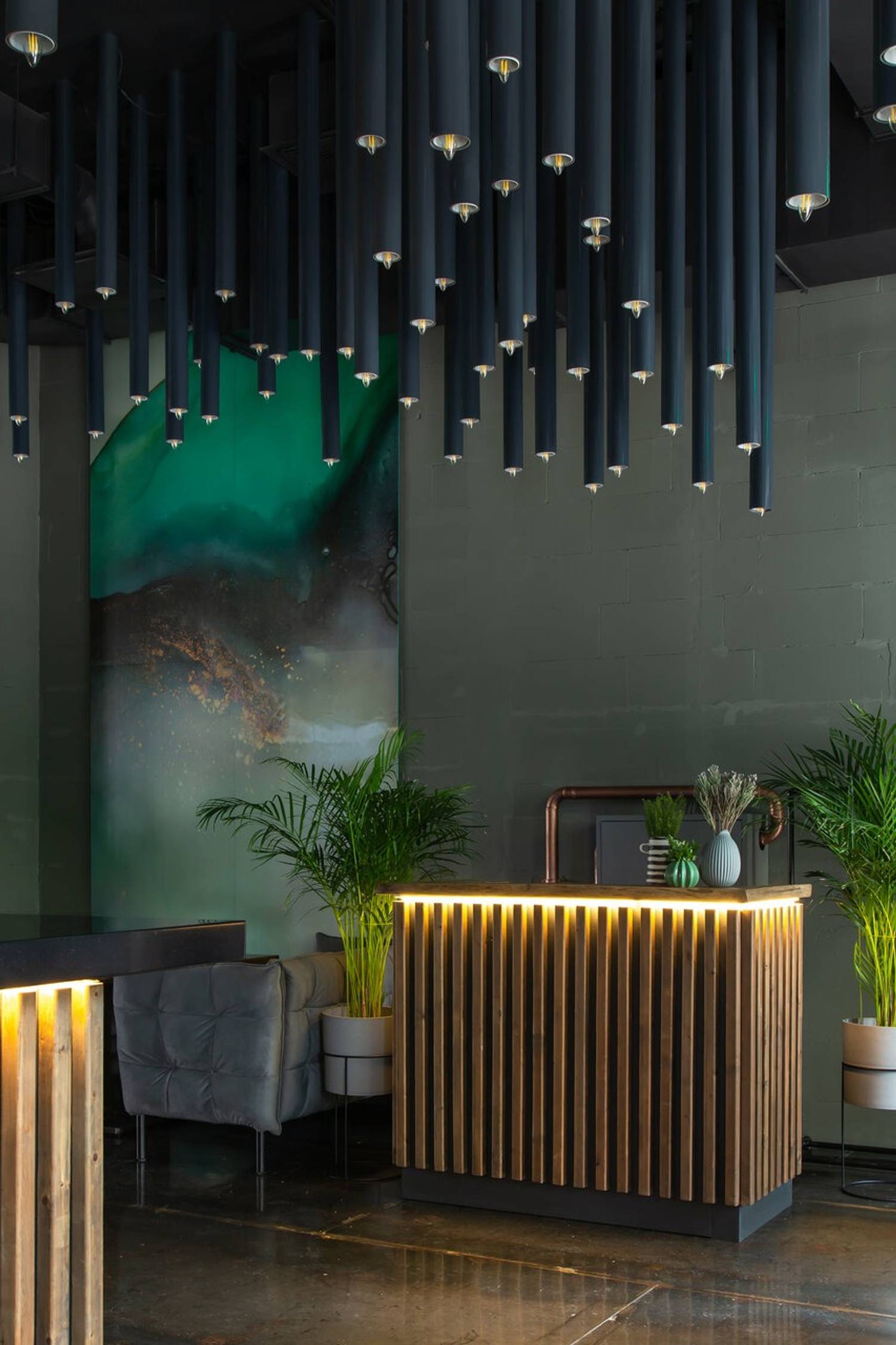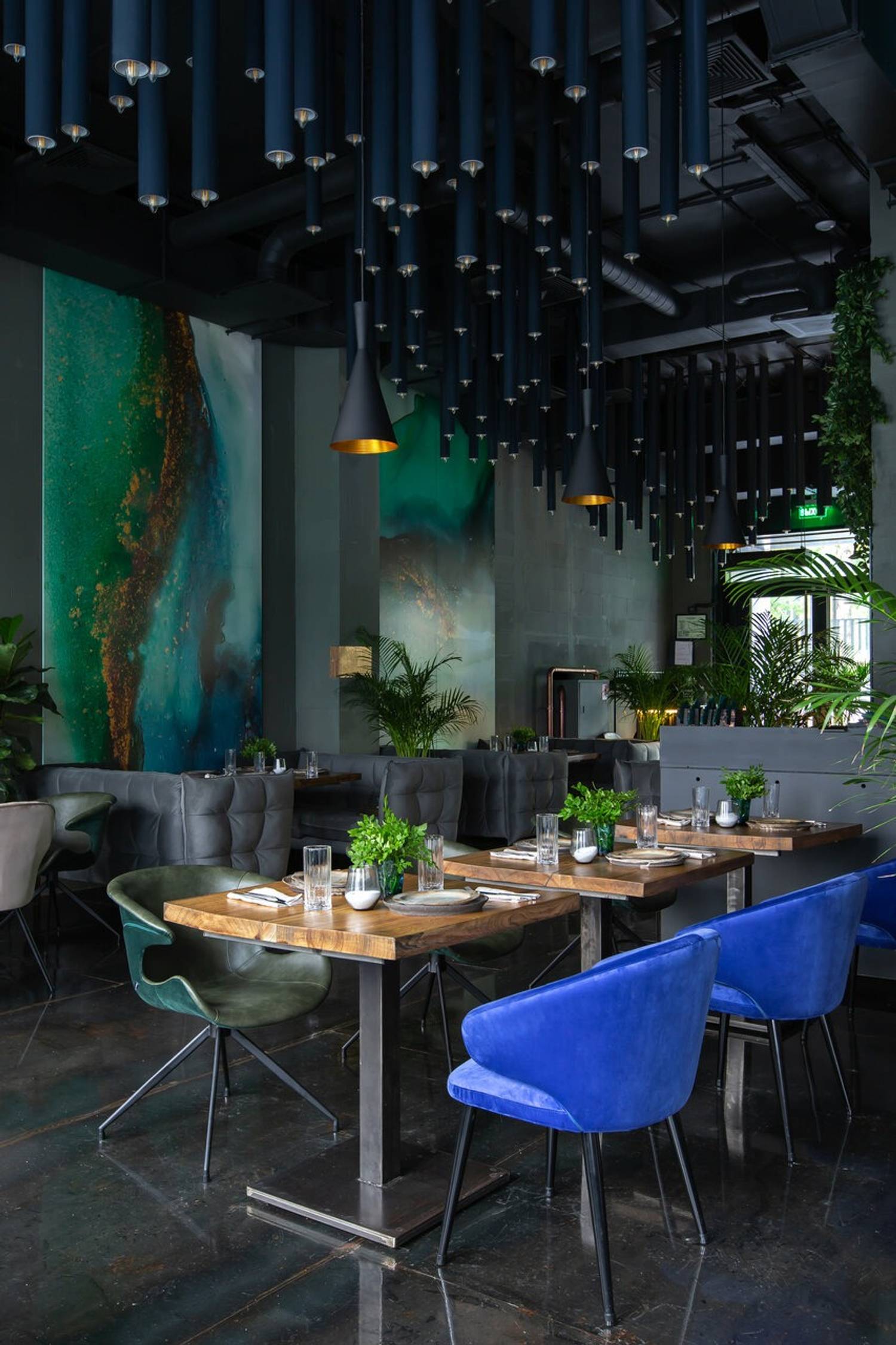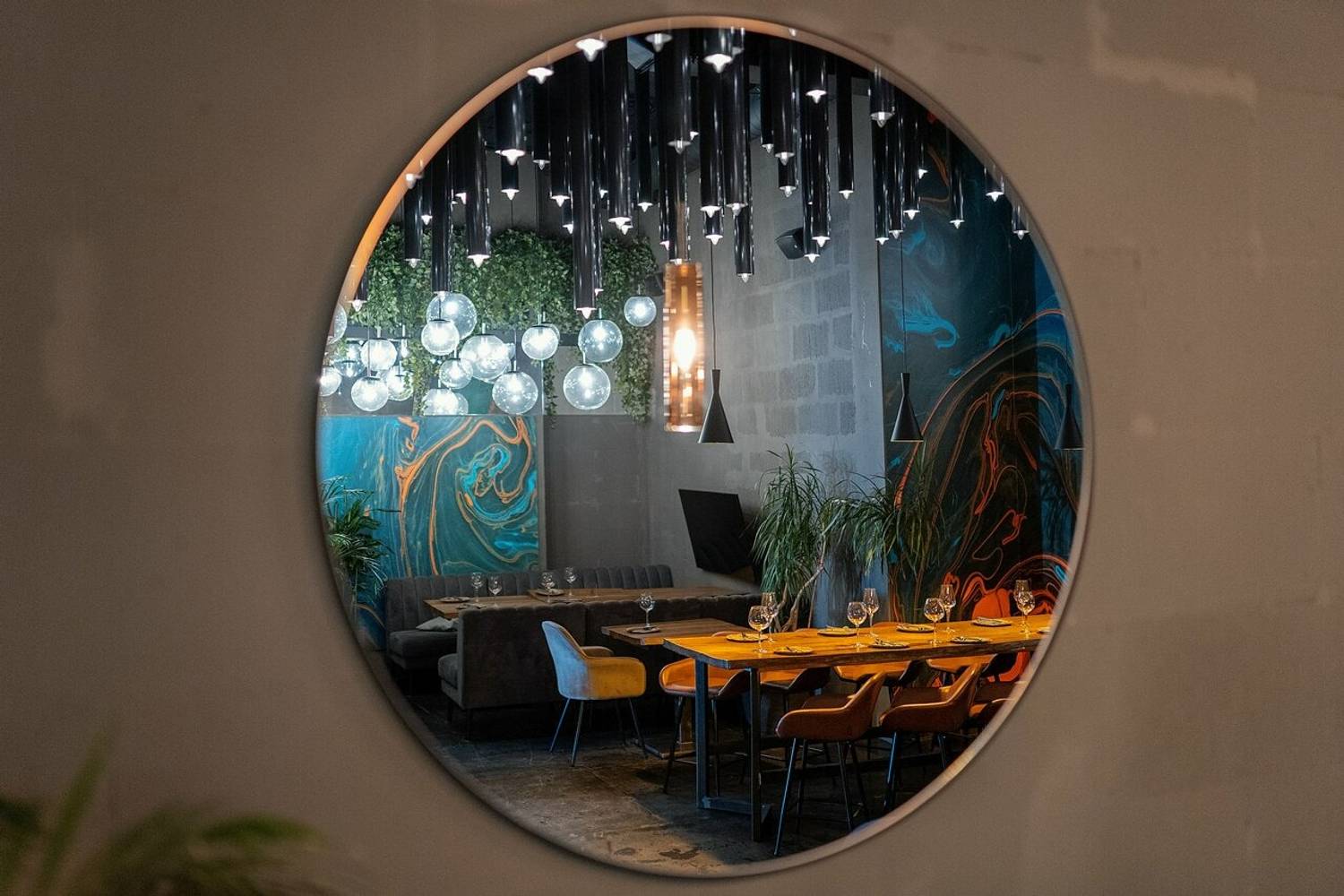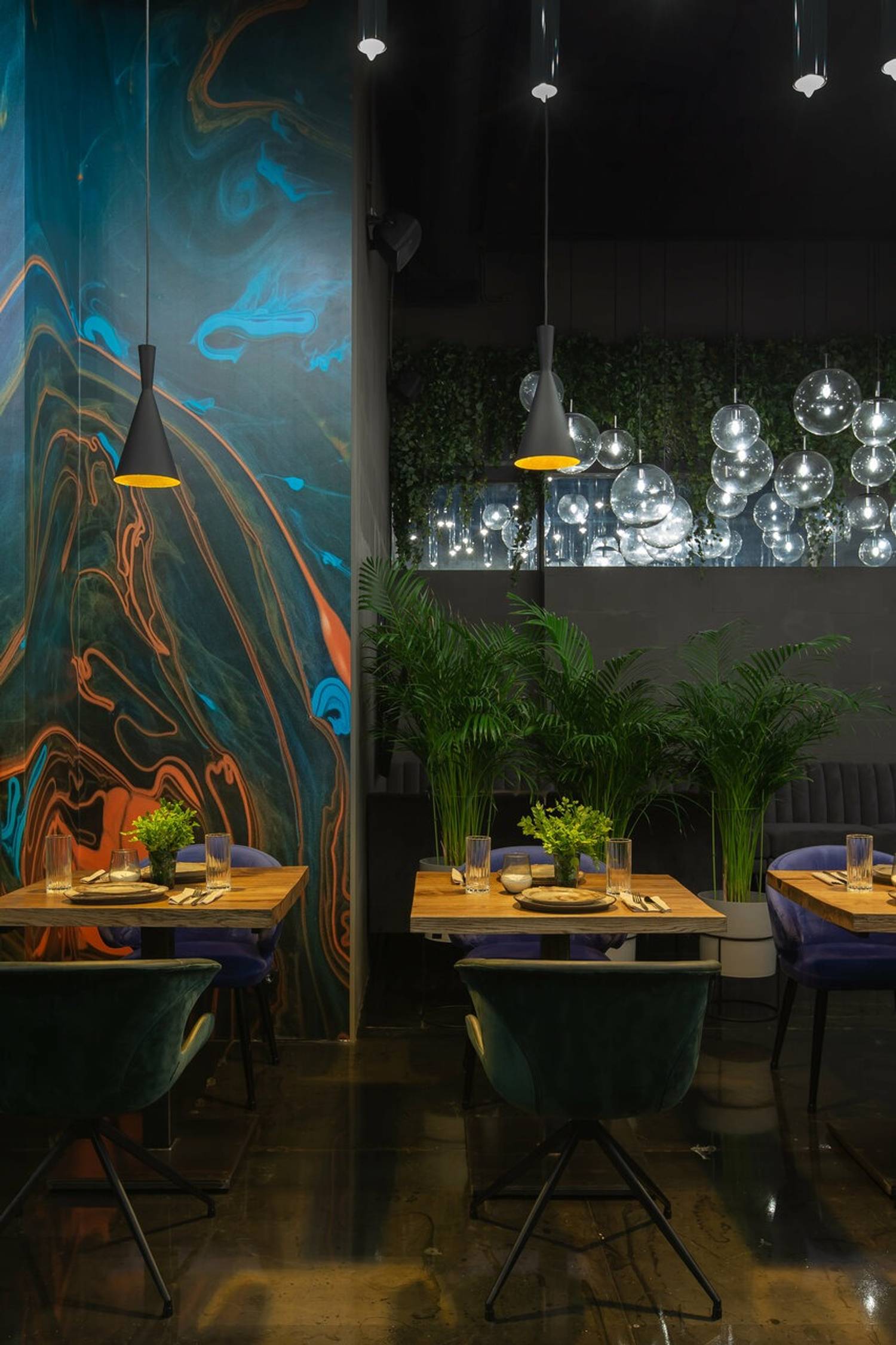 Атмосфера. Внутри стиль фьюжн-лофта: фактурные темно-серые стены, круглые зеркала, цветная мраморная стена и абстрактные картины, а футуристичные люстры из тонких черных труб подчеркивают современный стиль. Также можно расположиться не только за столом, но и на подоконнике, где сделали специальные посадочные места.