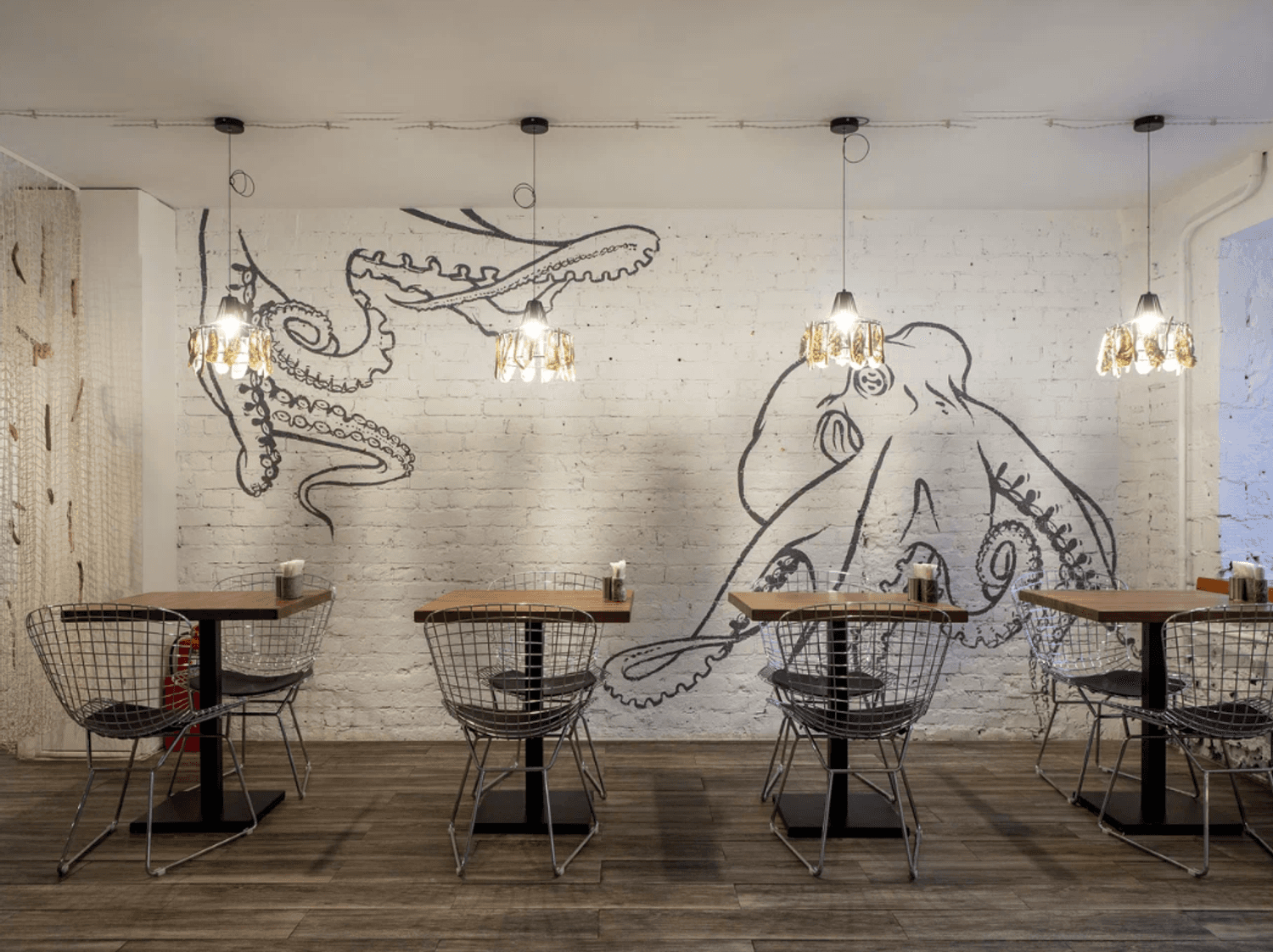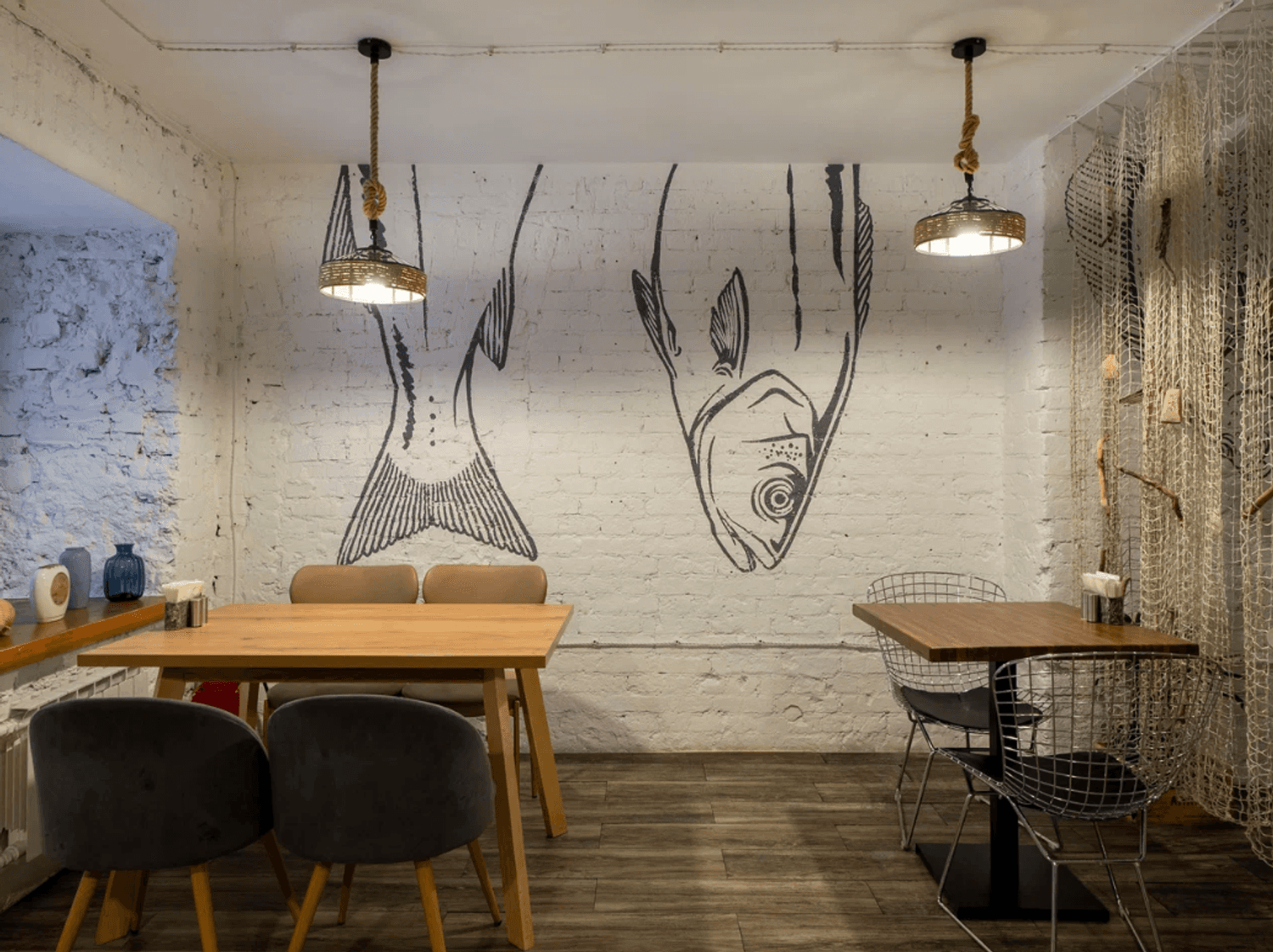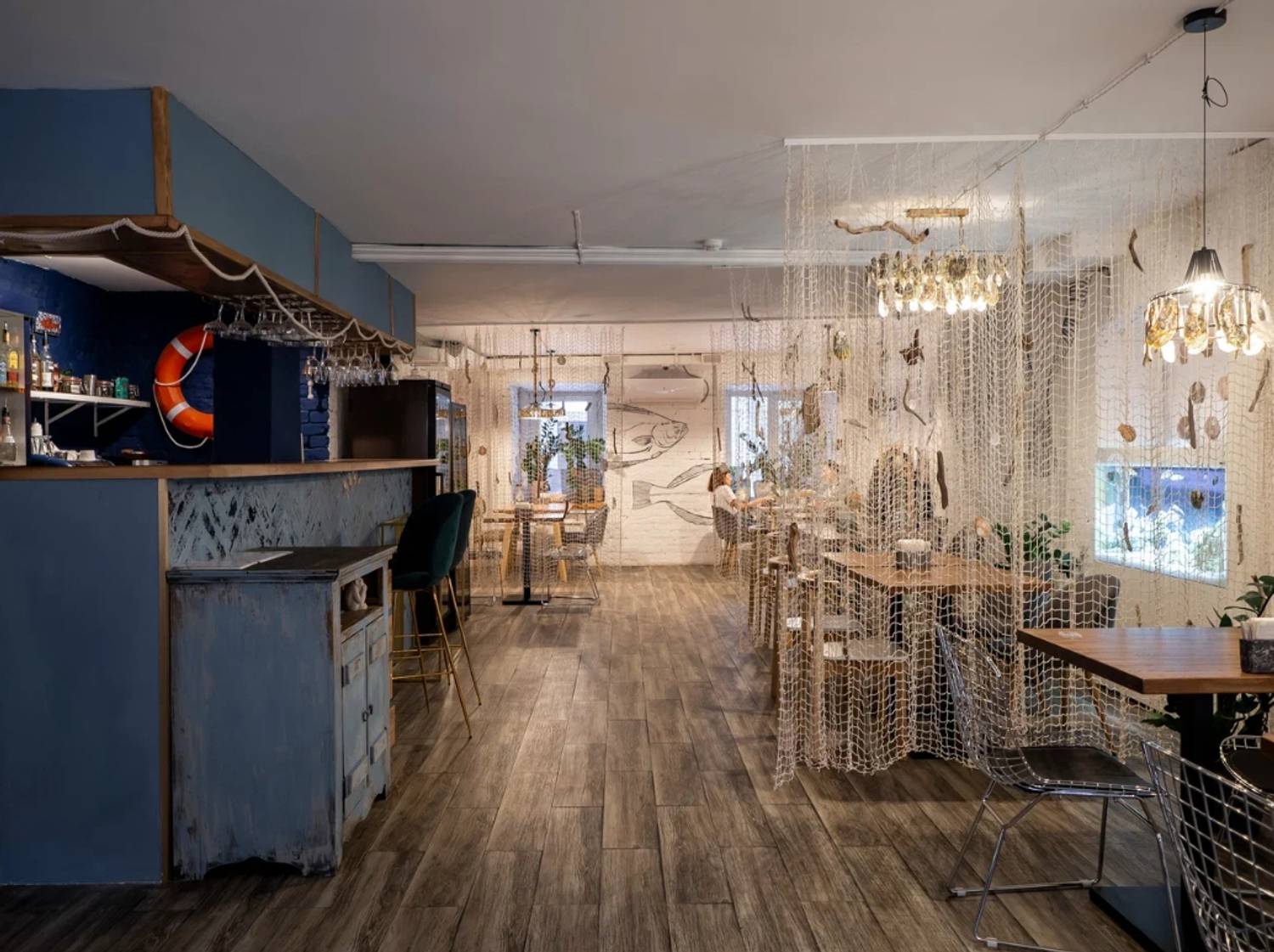 Атмосфера. Пространство с кирпичными стенами, рукотворными люстрами из раковин и графикой с морскими обитателями словно погружает в курортное настроение. Все в интерьере отсылает к морской тематике: светлые залы в сине-белой гамме, рыболовные сети, росписи на стенах в виде рыб и даже официанты в тельняшках. Сочетание оформления, атрибутики и меню создает ощущение, что вы оказались в гостях у друзей где-то у моря.