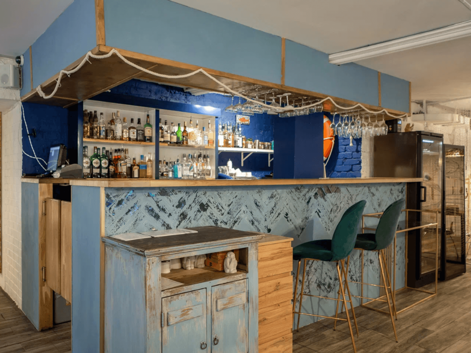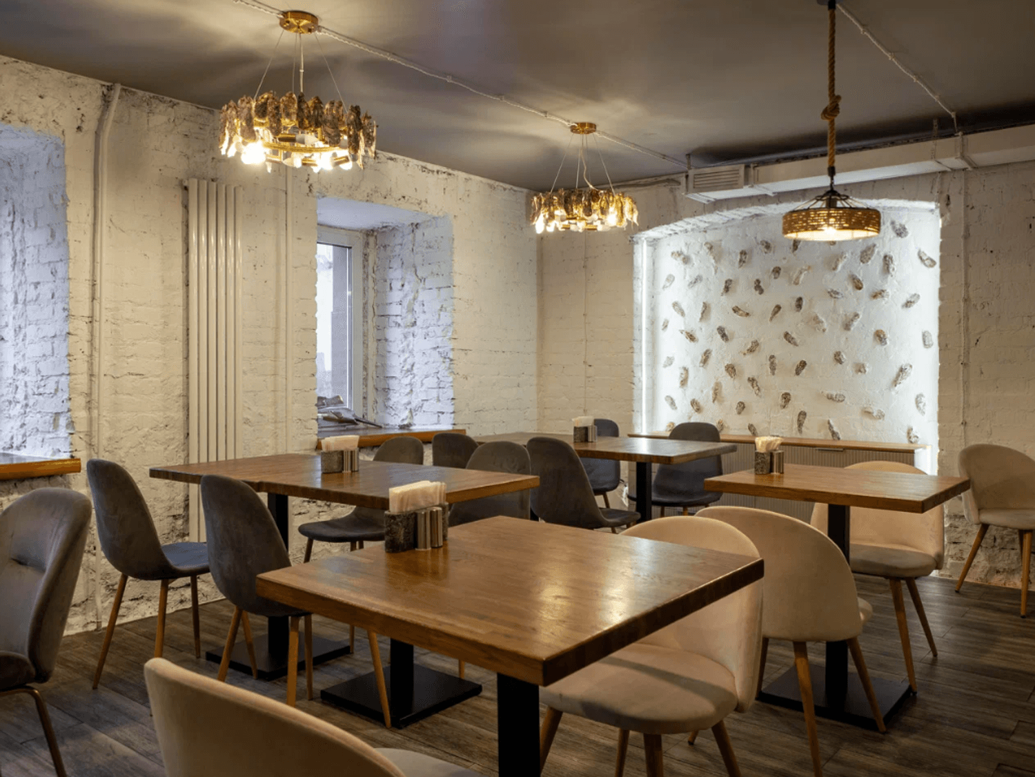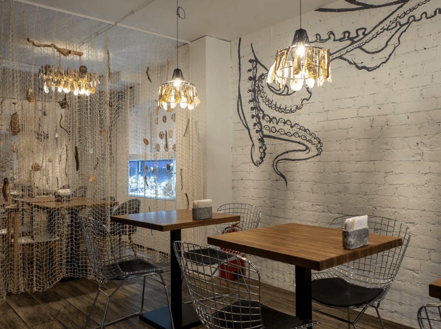 Атмосфера. Пространство с кирпичными стенами, рукотворными люстрами из раковин и графикой с морскими обитателями словно погружает в курортное настроение. Все в интерьере отсылает к морской тематике: светлые залы в сине-белой гамме, рыболовные сети, росписи на стенах в виде рыб и даже официанты в тельняшках. Сочетание оформления, атрибутики и меню создает ощущение, что вы оказались в гостях у друзей где-то у моря.