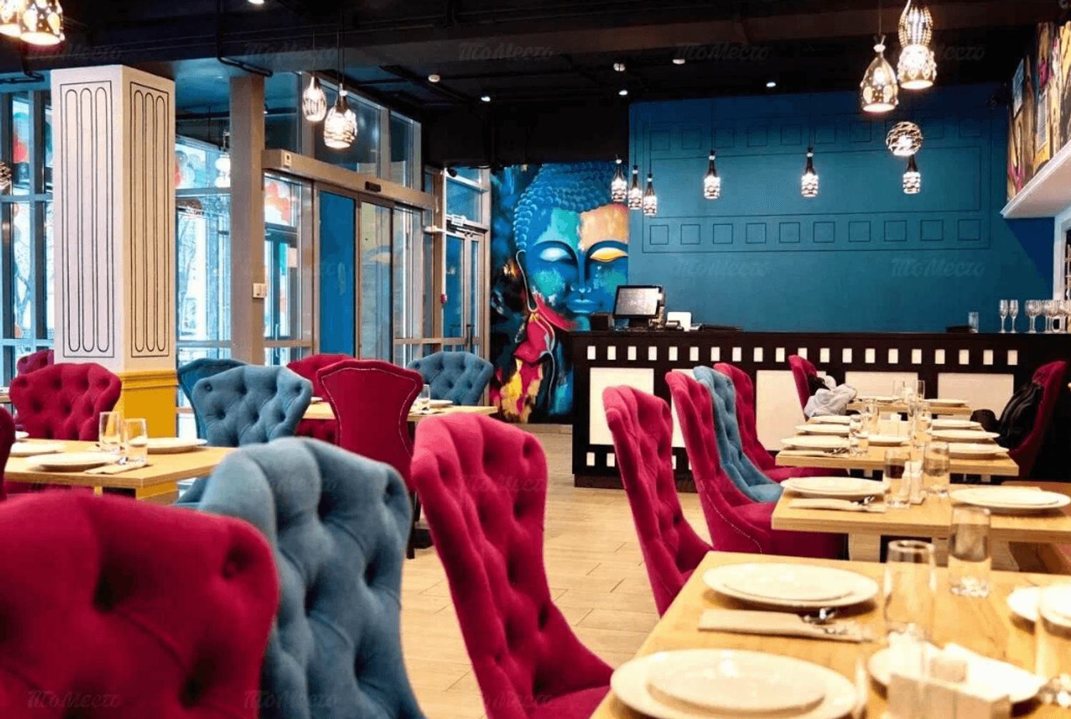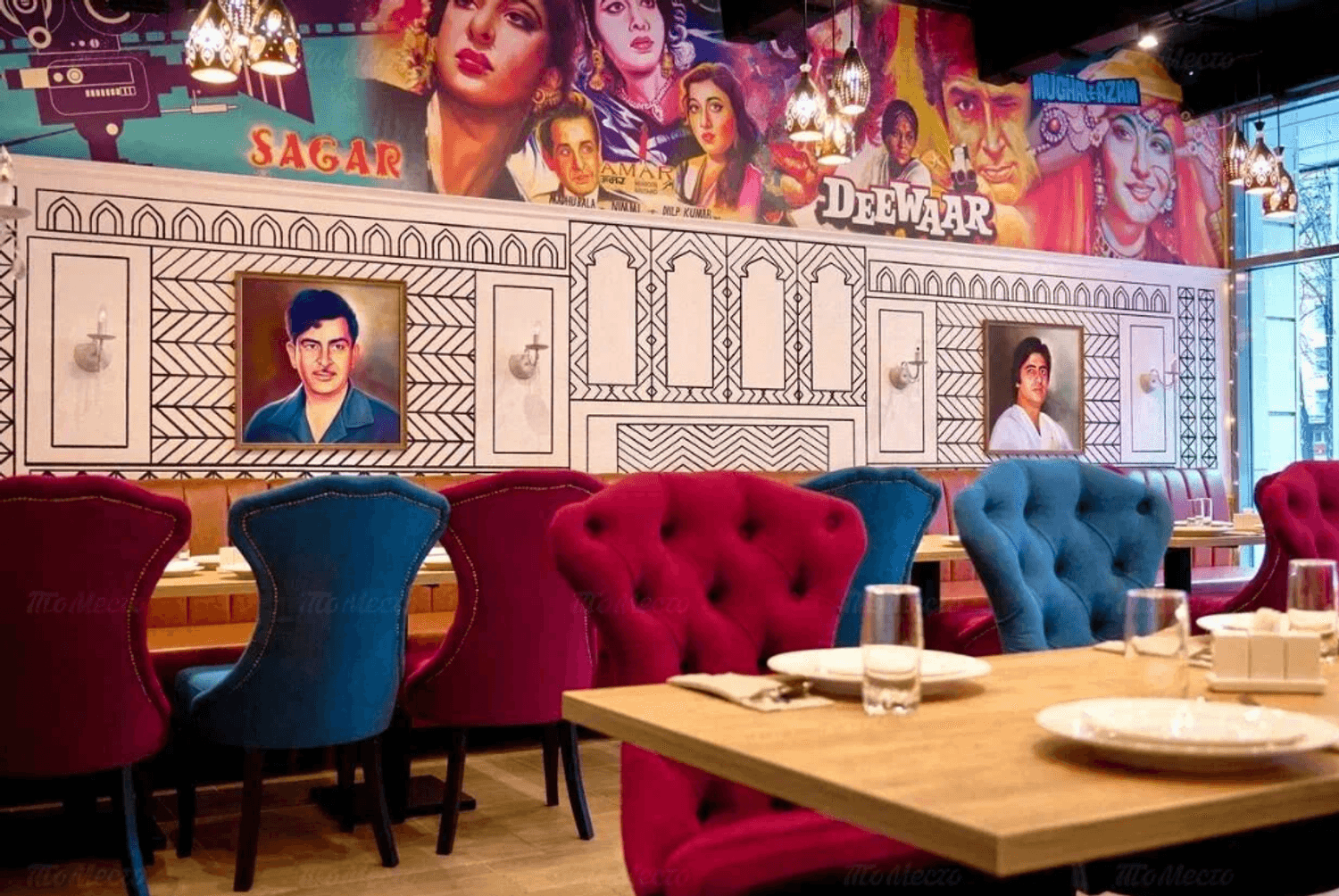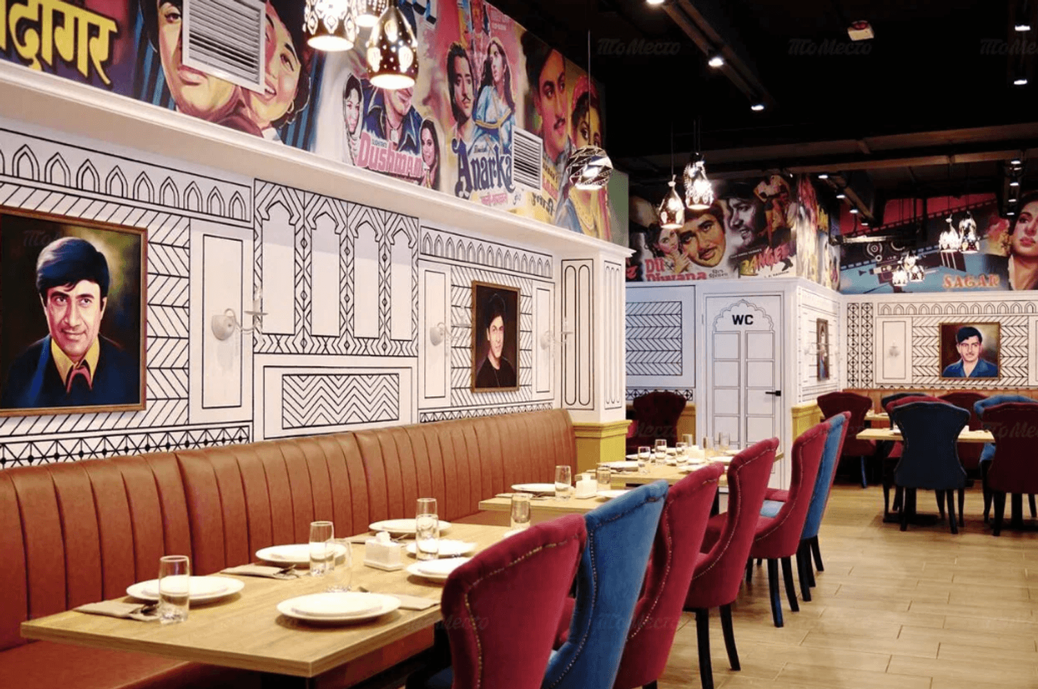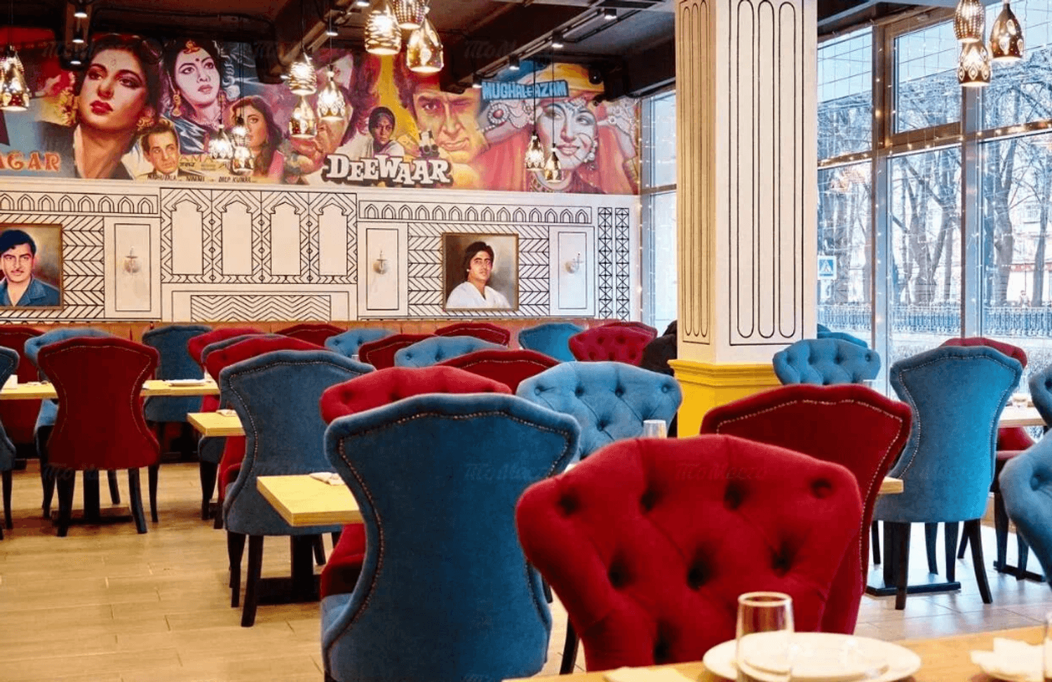 Атмосфера. Интерьер напоминает съемочную площадку: высокие потолки с росписями на тему Болливуда, портреты индийских актеров и яркая мебель. В зале установлены кожаные диваны и бархатные кресла в насыщенных оттенках, создающие атмосферу восточной роскоши.