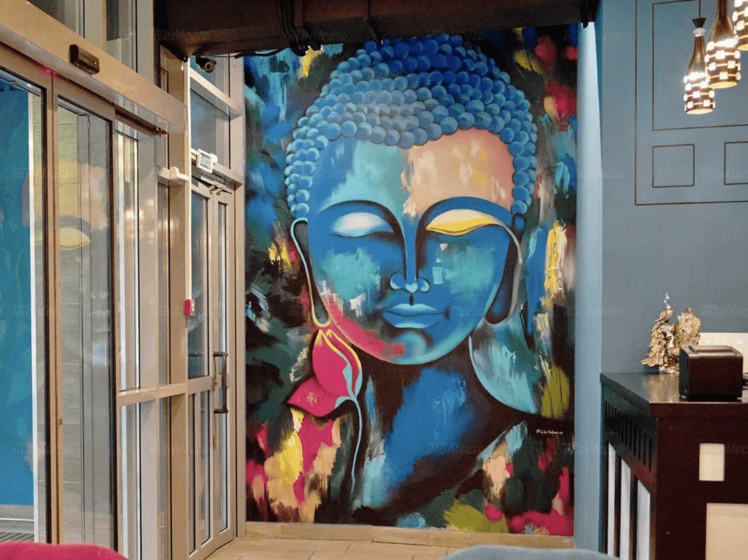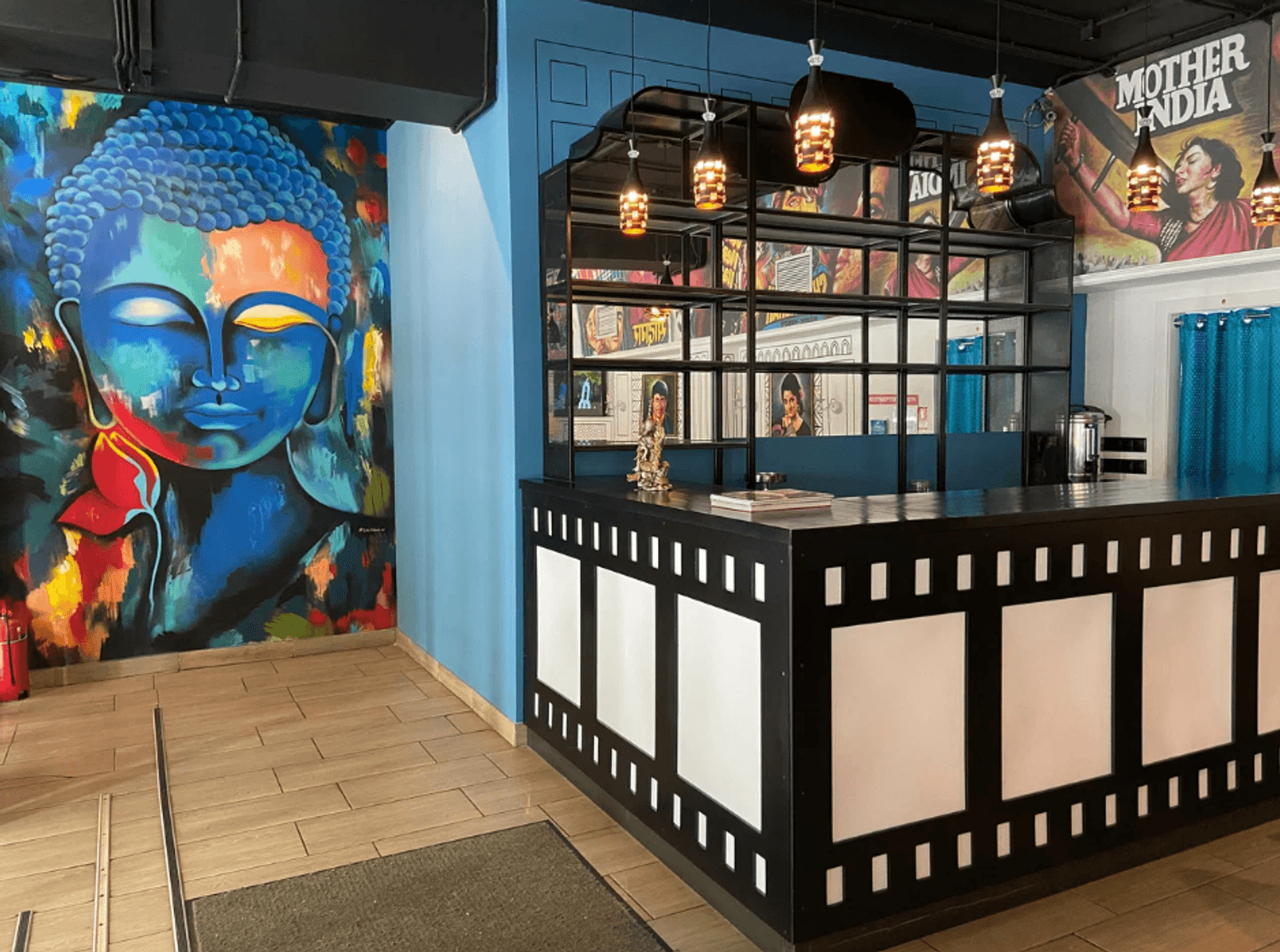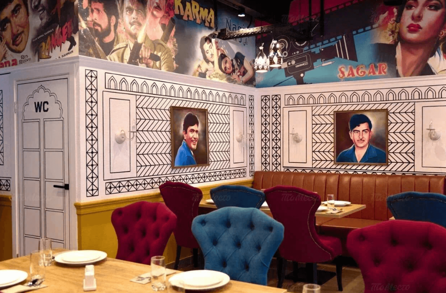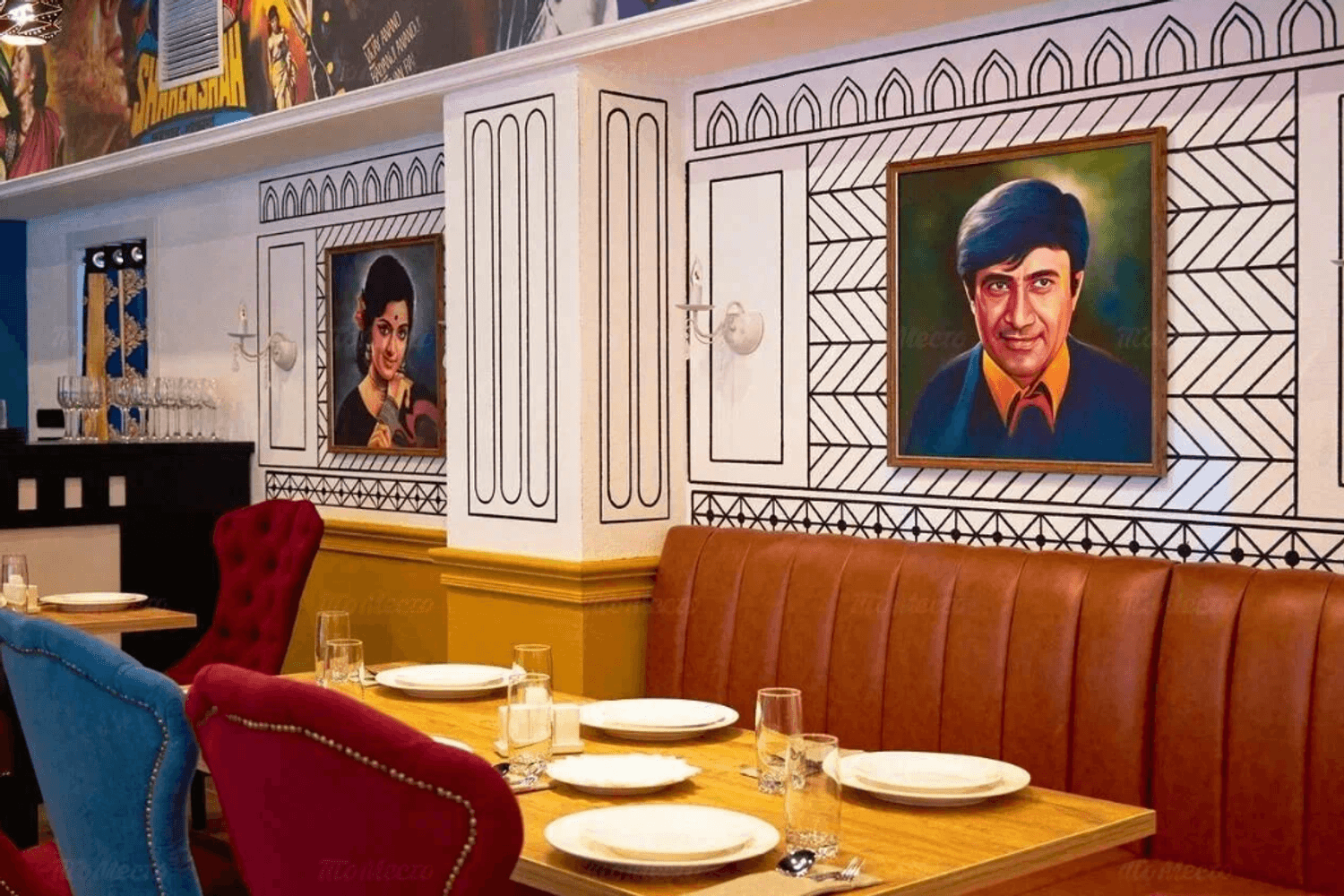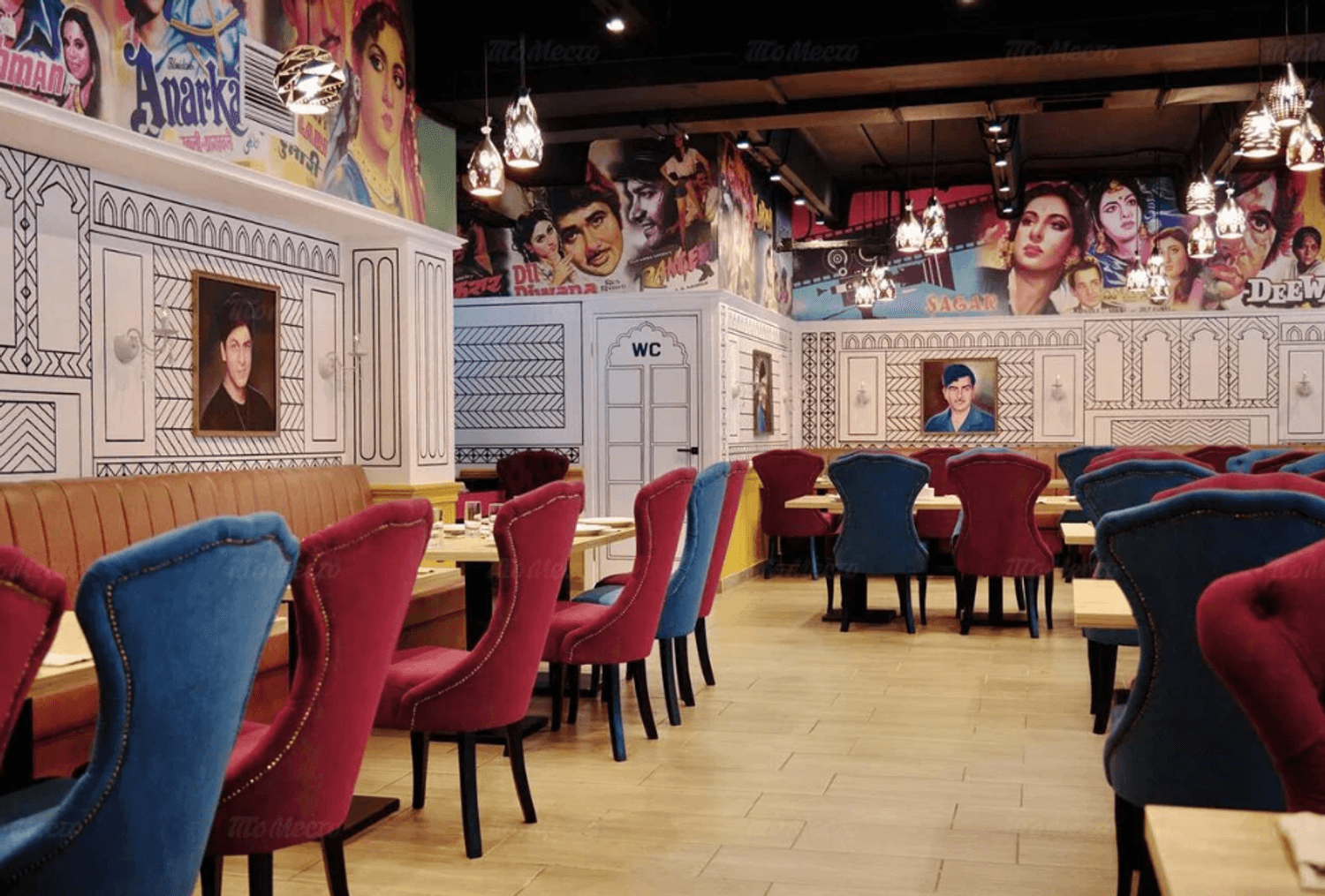Атмосфера. Интерьер напоминает съемочную площадку: высокие потолки с росписями на тему Болливуда, портреты индийских актеров и яркая мебель. В зале установлены кожаные диваны и бархатные кресла в насыщенных оттенках, создающие атмосферу восточной роскоши.