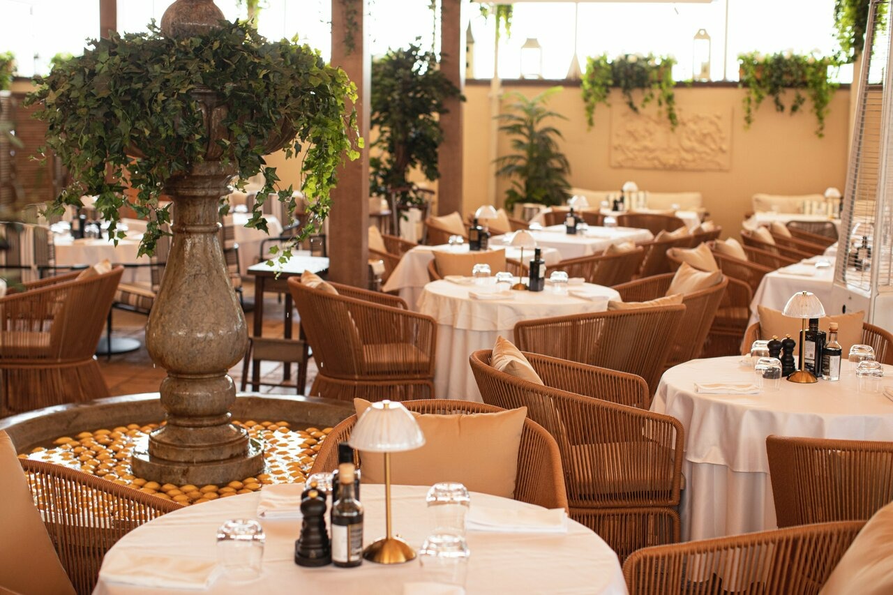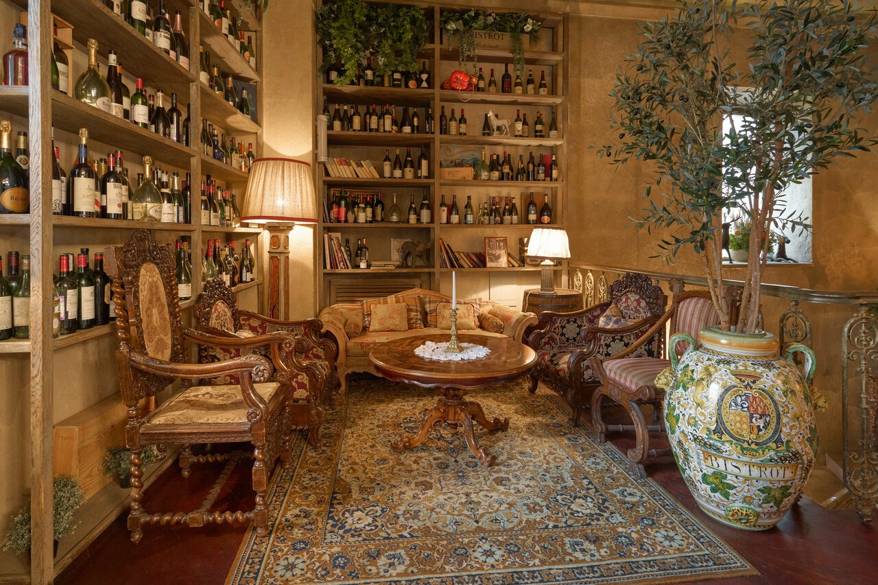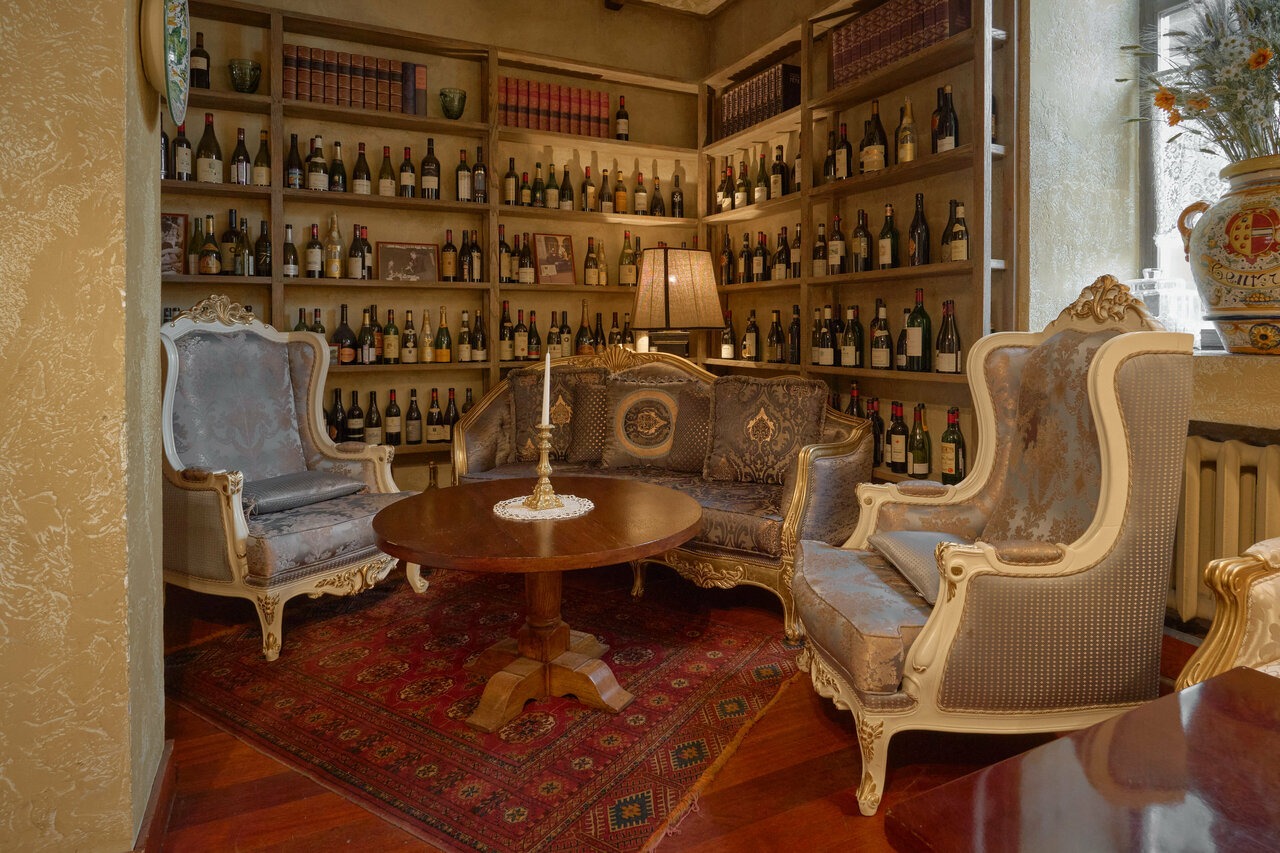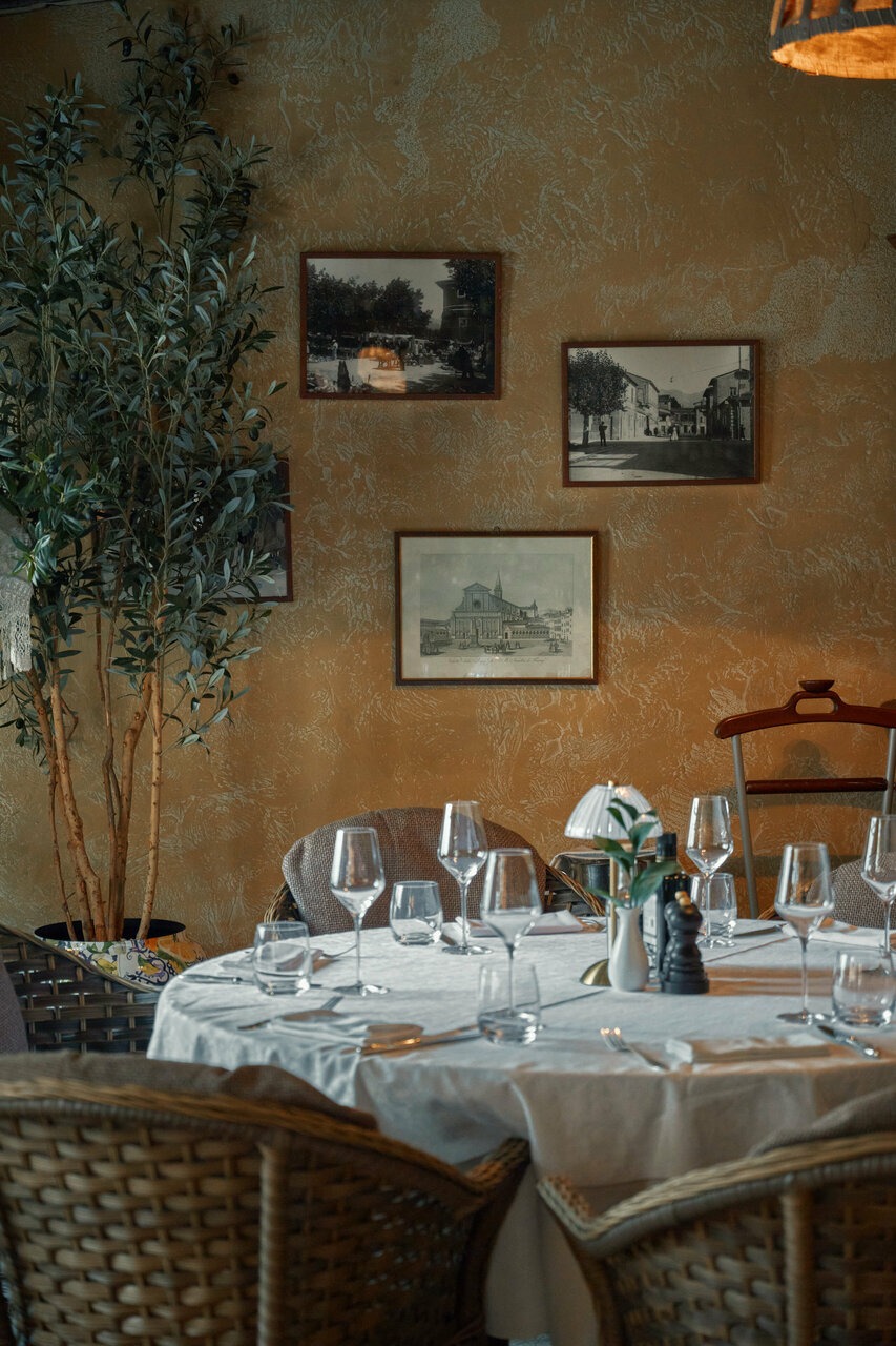 Атмосфера. Здесь все отсылает к итальянской атмосфере: арочные окна, камины, дубовые буфеты и антикварная мебель. Пространство дополняют винтажные детали — узорчатые занавески, плетеные стулья, шкафы с книгами и винами, черно-белые картины в деревянных рамах и дровяная печь. Летом открывается патио с фонтаном и веранда в средиземноморском стиле.