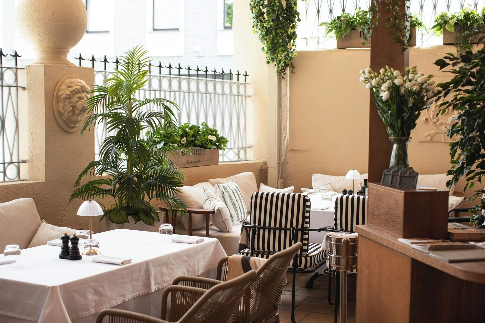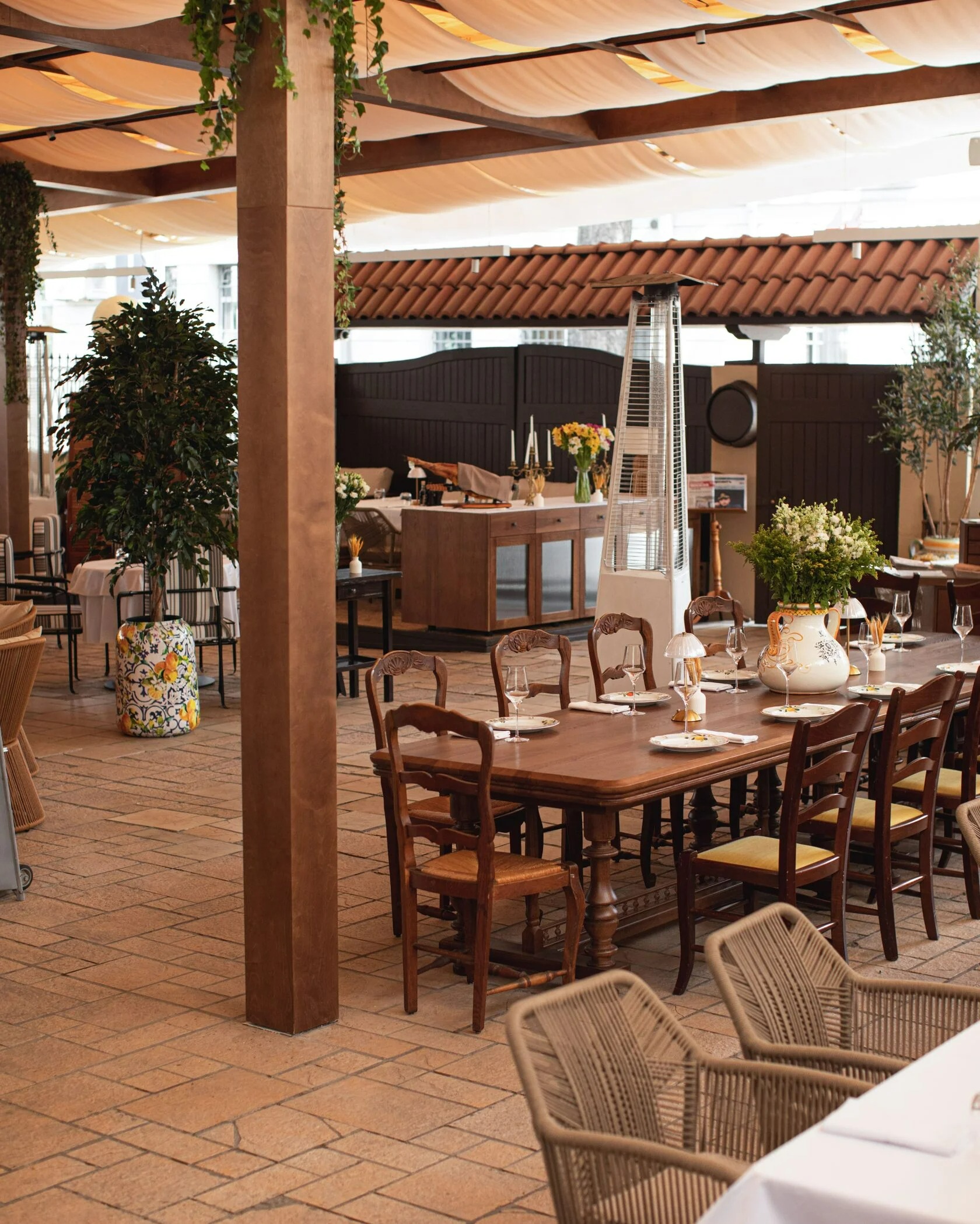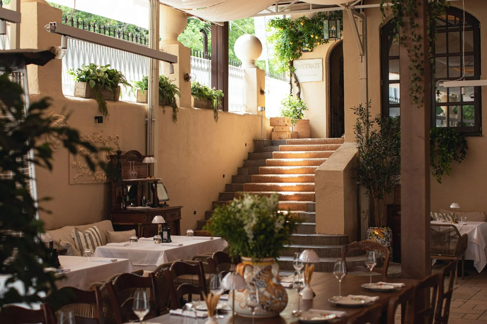 Атмосфера. Здесь все отсылает к итальянской атмосфере: арочные окна, камины, дубовые буфеты и антикварная мебель. Пространство дополняют винтажные детали — узорчатые занавески, плетеные стулья, шкафы с книгами и винами, черно-белые картины в деревянных рамах и дровяная печь. Летом открывается патио с фонтаном и веранда в средиземноморском стиле.