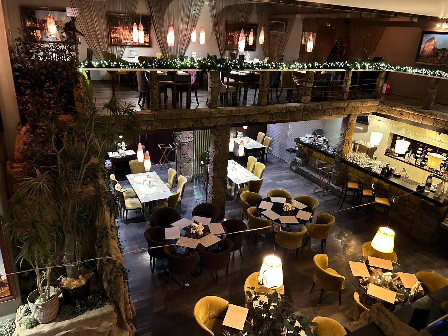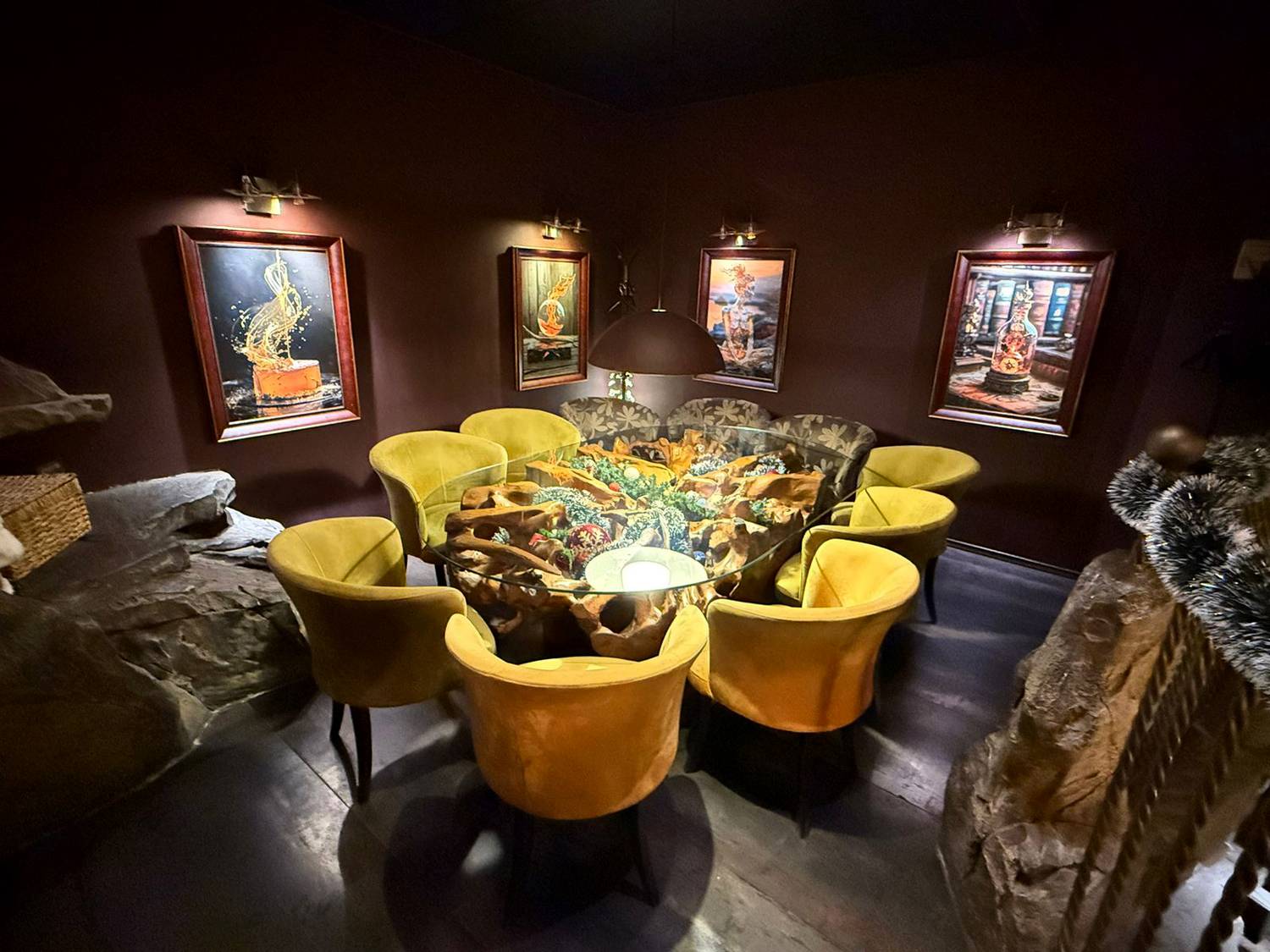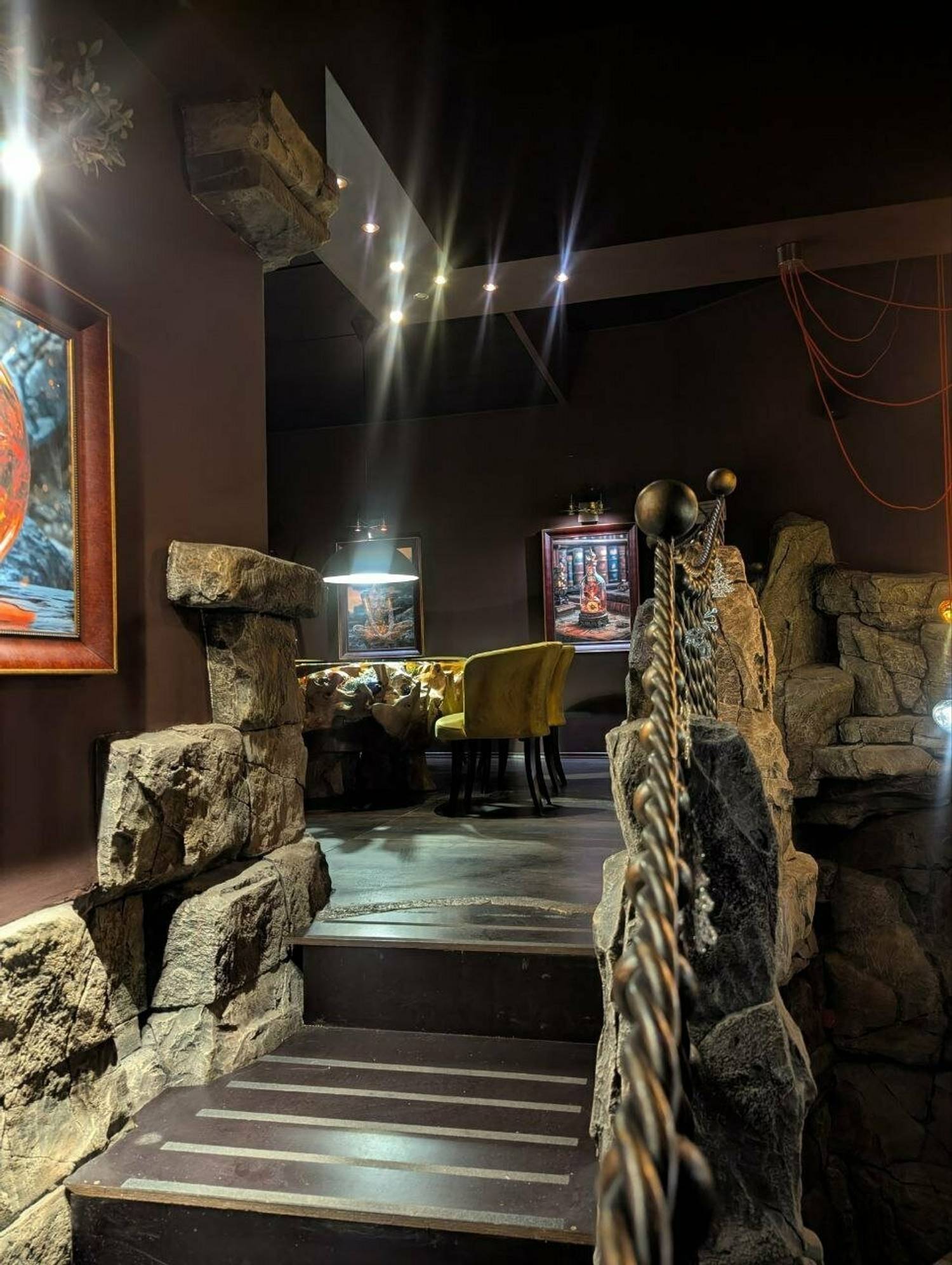 Атмосфера. Пространство с монументальной эстетикой: каменные колонны, кубообразные люстры и бассейн с декоративными каменными блоками. Даже одну из лестниц здесь оформили с перилами из каменных блоков. Также есть отдельный банкетный зал для праздников.