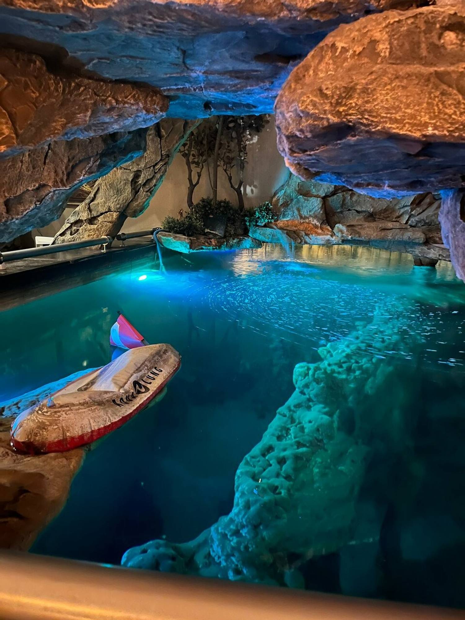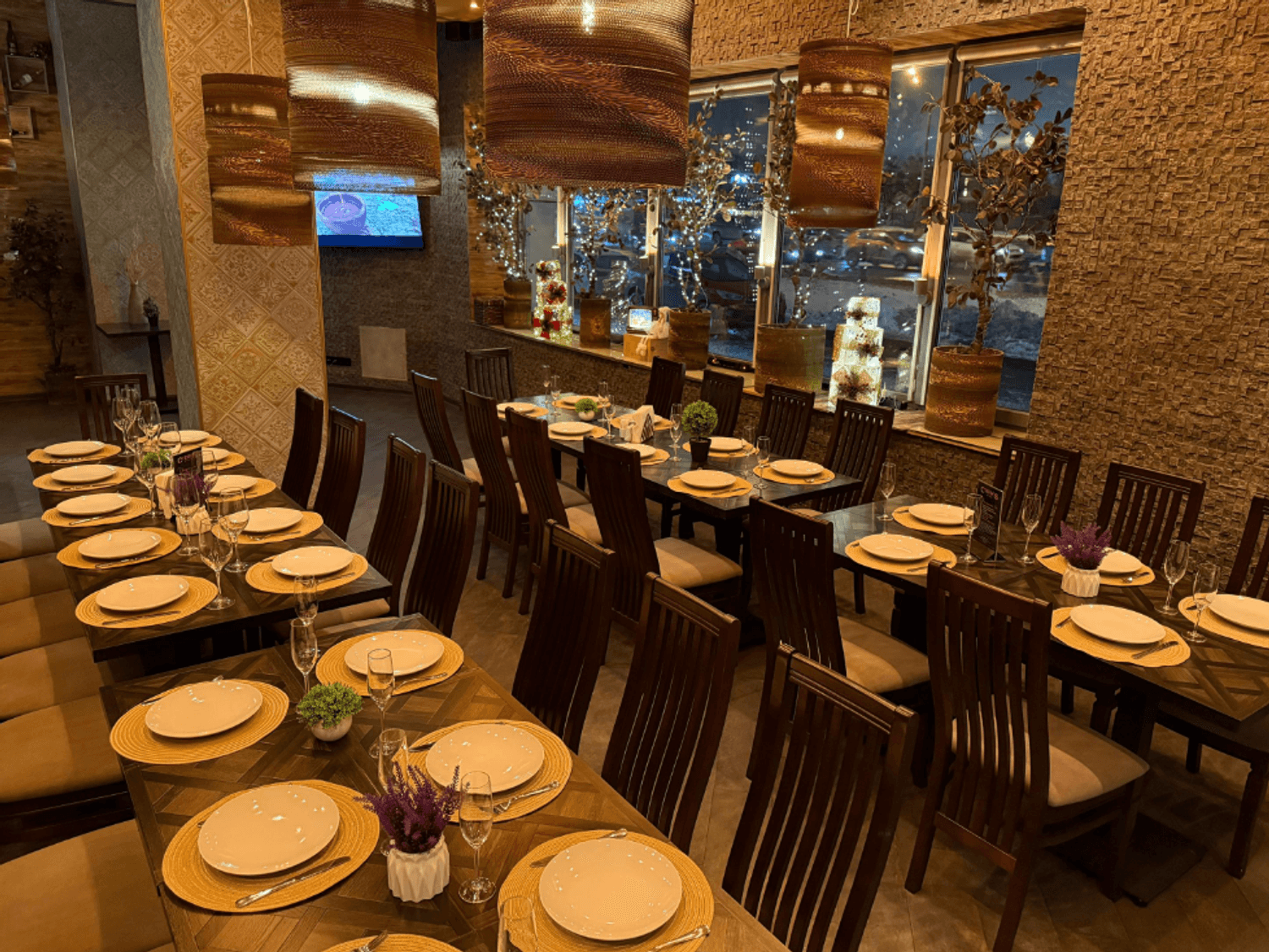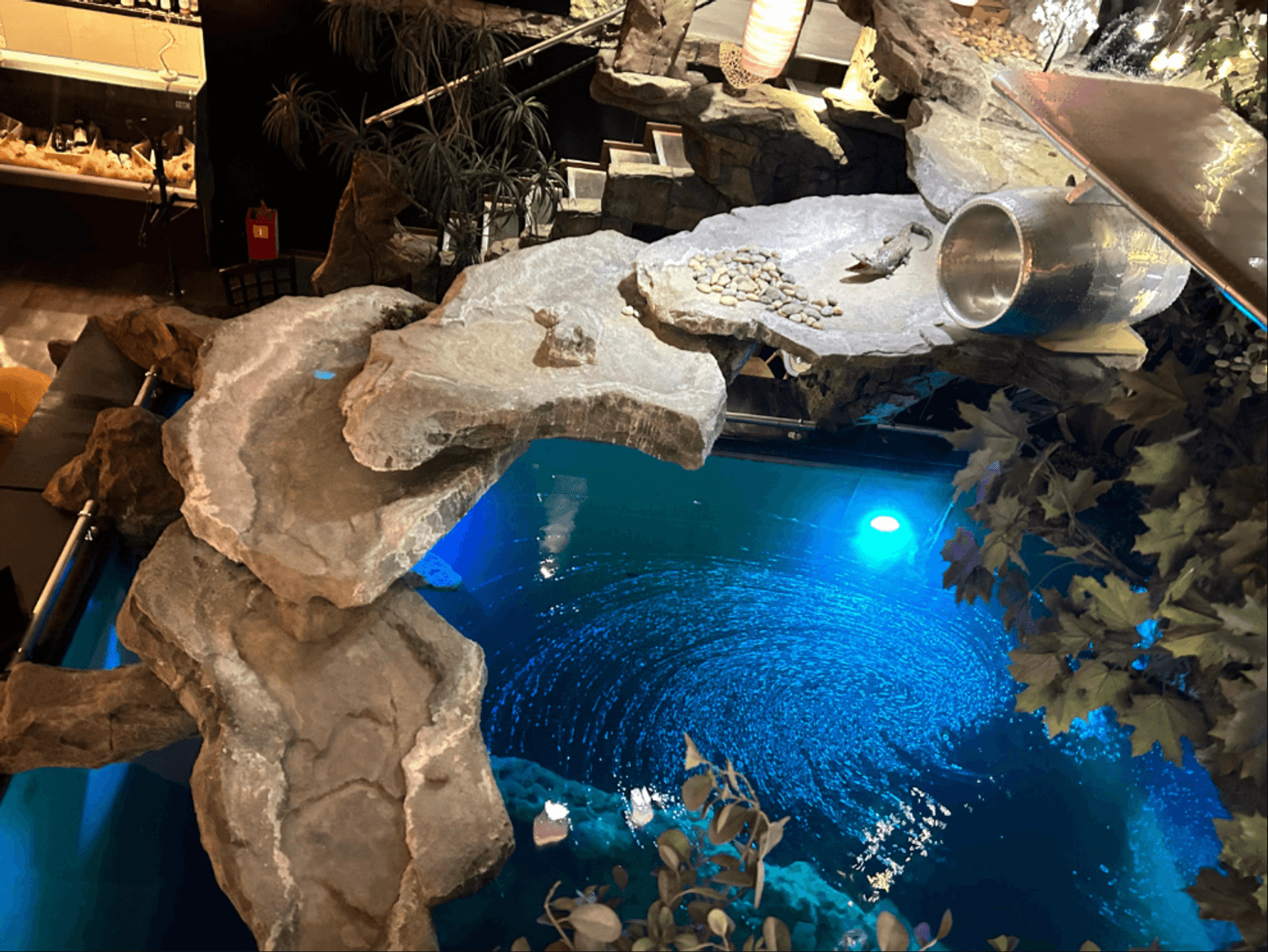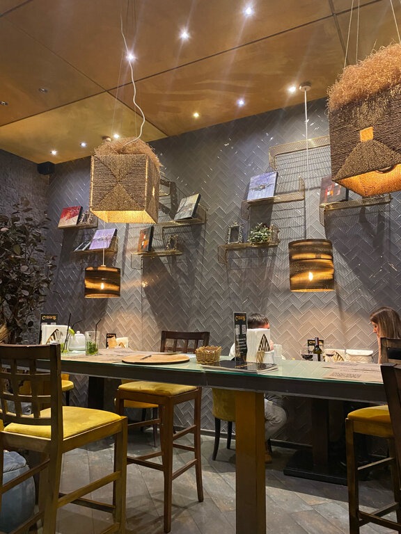 Атмосфера. Пространство с монументальной эстетикой: каменные колонны, кубообразные люстры и бассейн с декоративными каменными блоками. Даже одну из лестниц здесь оформили с перилами из каменных блоков. Также есть отдельный банкетный зал для праздников.