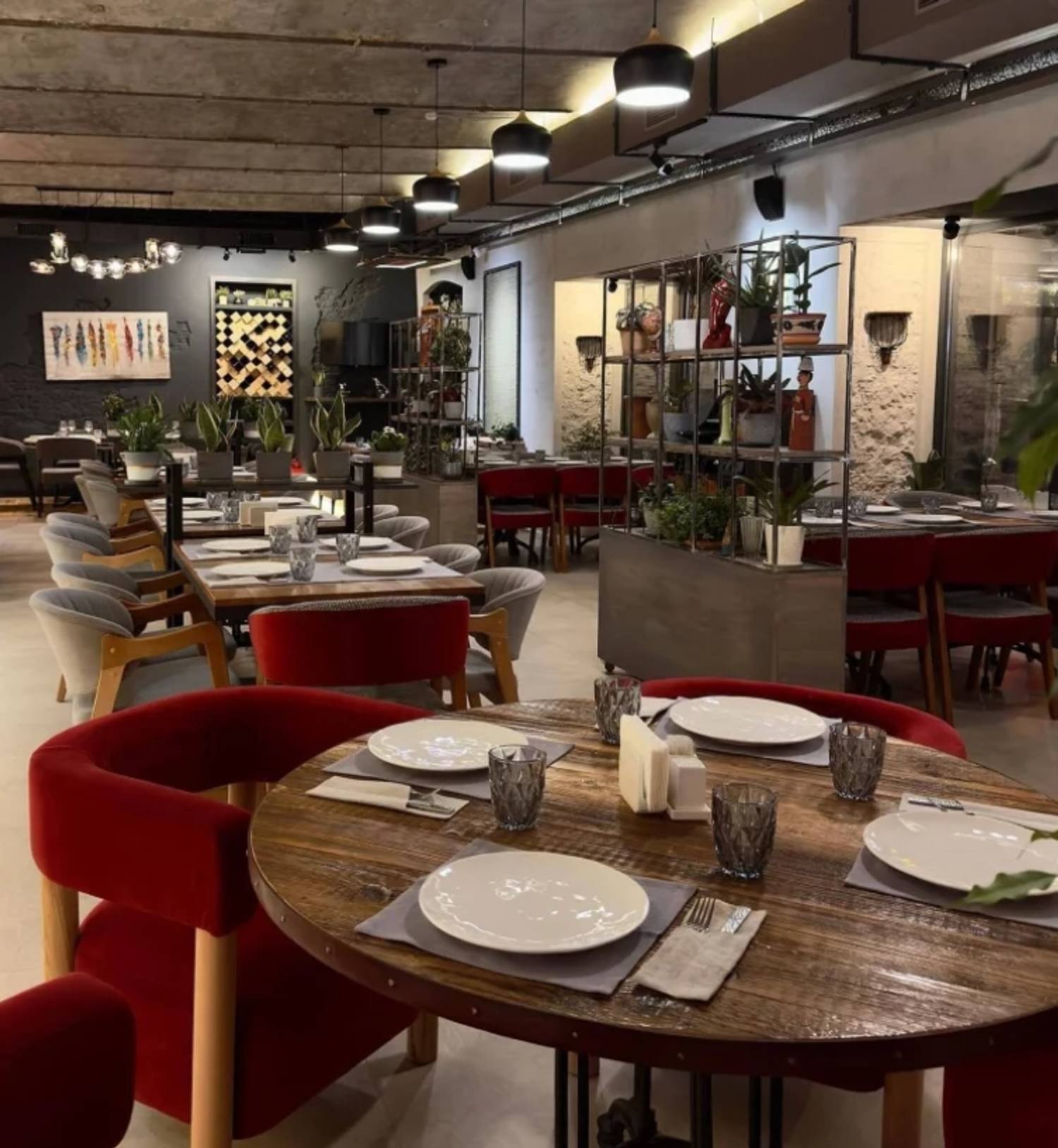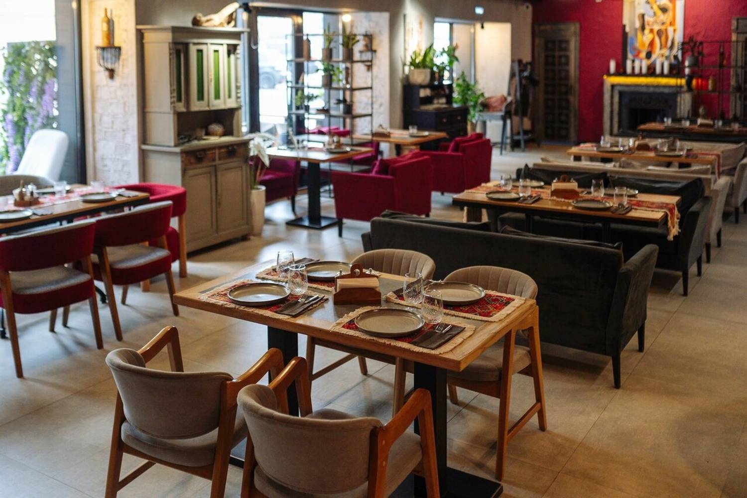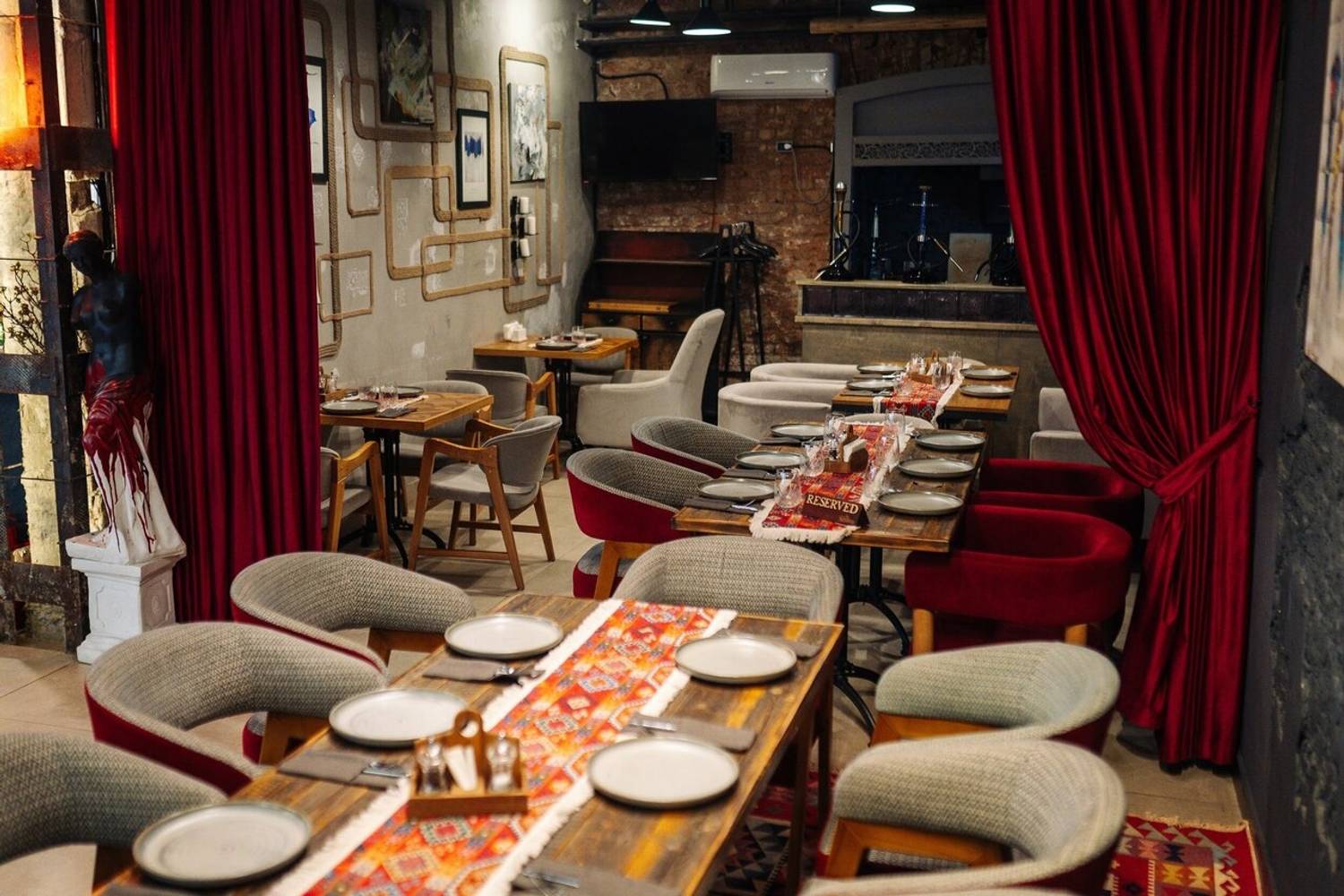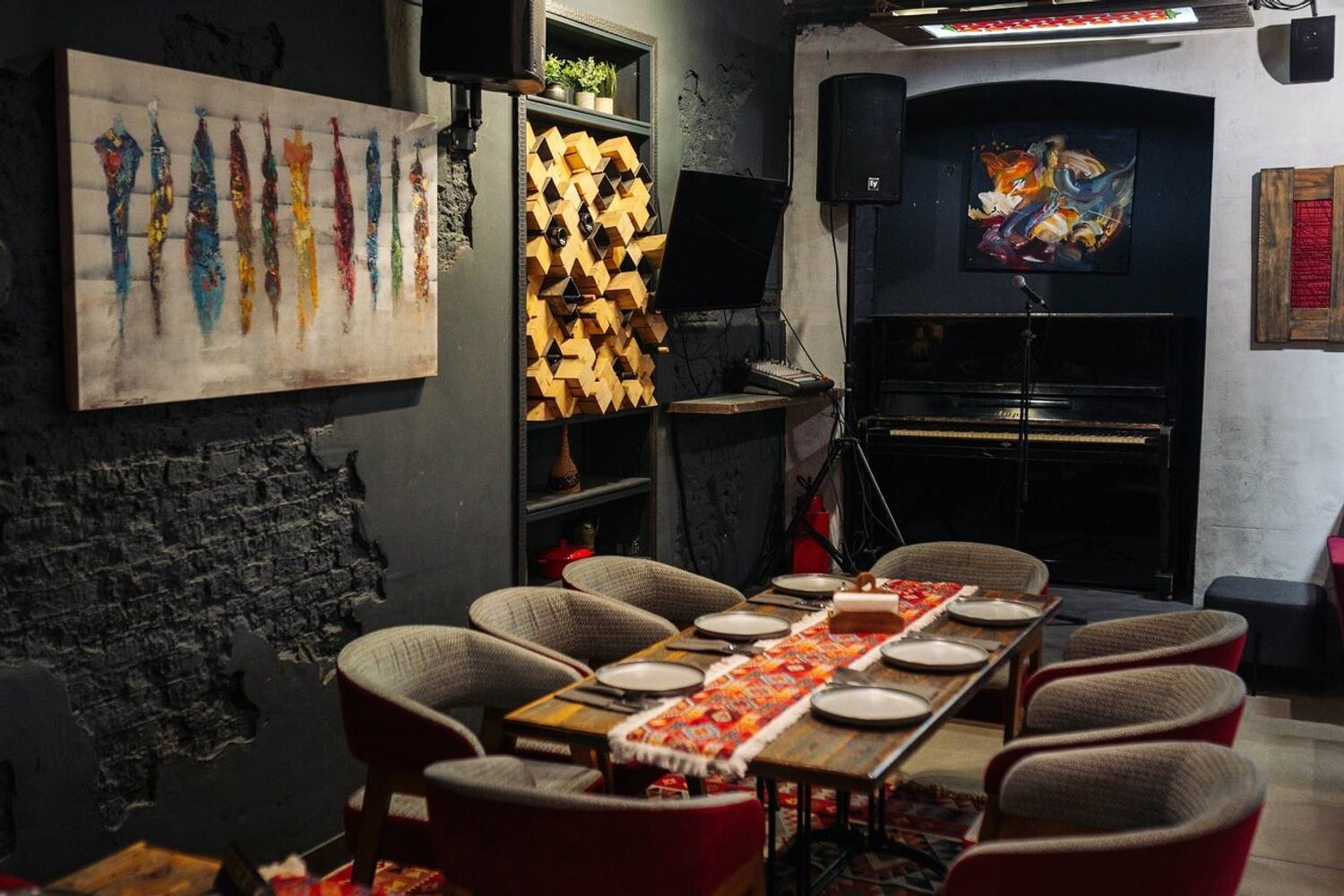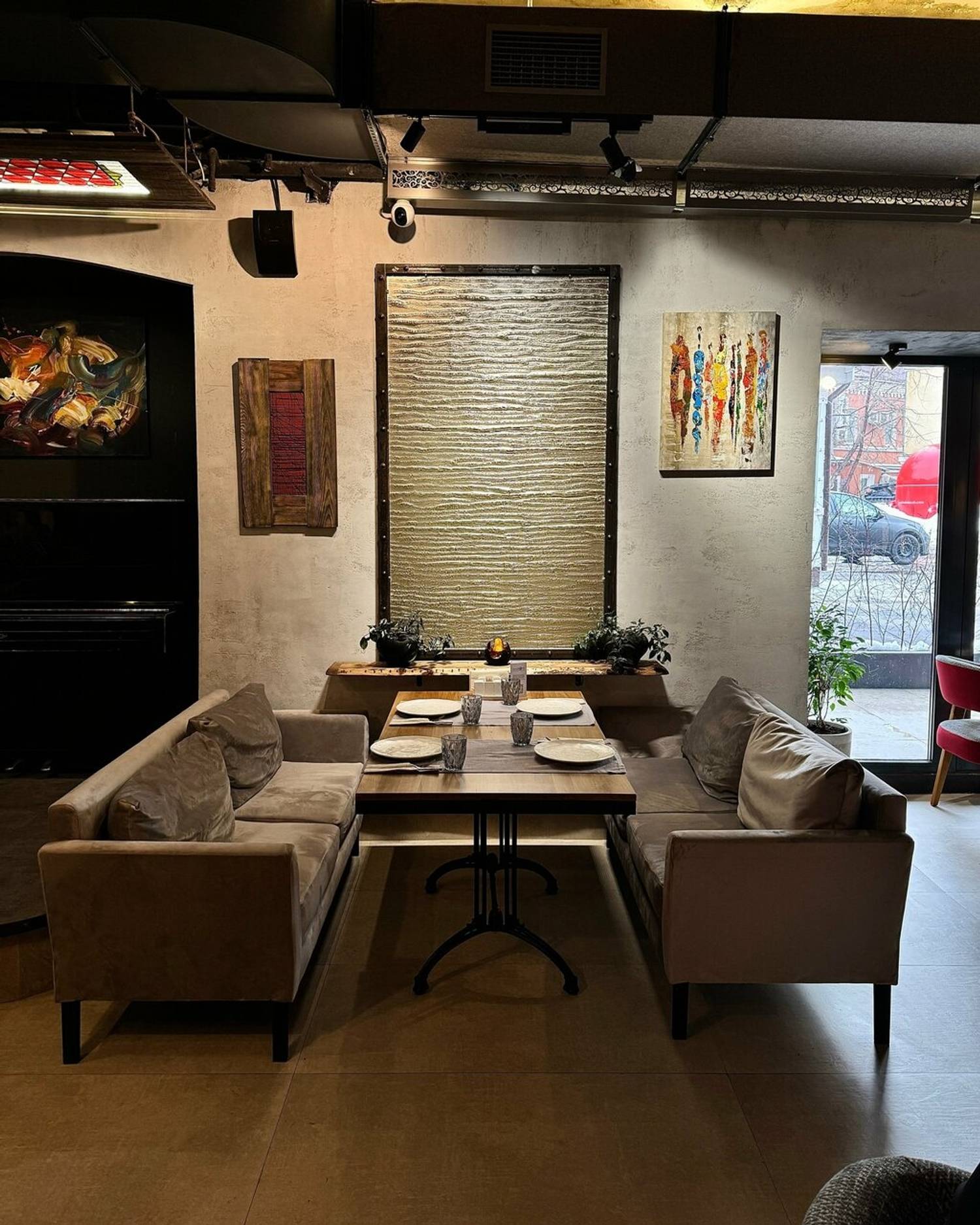 Атмосфера. Эклектичный интерьер сочетает этнические мотивы с яркими современными акцентами: декоративные панно, авангардная картина над камином и светлое пространство. Здесь не так много традиционно-грузинских элементов, но мотивы все равно прослеживаются: и в декоре, и в винно-красной мебели, и в радушной атмосфере. По вечерам в заведении звучат живые национальные мелодии, которые усиливают ощущение грузинского гостеприимства.