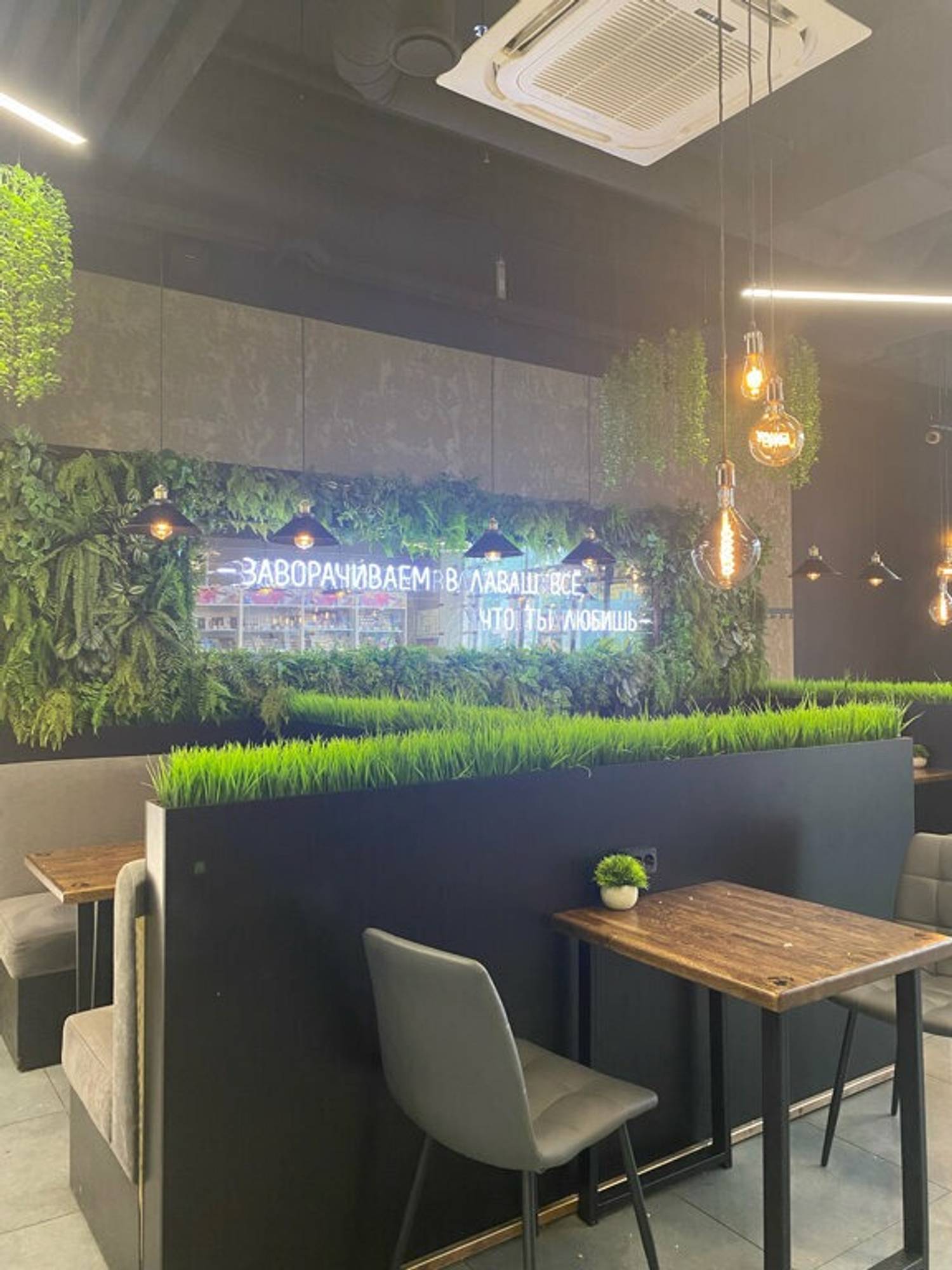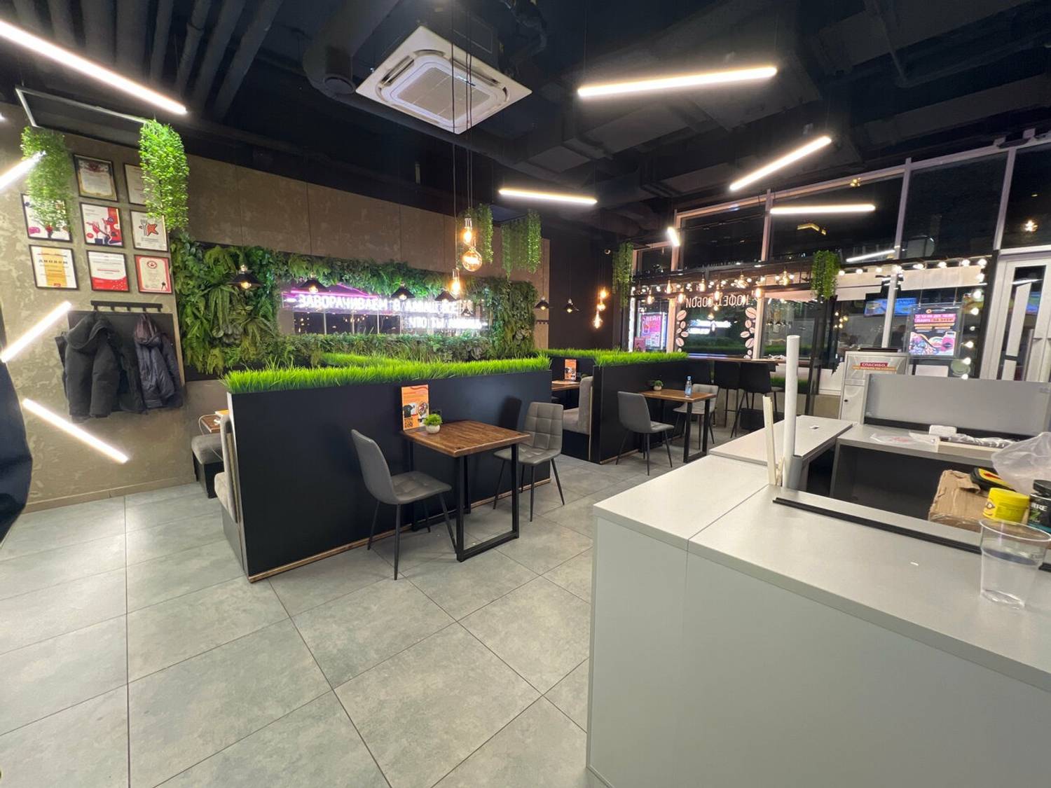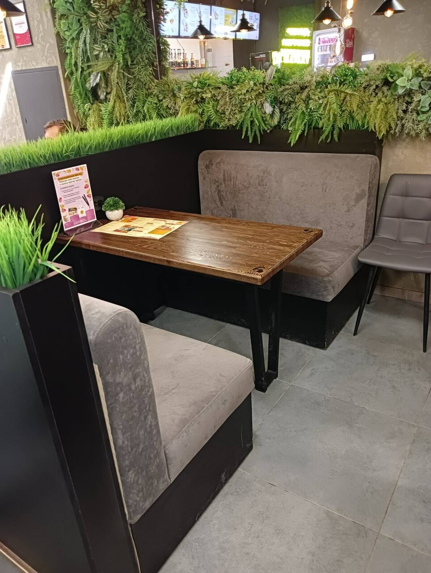 Атмосфера. Здесь серые диваны и стулья, черные панели с зелеными растениями. А также фирменная деревянная стойка с контрастными белыми полосами и динамичной подсветкой.