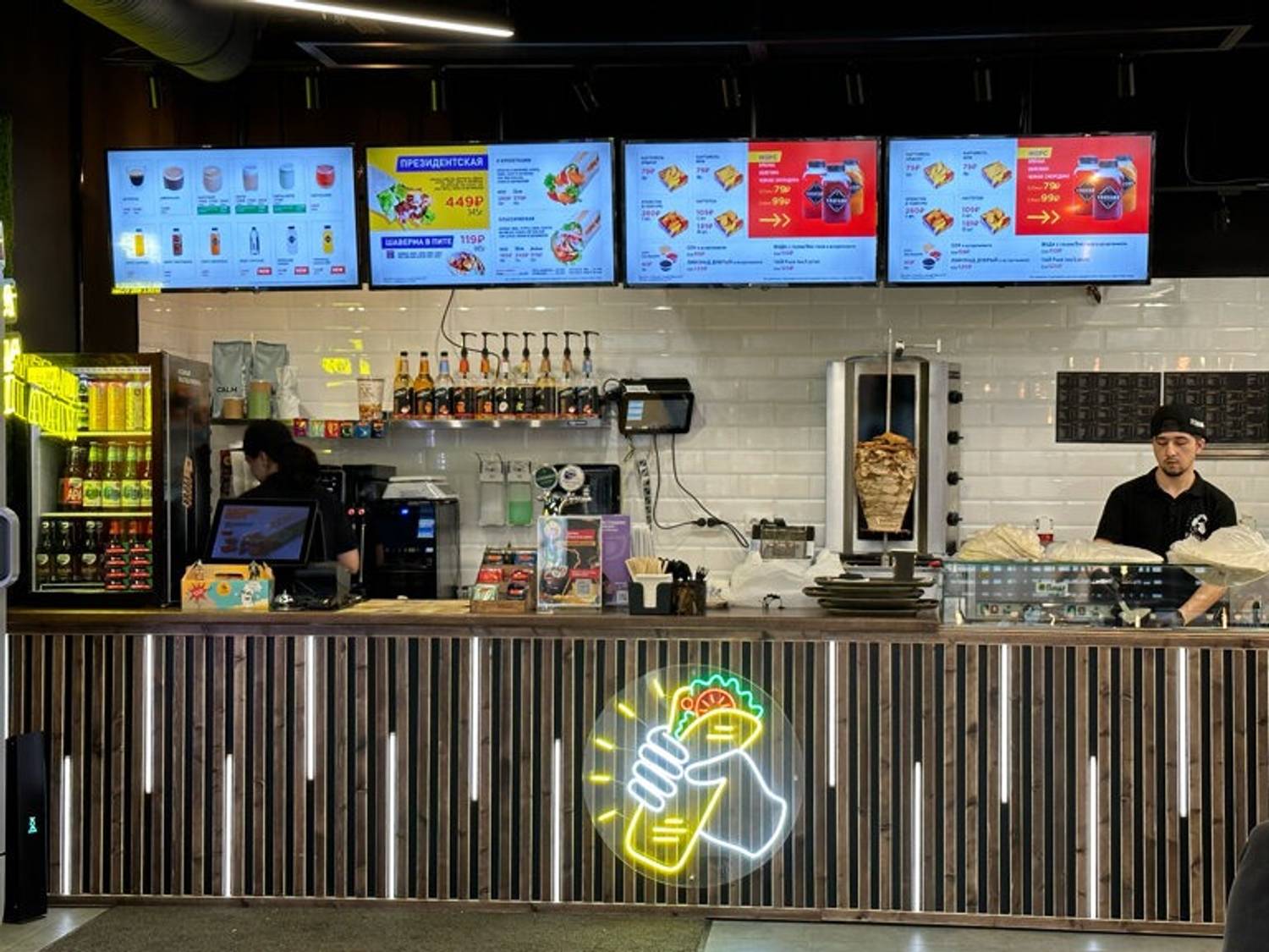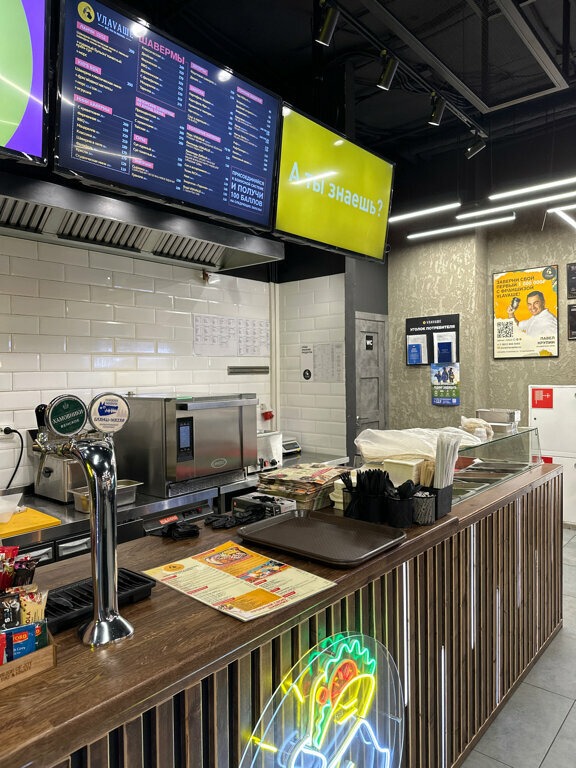 Еда и напитки. В меню — более 10 видов шаурмы, включая варианты с креветками, беконом и соусом барбекю, курицей и моцареллой, фалафелем, а также сладкую версию с бананом и нутеллой. Гости могут самостоятельно собрать блюдо, выбирая из 20+ дополнительных ингредиентов. Из напитков: фирменный морс, кофейная классика, лимонады.