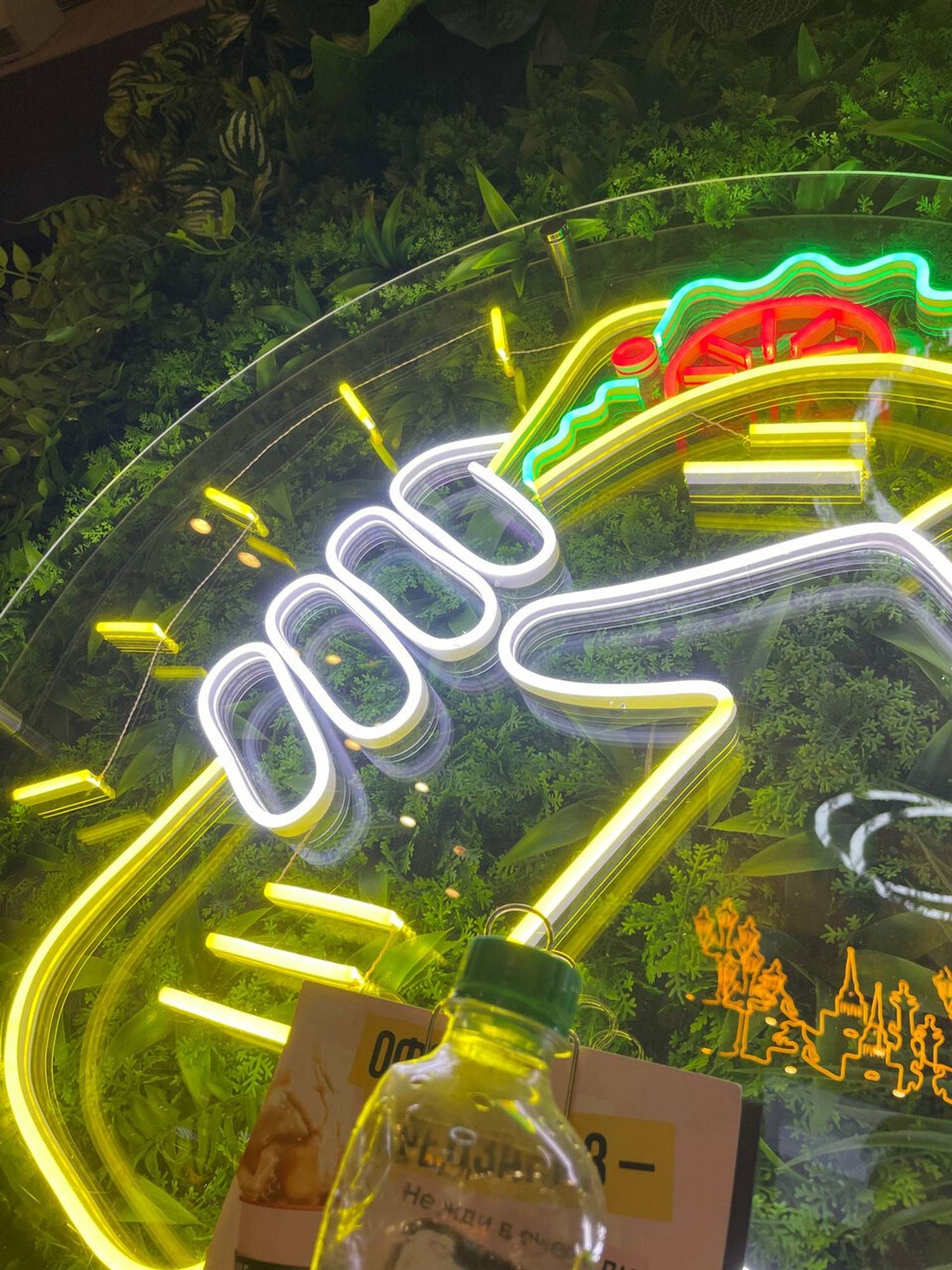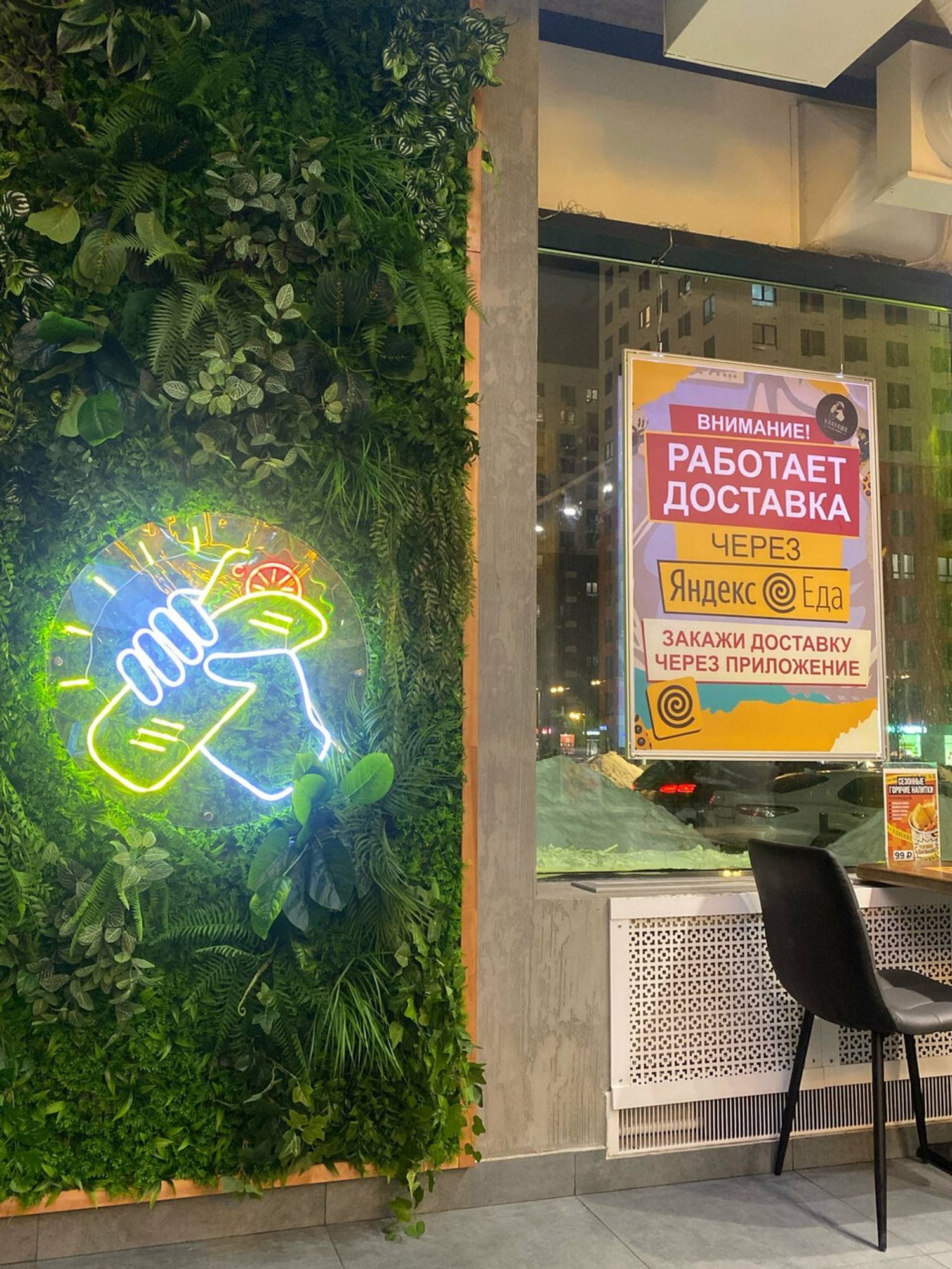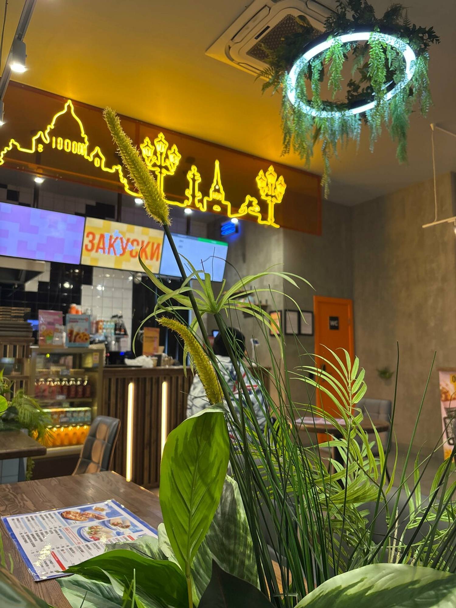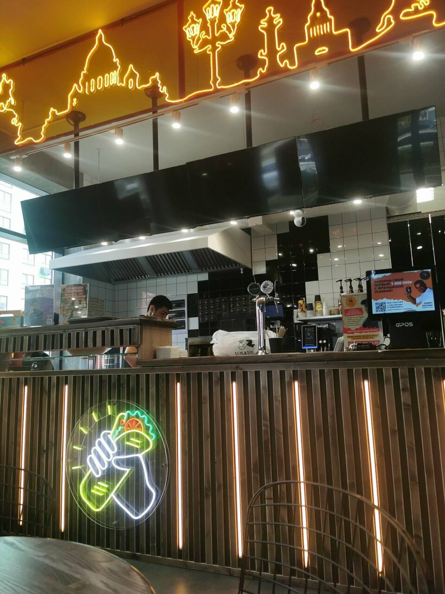 Атмосфера. Интерьер сочетает современные акценты и натуральные материалы: деревянная стойка с мягкой подсветкой и неоновая вывеска с фирменным символом шавермы. Темные деревянные столы добавляют строгости и уюта одновременно.