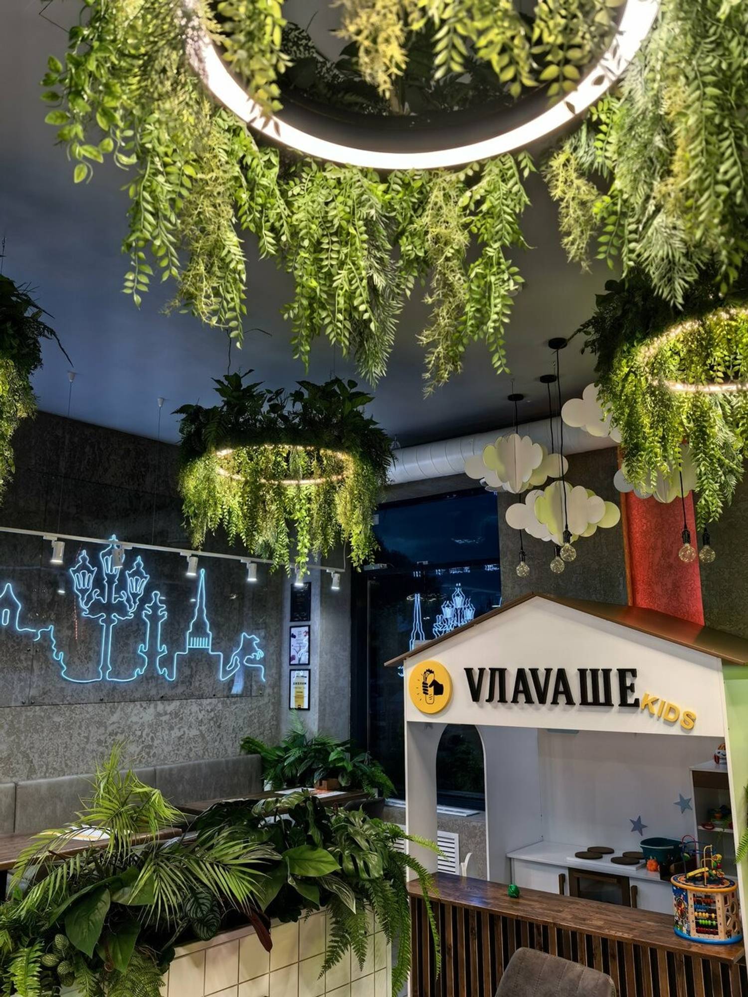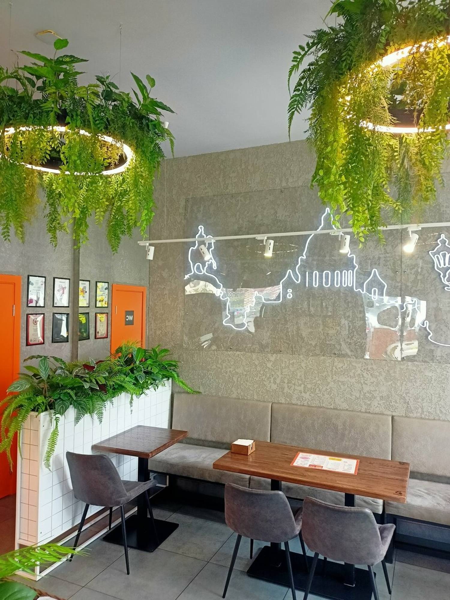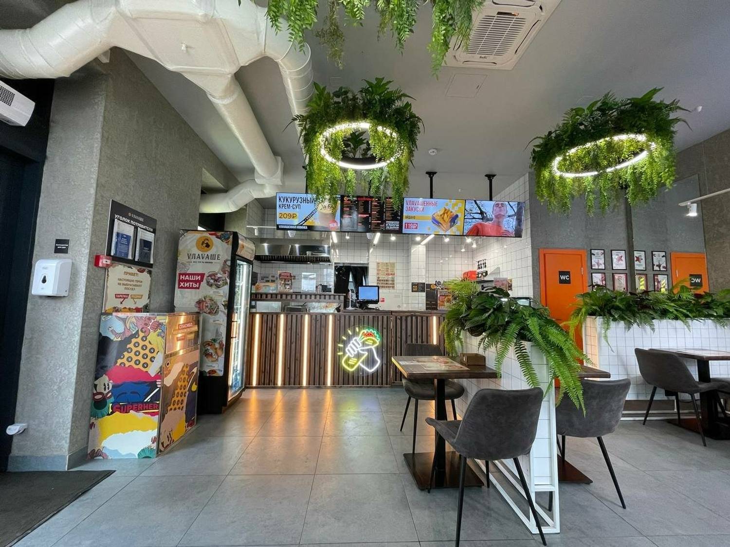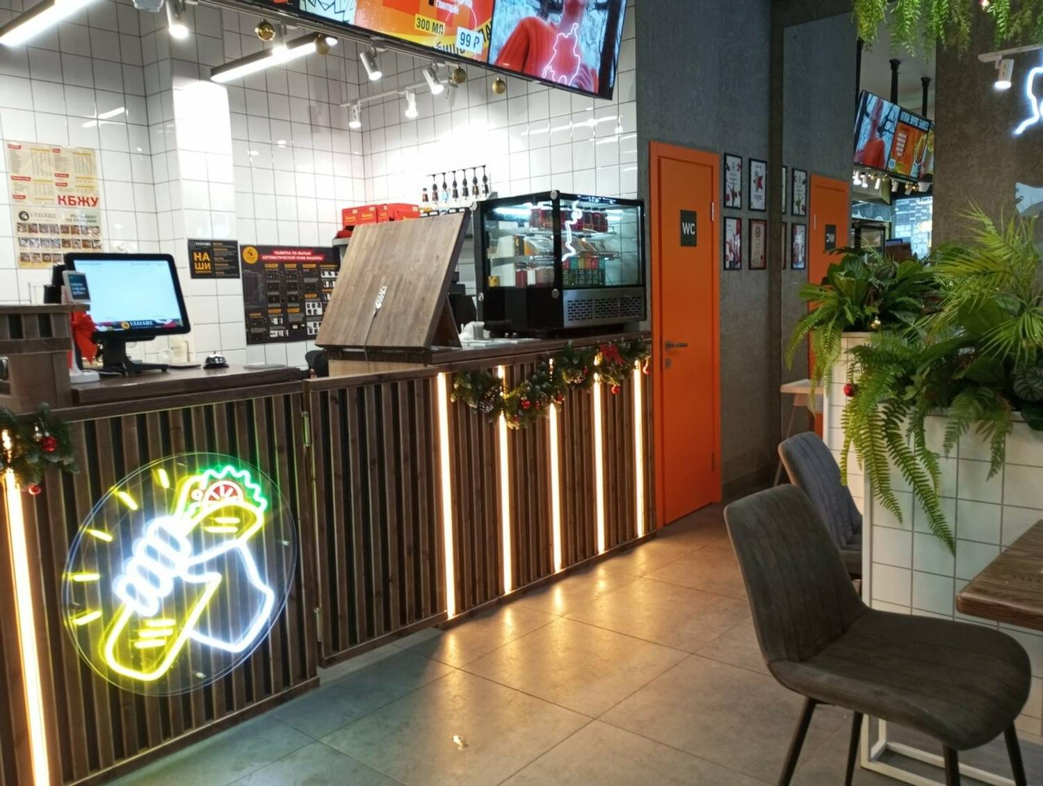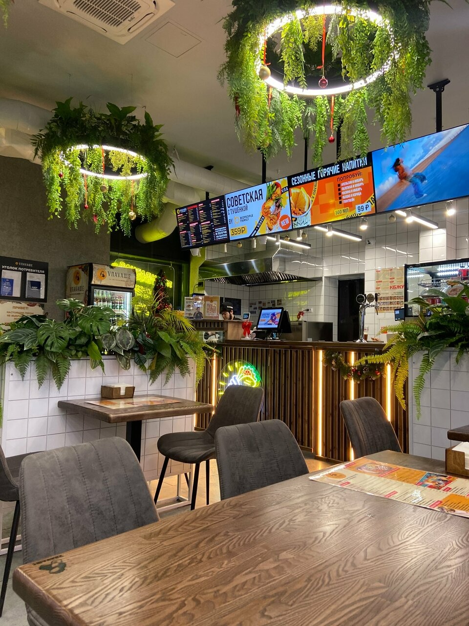 Атмосфера. Пространство сочетает натуральные материалы и современные детали: деревянная стойка с мягкой подсветкой и неоновая вывеска с шавермой создают яркий контраст. Кольцевые люстры, украшенные растениями, и белые плиточные панели с кадками зелени добавляют интерьеру легкости.