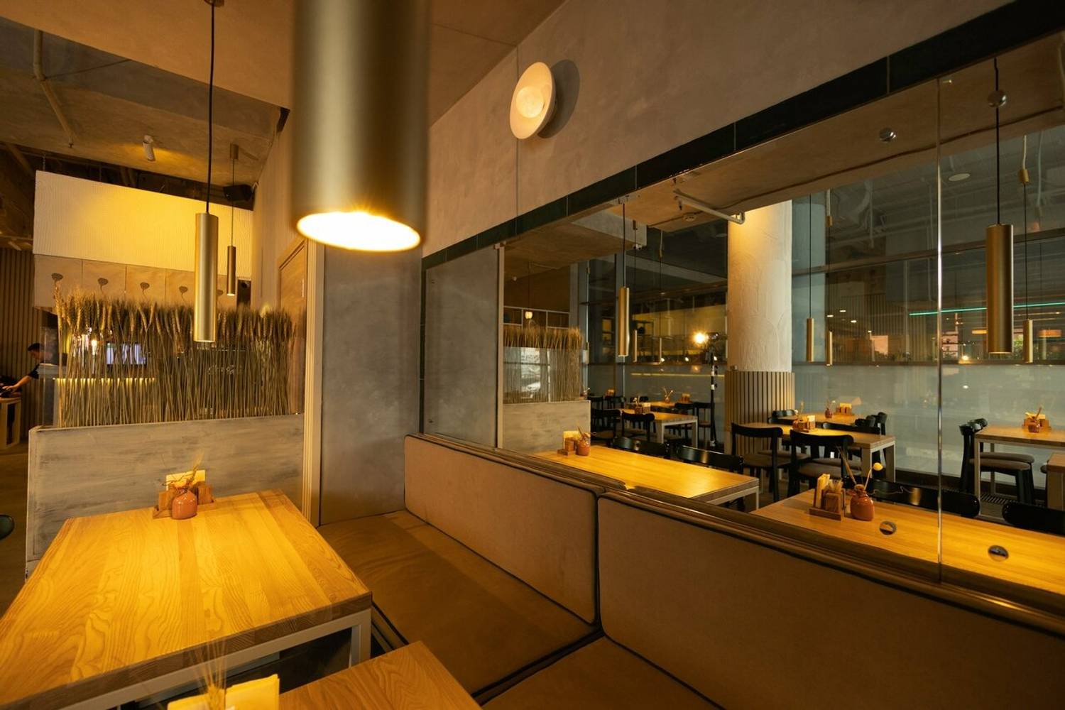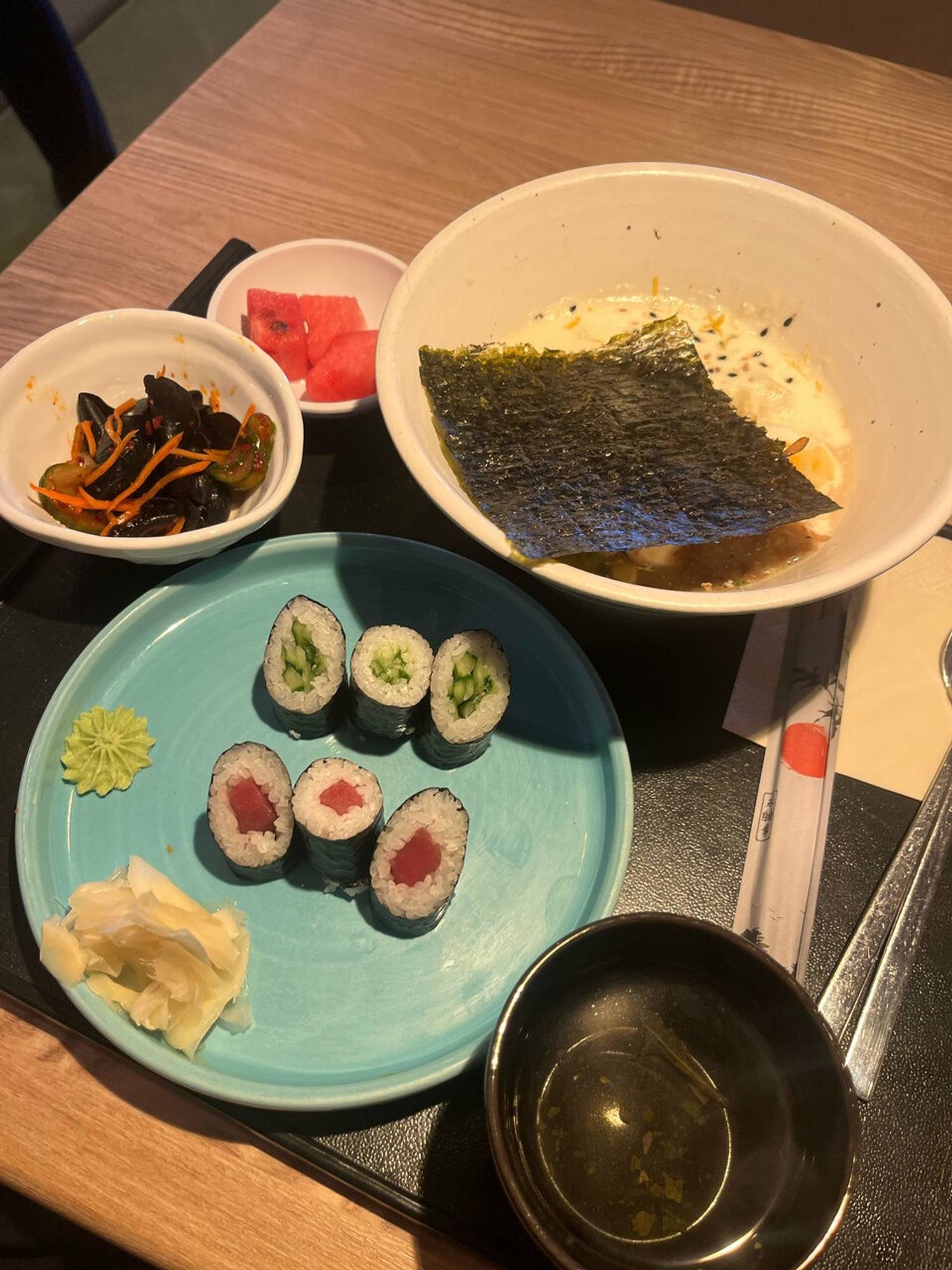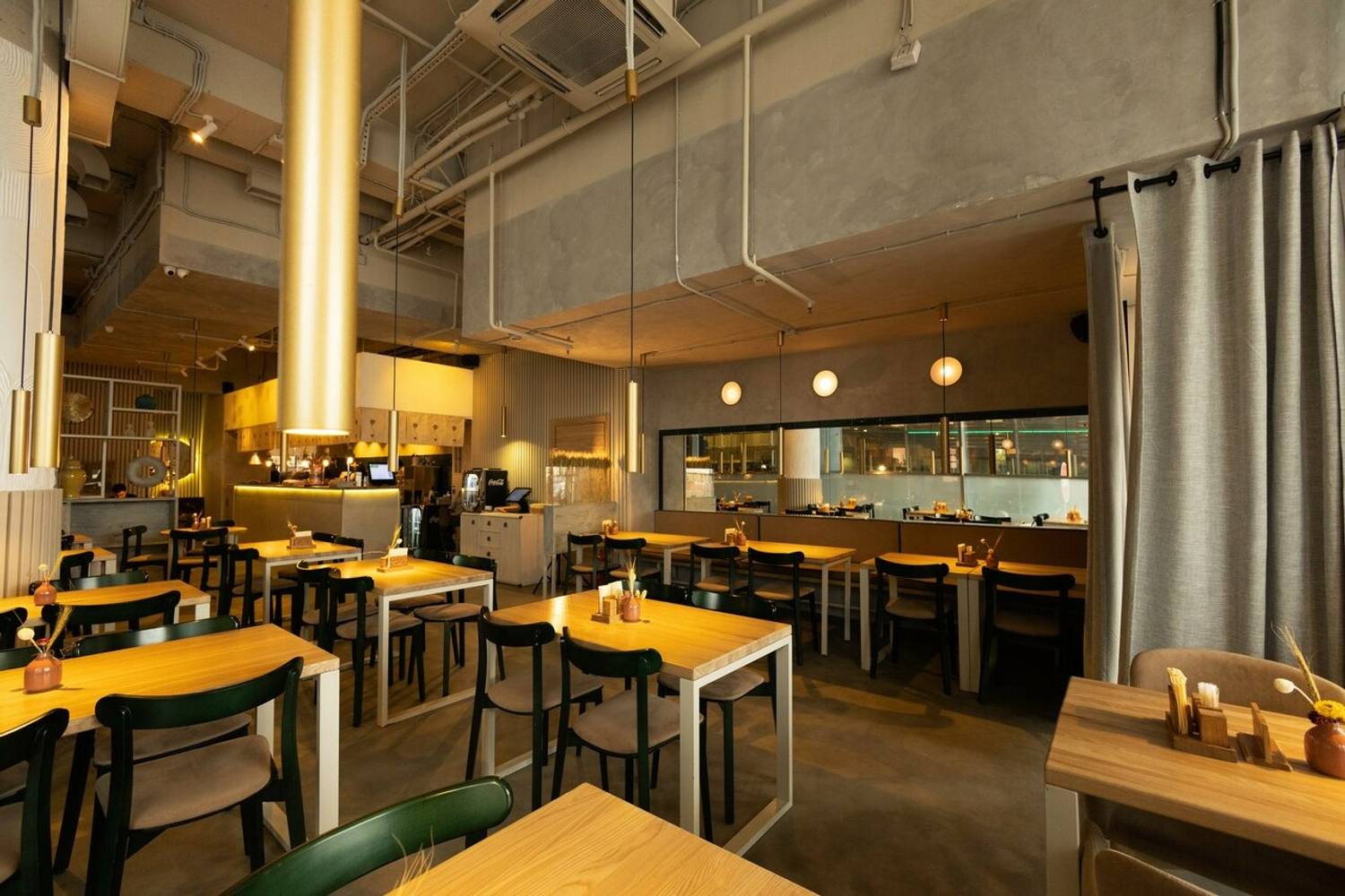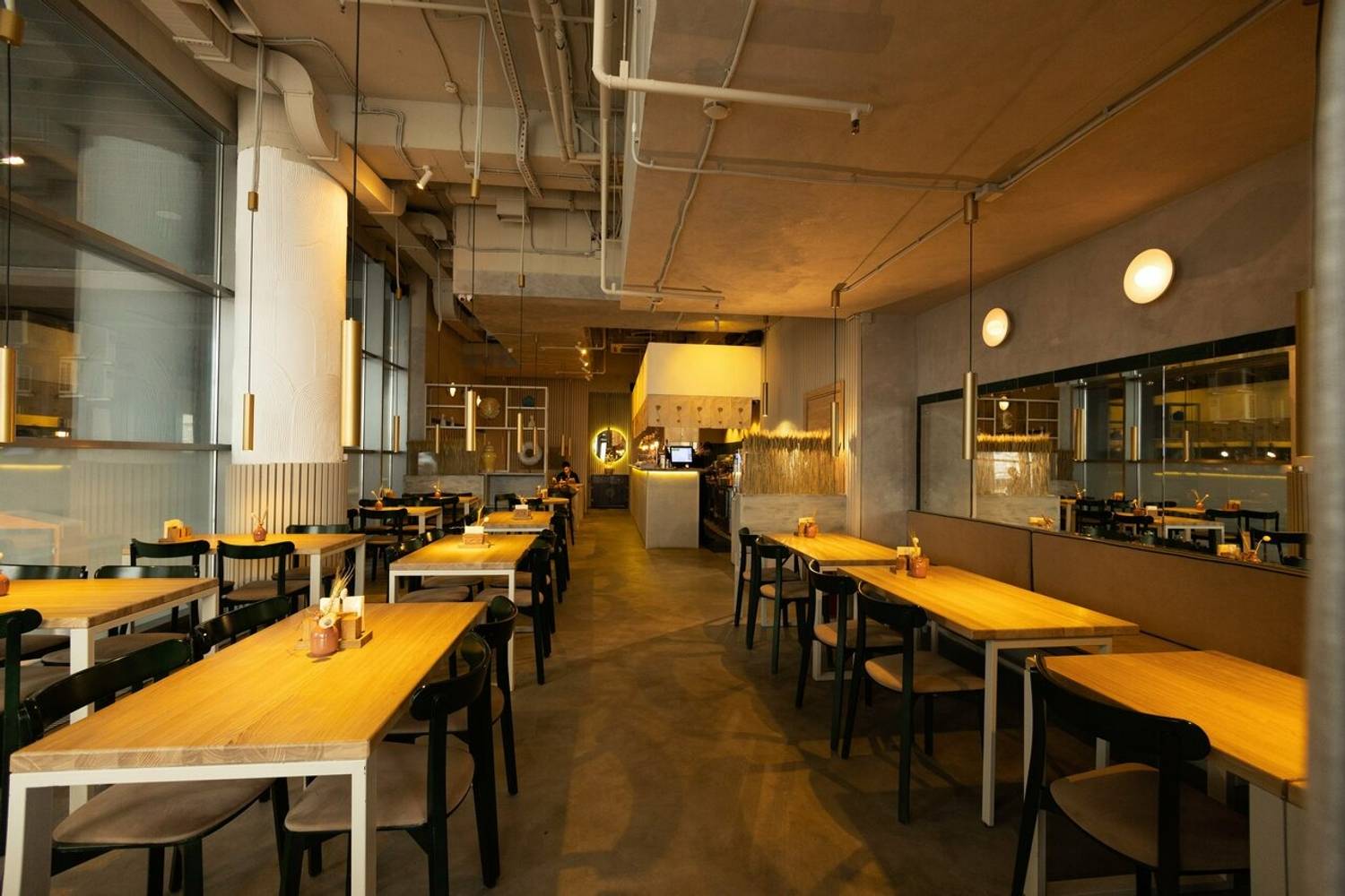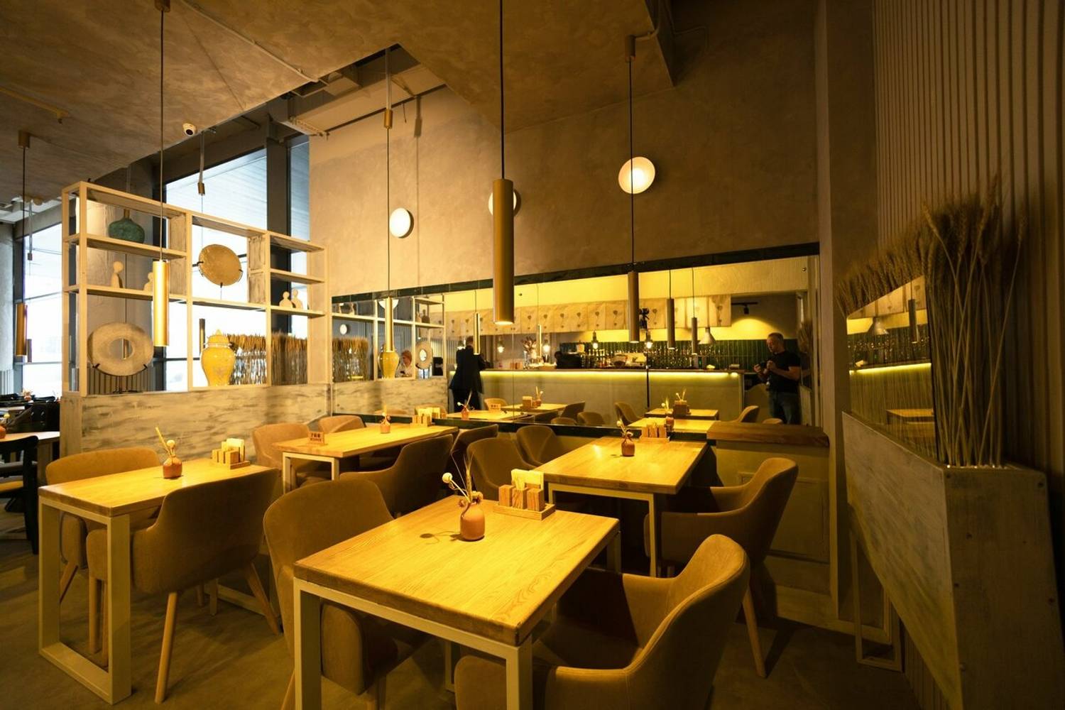 Атмосфера. Небольшое пространство на 15 посадочных мест выдержано в сдержанном японском стиле: теплые деревянные поверхности сочетаются с яркой зеленой плиткой, создавая ощущение уюта и легкости. Интерьер дополняют белые полки с посудой, металлические светло‑серые трубчатые элементы и тематические детали — постеры, карта Киото, вырезки с изображениями японских блюд и иероглифами. Все это формирует узнаваемый облик традиционной азиатской закусочной, где можно быстро перекусить или провести неспешный обед.