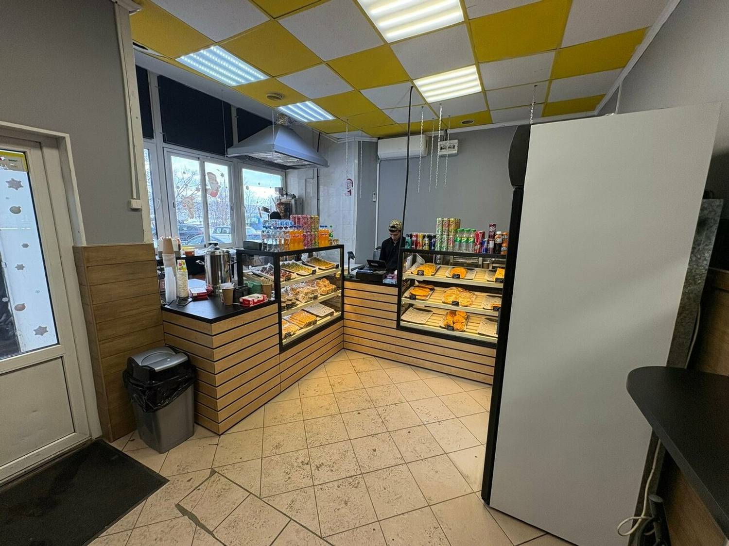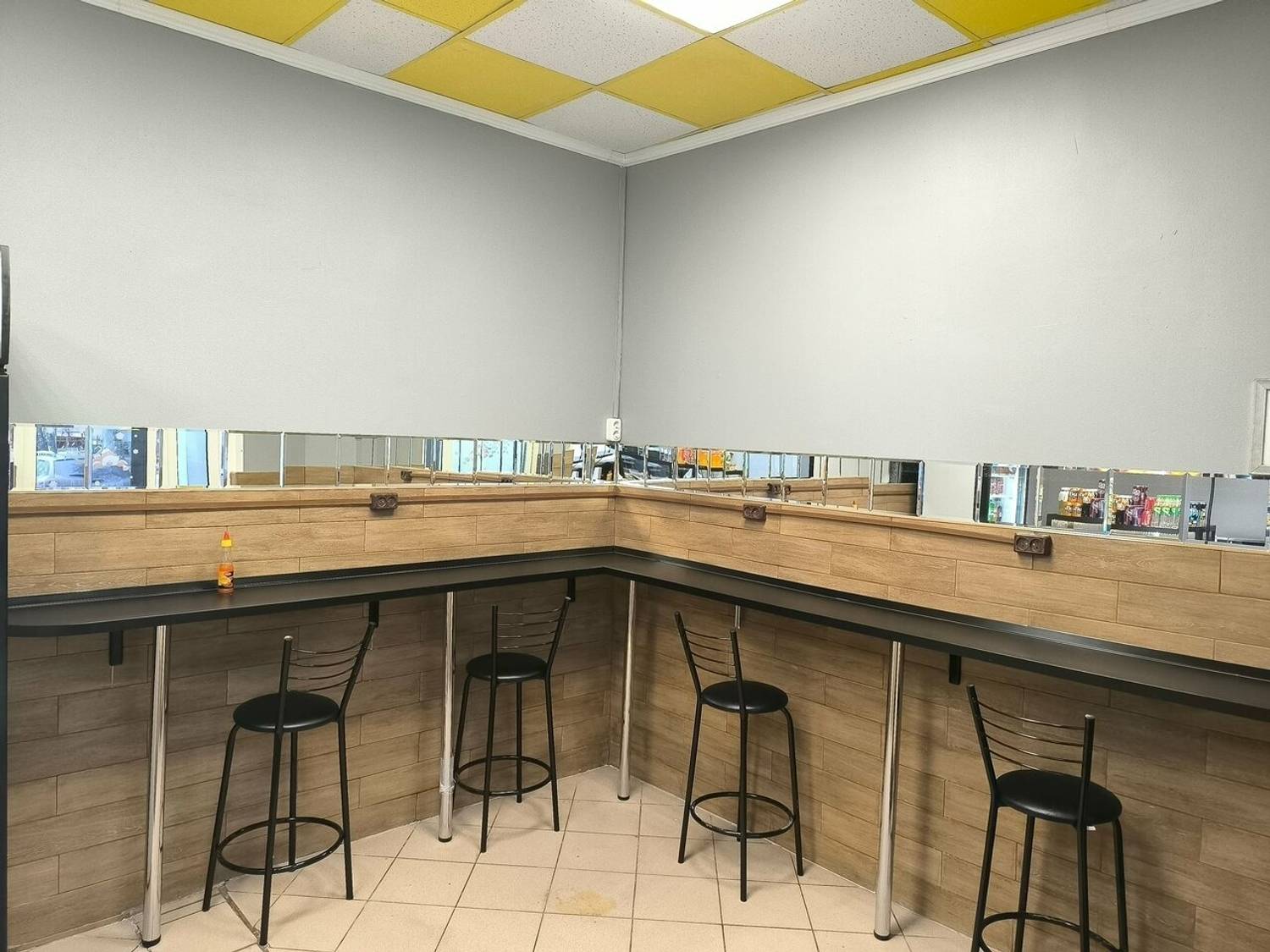 Атмосфера. Пространство оформлено в спокойной гамме: высокие деревянные столы, черные стулья и контрастный бело-желтый потолок. Здесь царит уютная и функциональная атмосфера — у каждого стола есть розетки, что делает кафе удобным местом для работы за ноутбуком или быстрой деловой встречи.