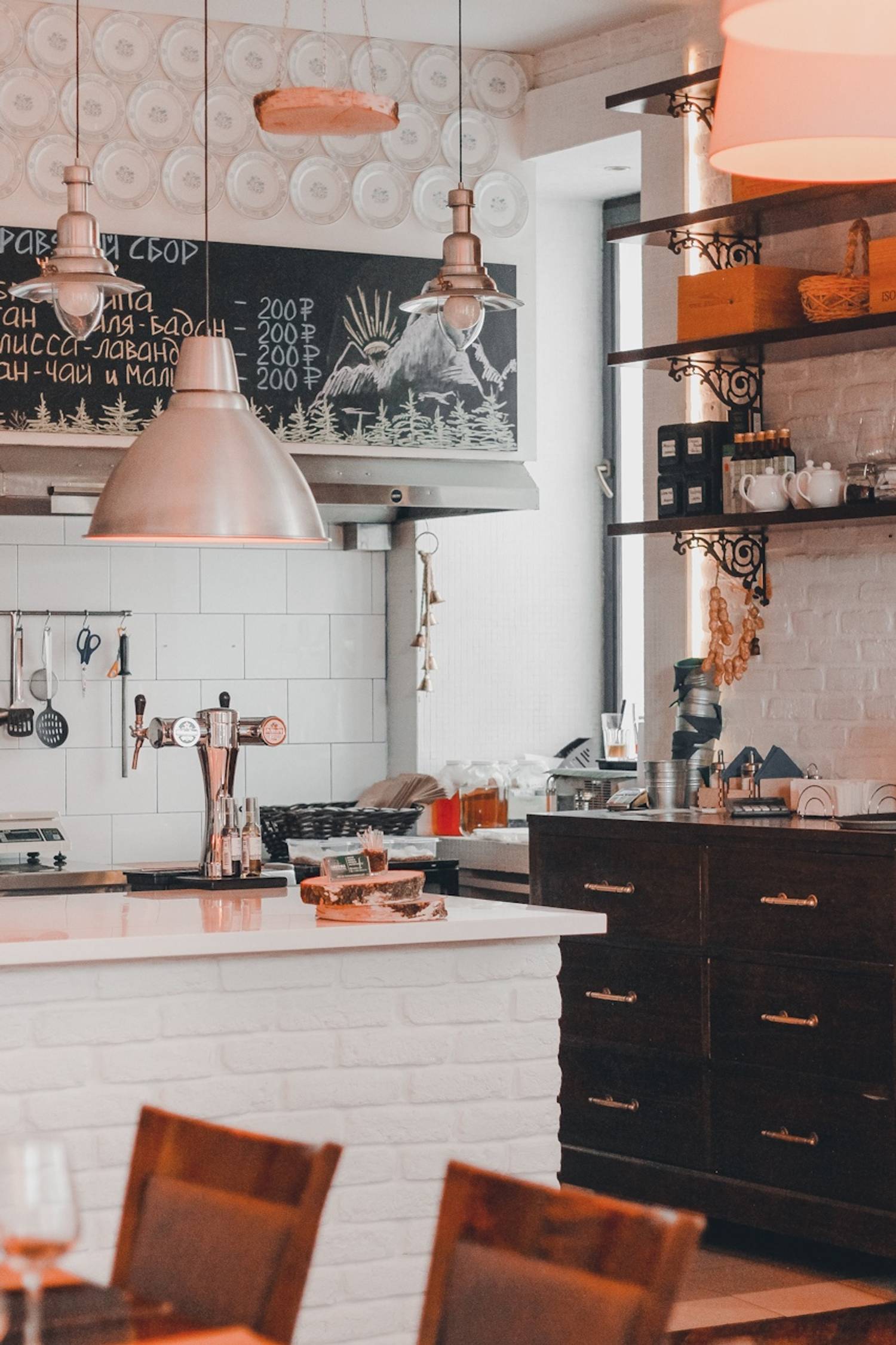 Атмосфера. Интерьер с кирпичными стенами, классическими люстрами и книжными полками воссоздает атмосферу дворянского особняка. Светлые тона, мягкая мебель и панорамные окна с видом на Петроградскую сторону придают обстановке камерности и элегантности, при этом не добавляя лишней помпезности.