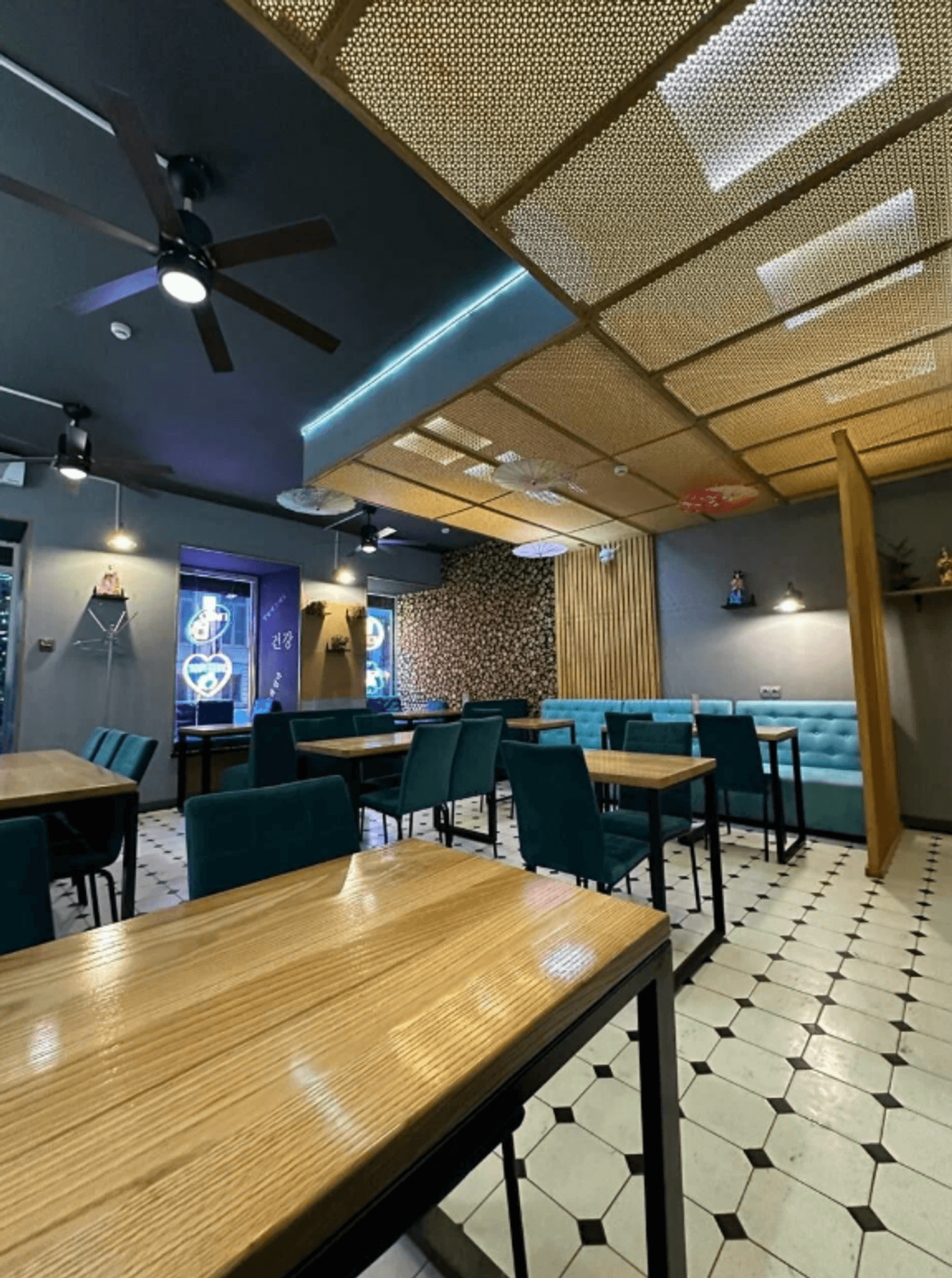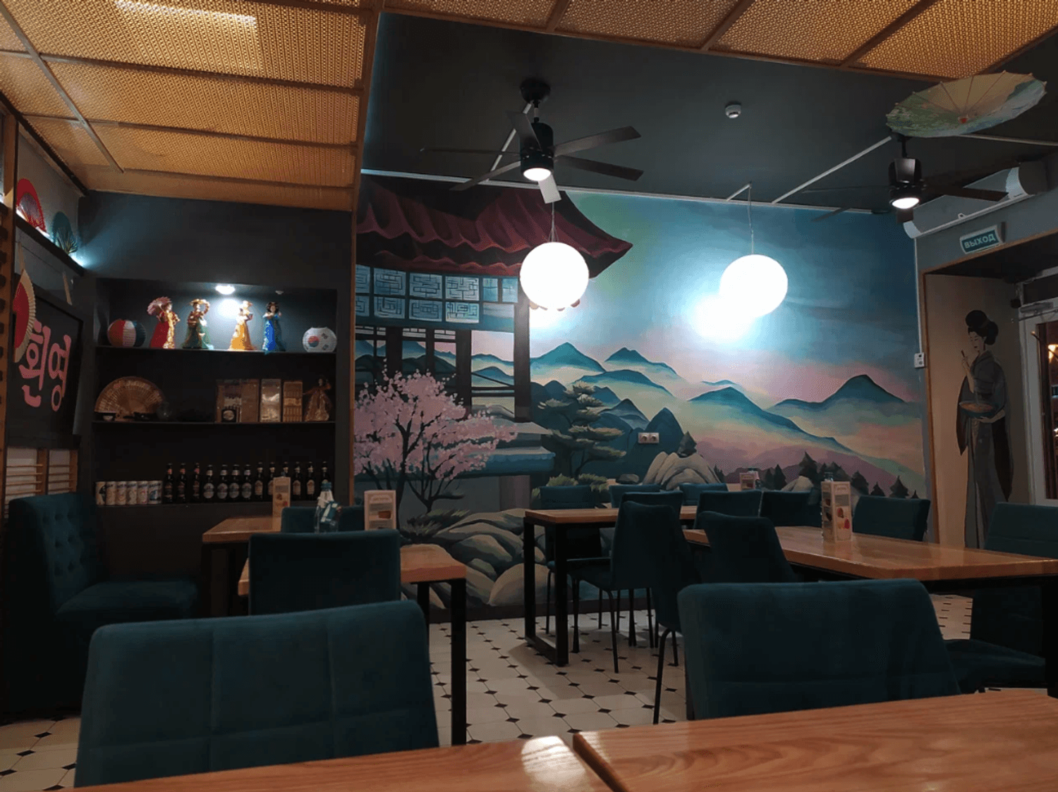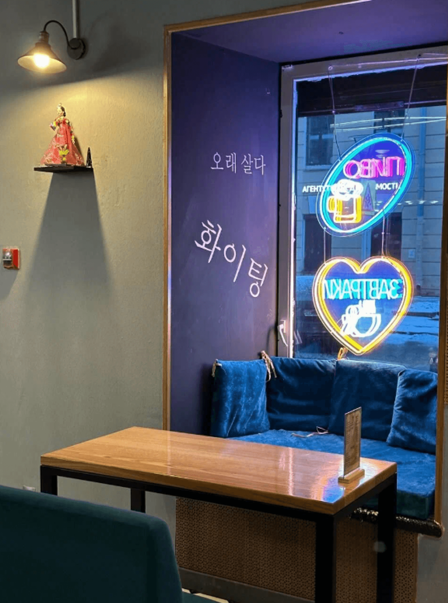 Атмосфера. Светлый зал с простой деревянной мебелью и теплым светом создает ощущение уюта и спокойствия. Бирюзовые акценты, роспись в виде гор на стене и неоновые вывески добавляют пространству современного колорита, навевая настроение улиц Сеула.