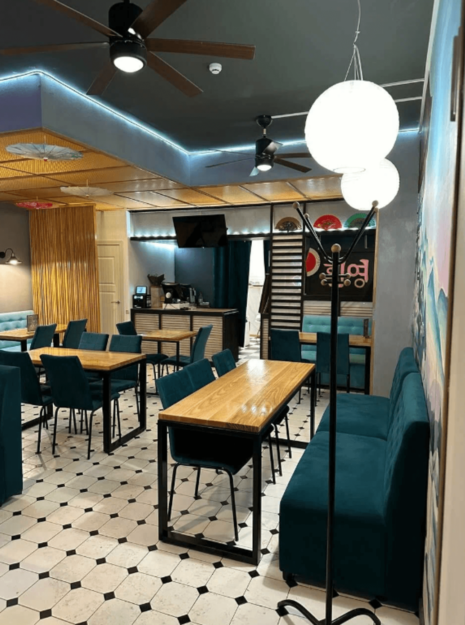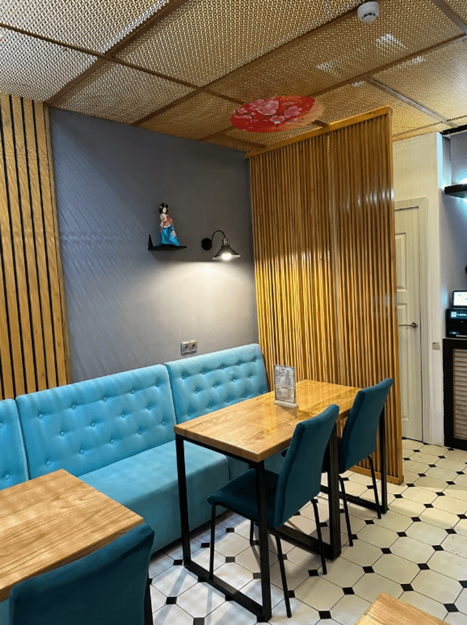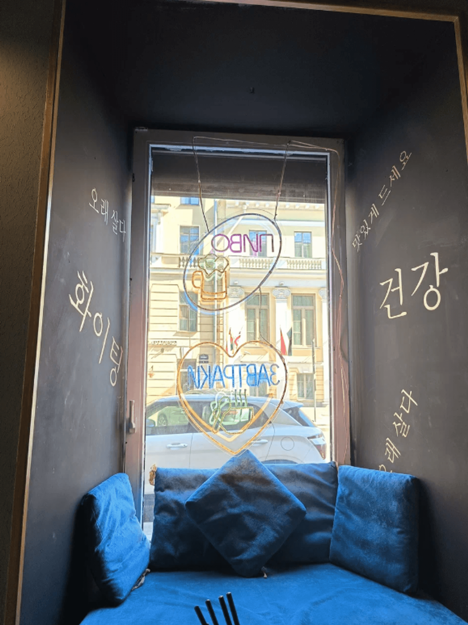 Атмосфера. Светлый зал с простой деревянной мебелью и теплым светом создает ощущение уюта и спокойствия. Бирюзовые акценты, роспись в виде гор на стене и неоновые вывески добавляют пространству современного колорита, навевая настроение улиц Сеула.