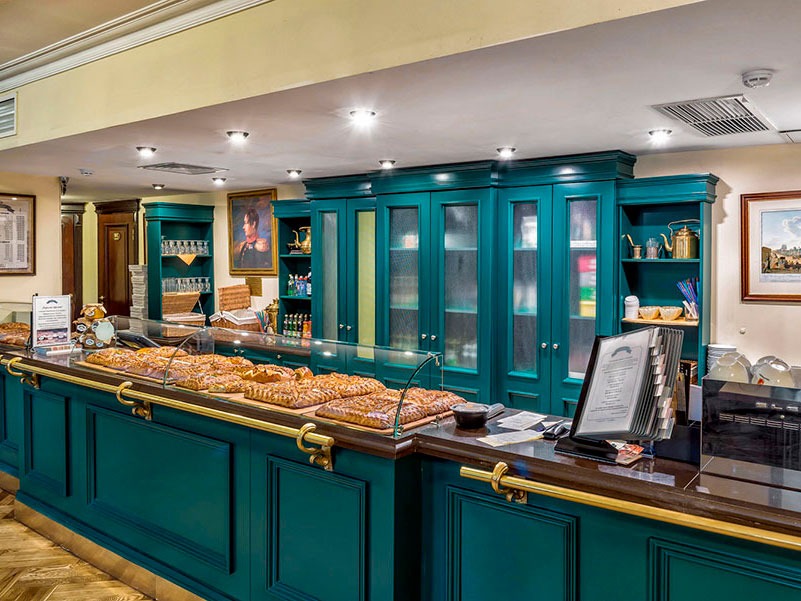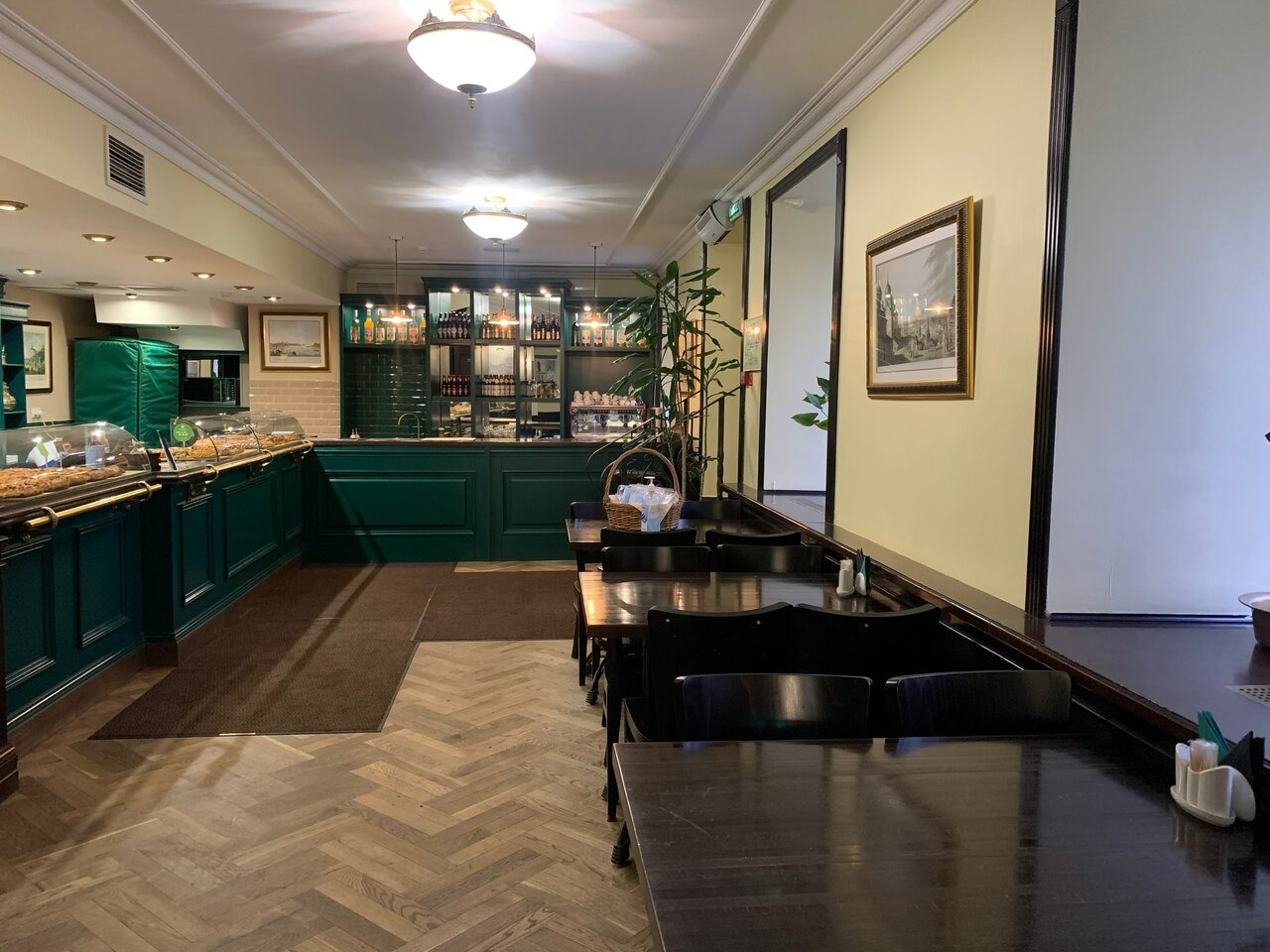 Атмосфера. Зал напоминает открытку из прошлого: ретро-буфеты, венские стулья и матовое стекло. Центром композиции становится портрет генерала Линдфорса, окружённый чёрно-белыми фотографиями в деревянных рамах. Изумрудная барная стойка и небольшая лестница, ведущая в обеденную зону, добавляют пространству характерный шарм.