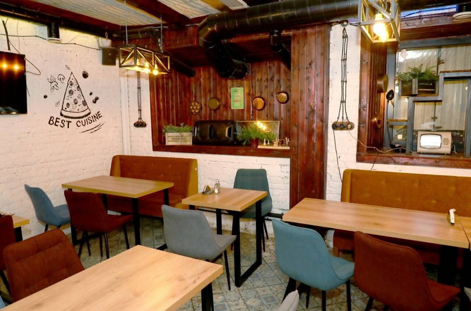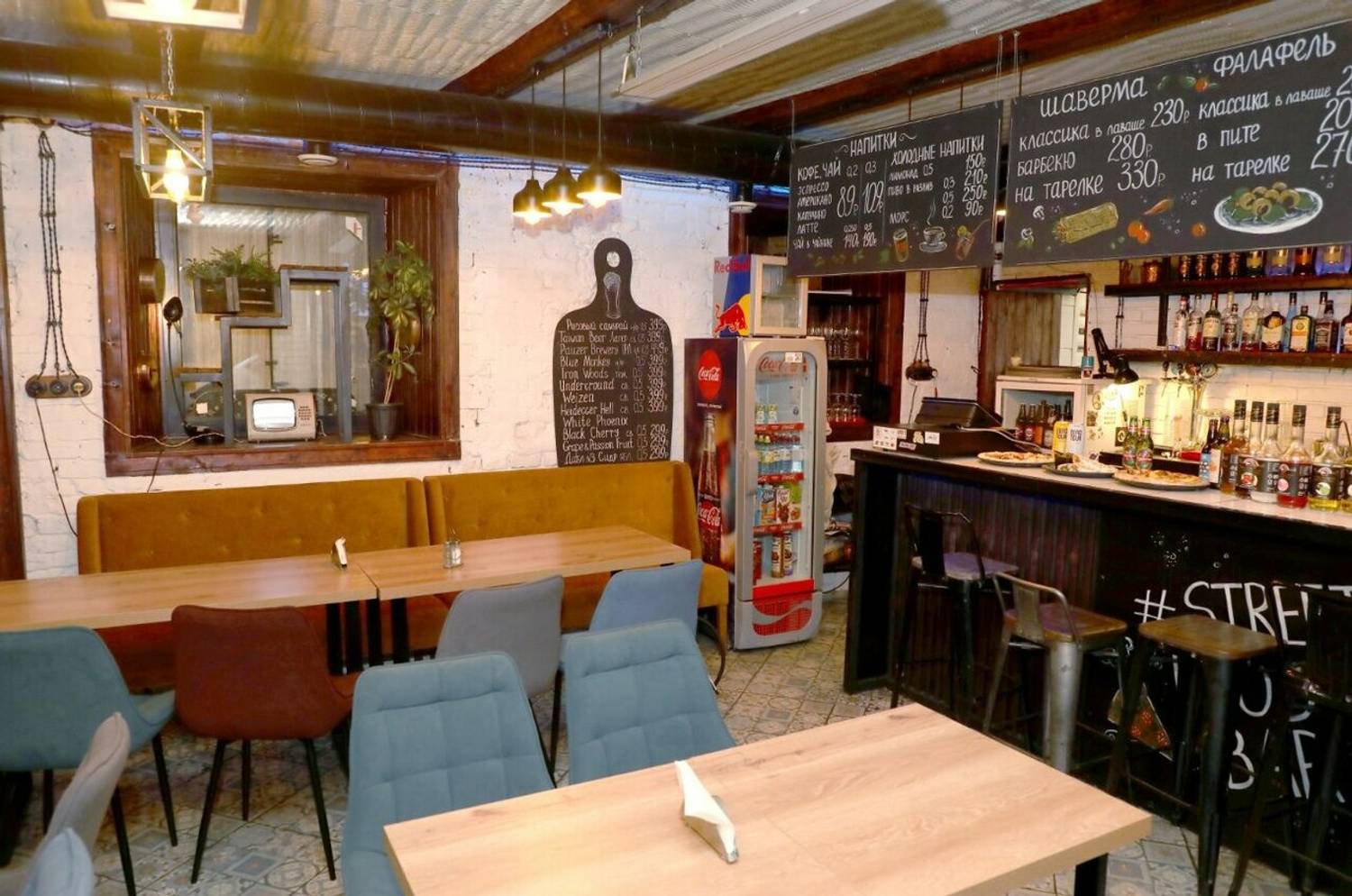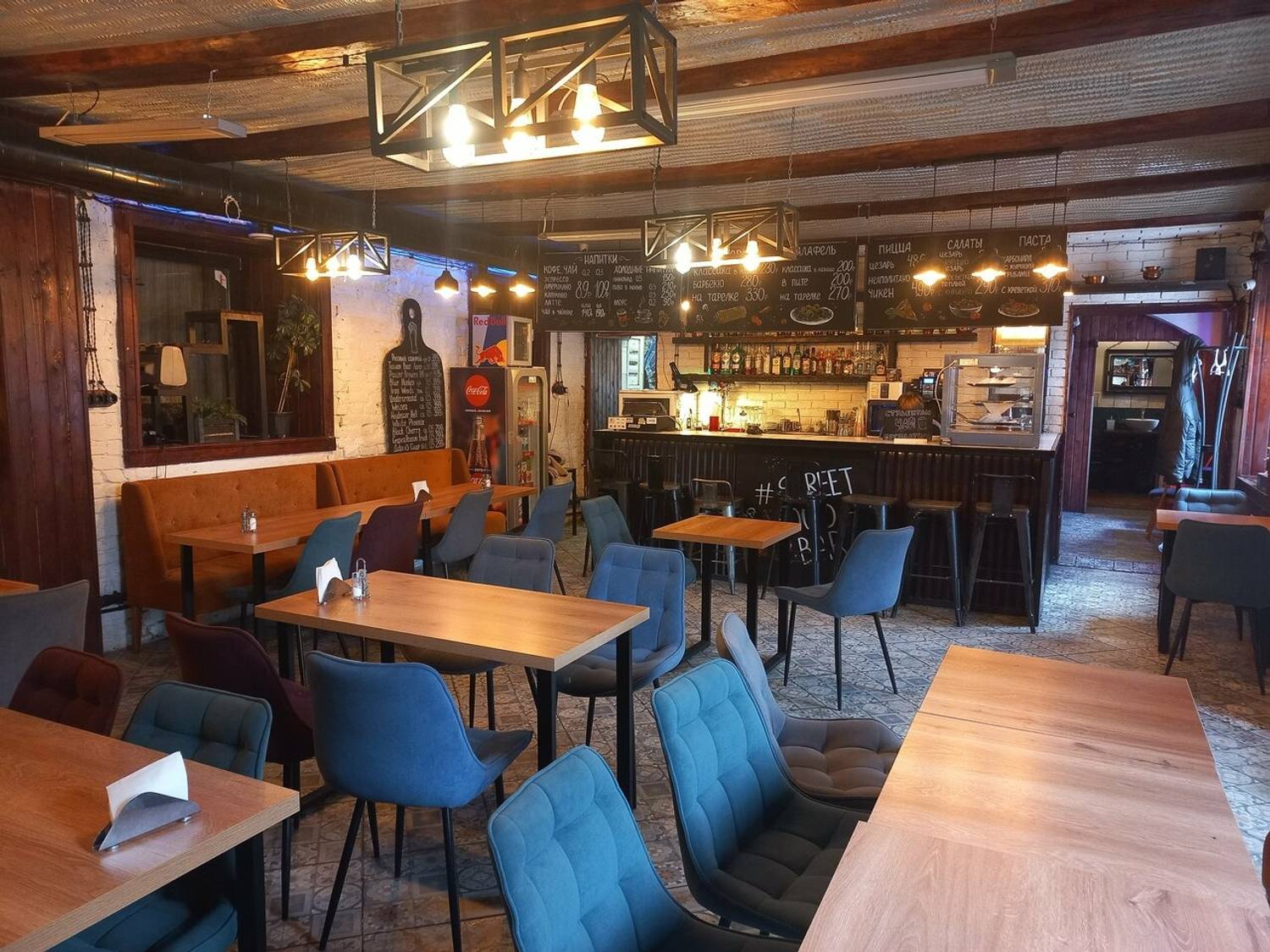 Атмосфера. Кафе оформлено в стиле современной загородной таверны: деревянные столы, открытая кухня с грилем и теплое освещение. В ожидании блюд можно поиграть в настольный хоккей с друзьями или настольные игры.