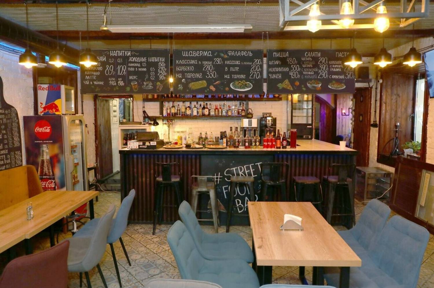 Еда и напитки. В меню — стейки, шашлыки, рыба на гриле, бургеры с котлетами собственного приготовления, фахитос и салаты: оливье, цезарь с креветками, теплый с говядиной. Напитки — крафтовое пиво из Чехии, Австрии и России, красные вина, авторские лимонады.