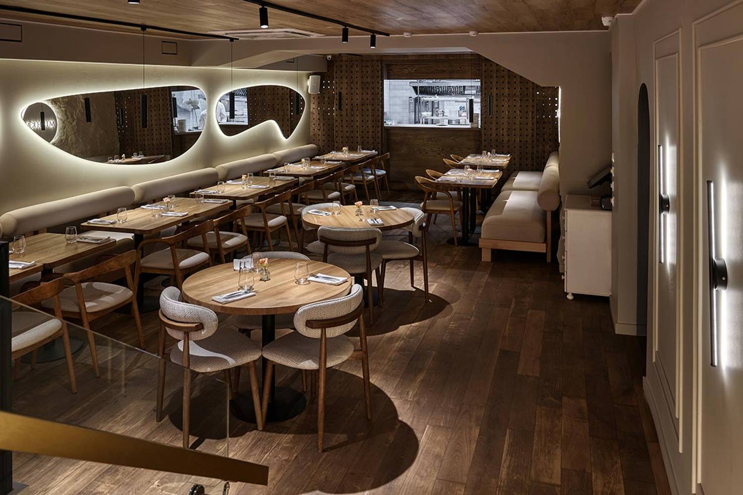 Атмосфера. Интерьер в нежных кремовых тонах со светлой деревянной мебелью и плавными линиями. На втором этаже расположен камин, имитирующий лесной костёр, а зеркальные элементы с подсветкой, которые напоминают озера и леса и отсылают к природному разнообразию России.