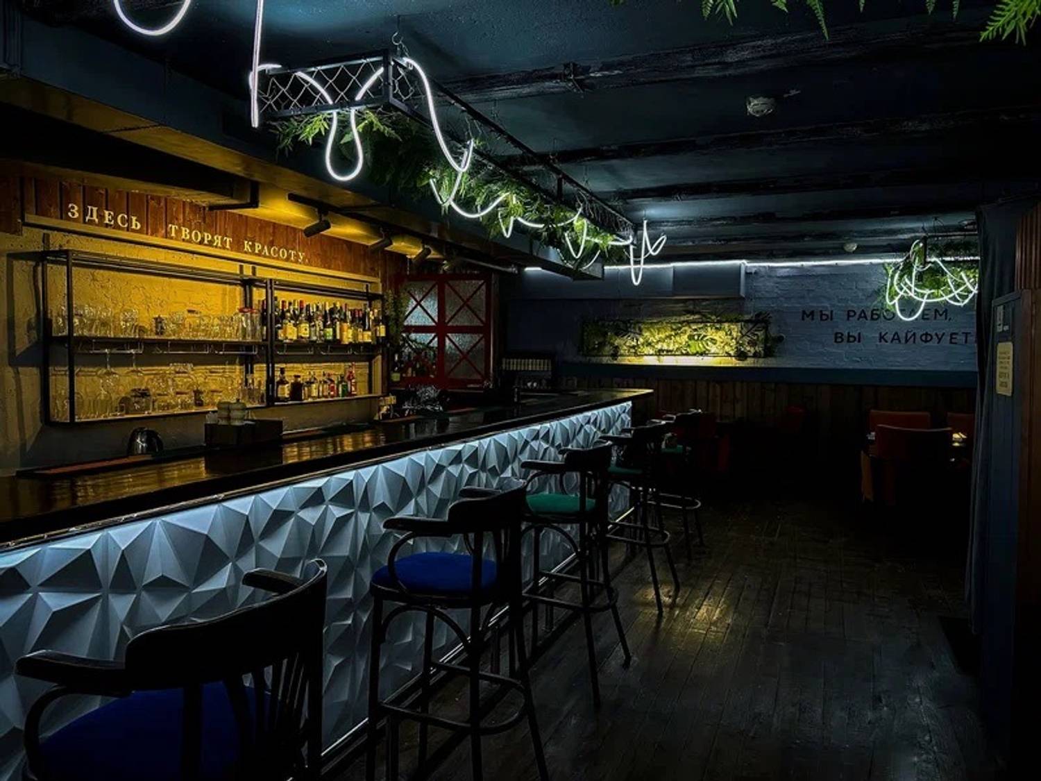 Атмосфера. Несколько залов погружены в полумрак с неоновой подсветкой: портреты коктейлей на стенах, барная стойка с провокационным девизом «Здесь творят красоту» и уютные угловые зоны создают среду для чила и спонтанных вечеринок. Здесь до утра звучат караоке, стендапы и танцевальные треки.