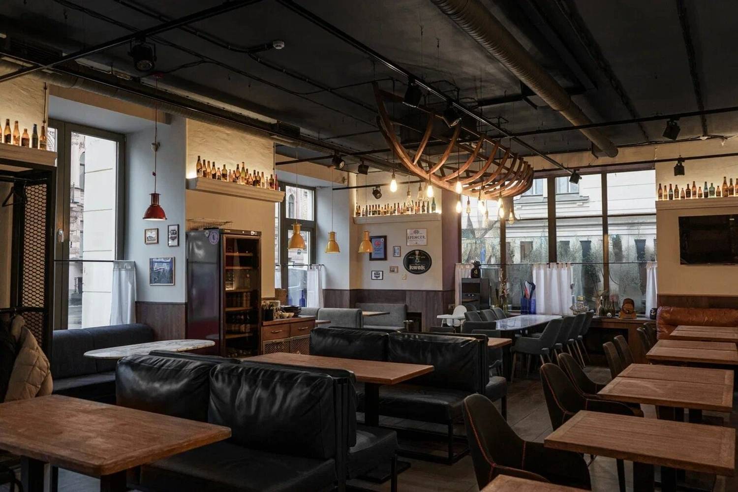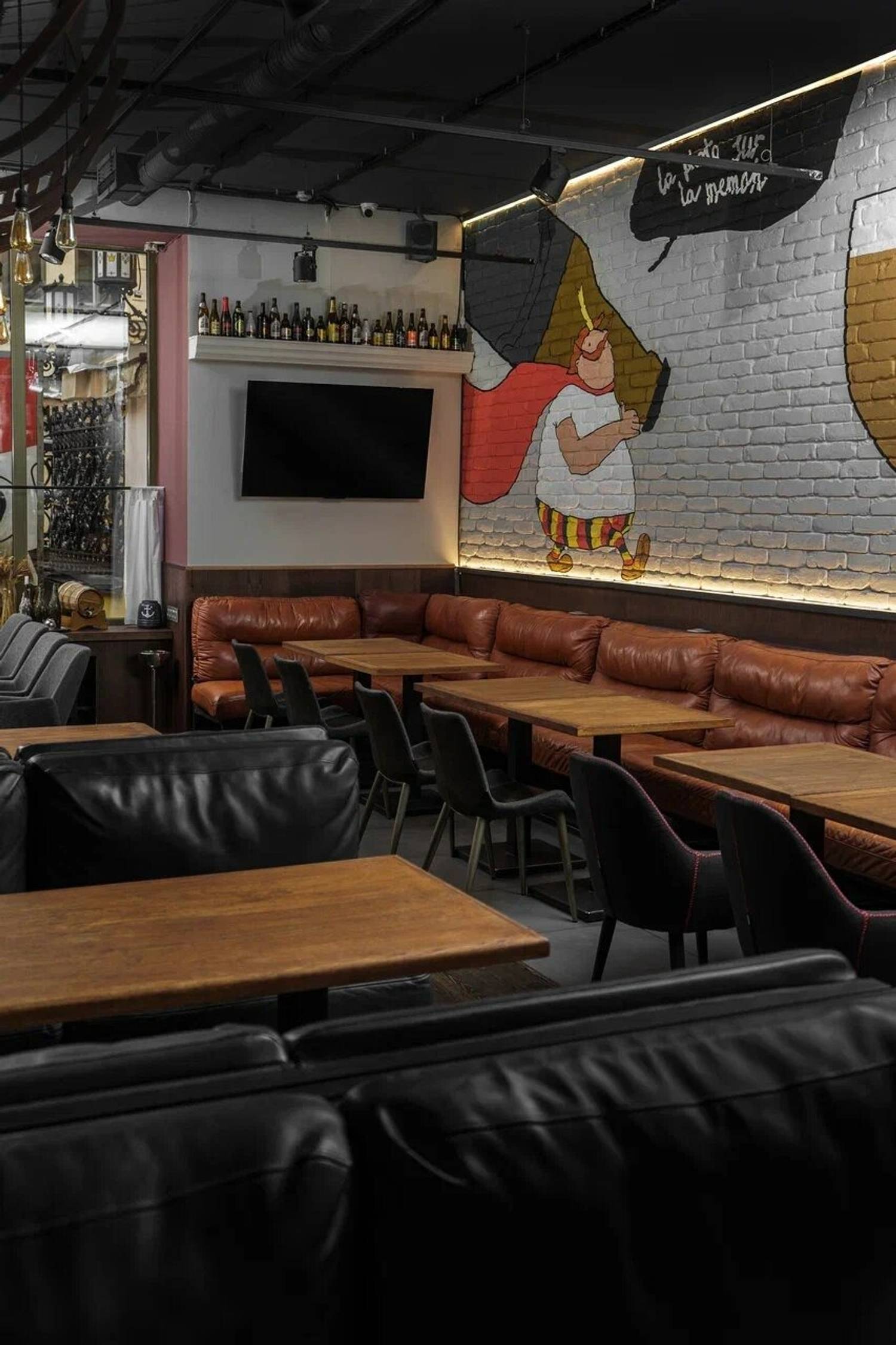 Атмосфера. Паб с оригинальными деталями: кожаные диваны, настенные росписи с гусем и пивными бокалами. На потолке закреплена выразительная деревянная конструкция, каркас которой напоминает корабль или скелет кита.