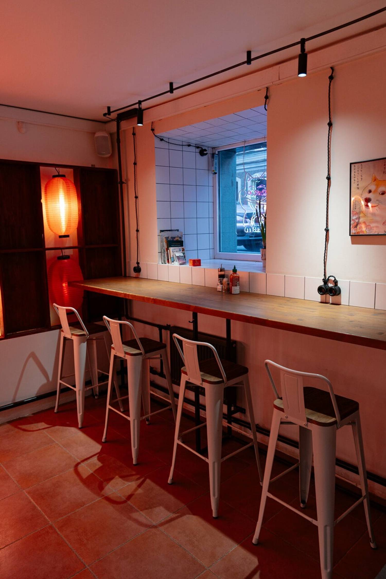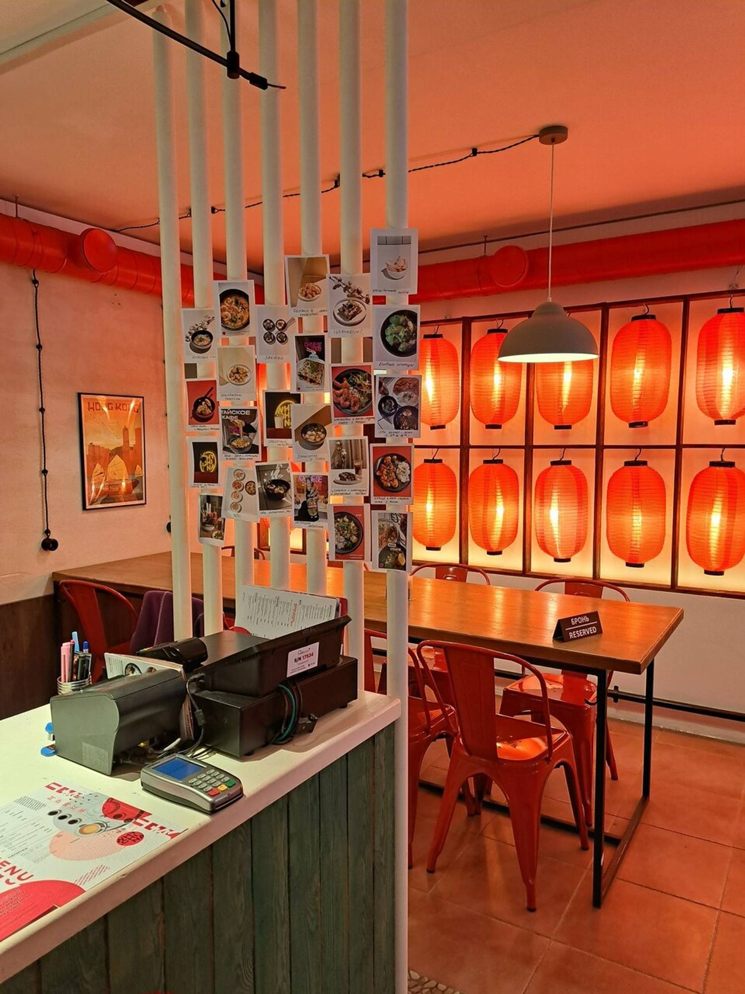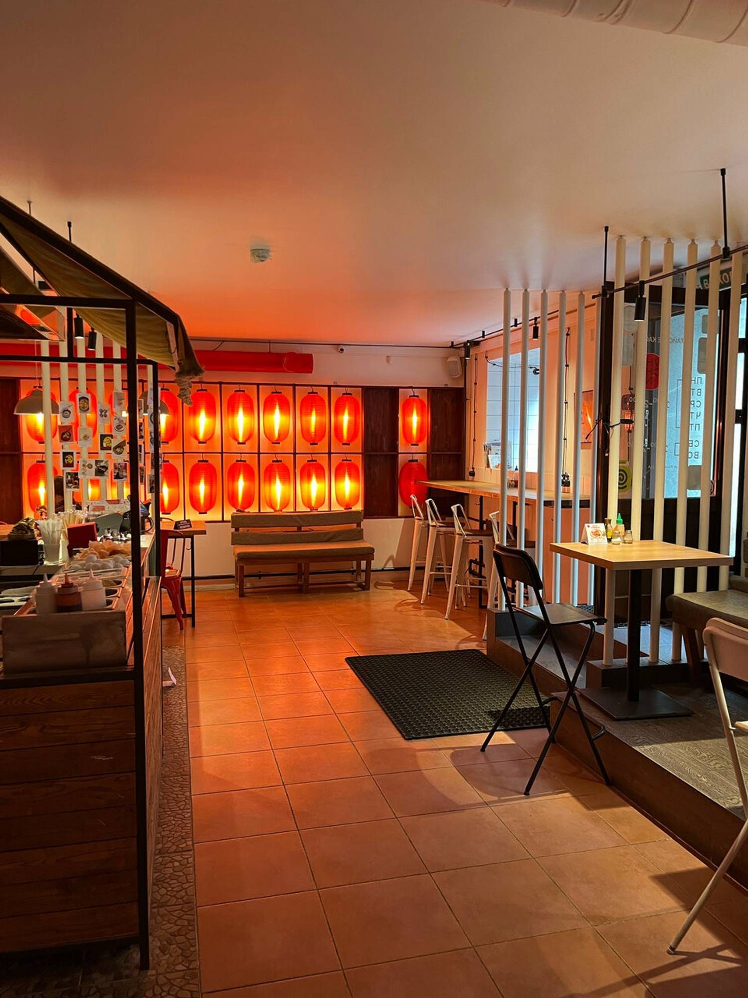 Атмосфера. Яркий современный дизайн с традиционными мотивами: красные стены с китайскими фонарями, белая плитка, неоновая вывеска в круглом обрамлении.