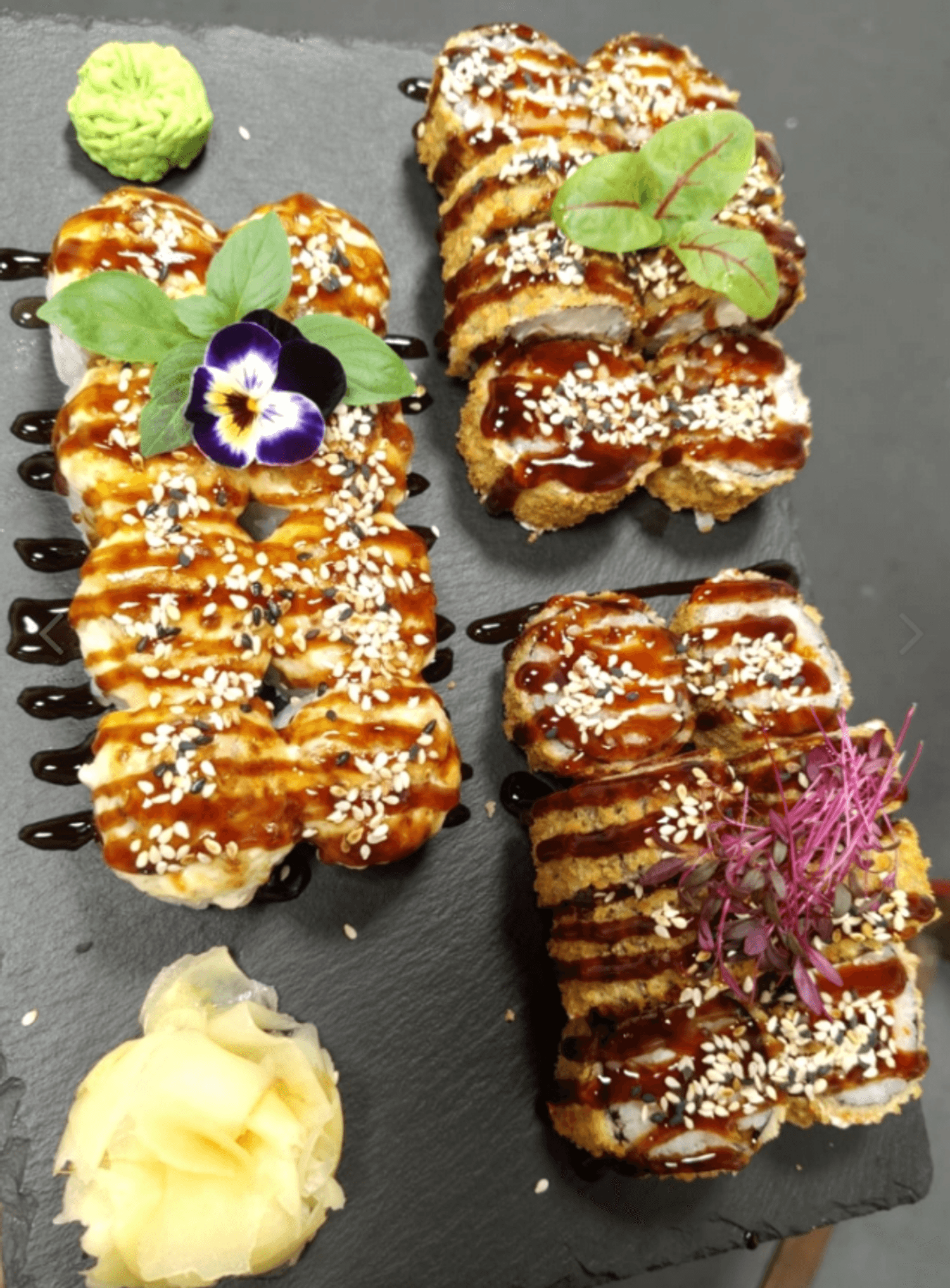 Еда и напитки. В меню — классические и авторские роллы: вроде «Восходящего солнца» с тигровой креветкой и сыром Креметте. Дополняют ассортимент рис с морепродуктами, удон с курицей, запеченные мидии киви и жареные креветки с ананасами и кешью.