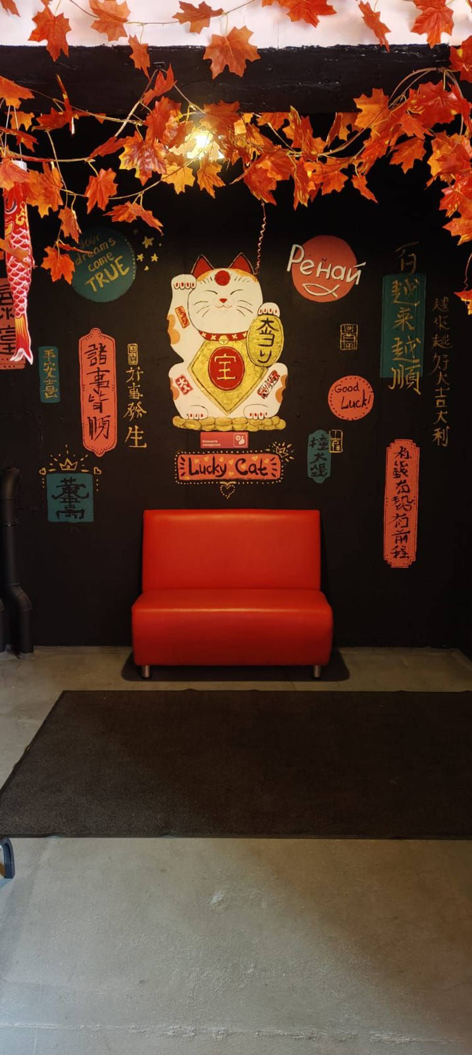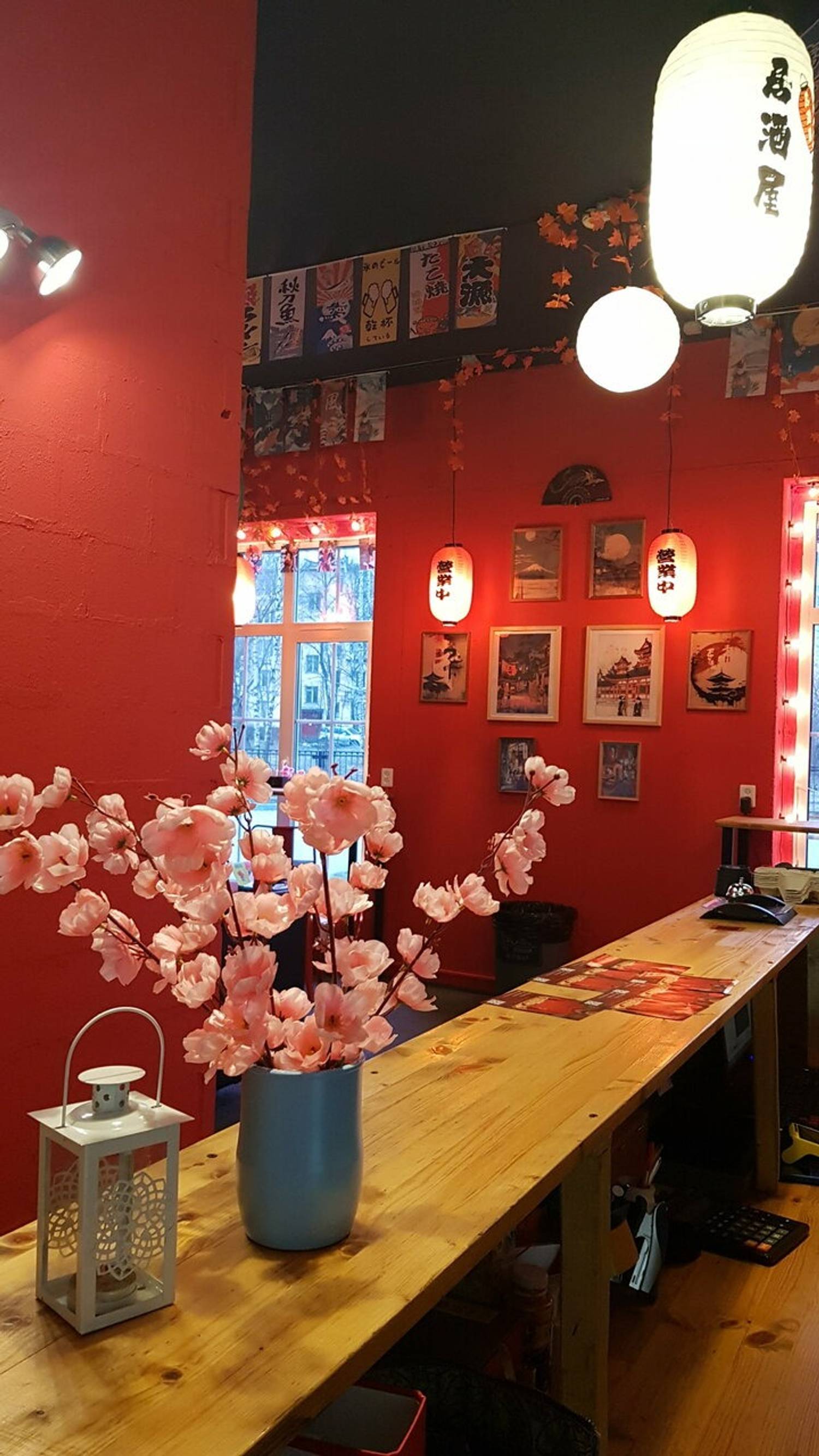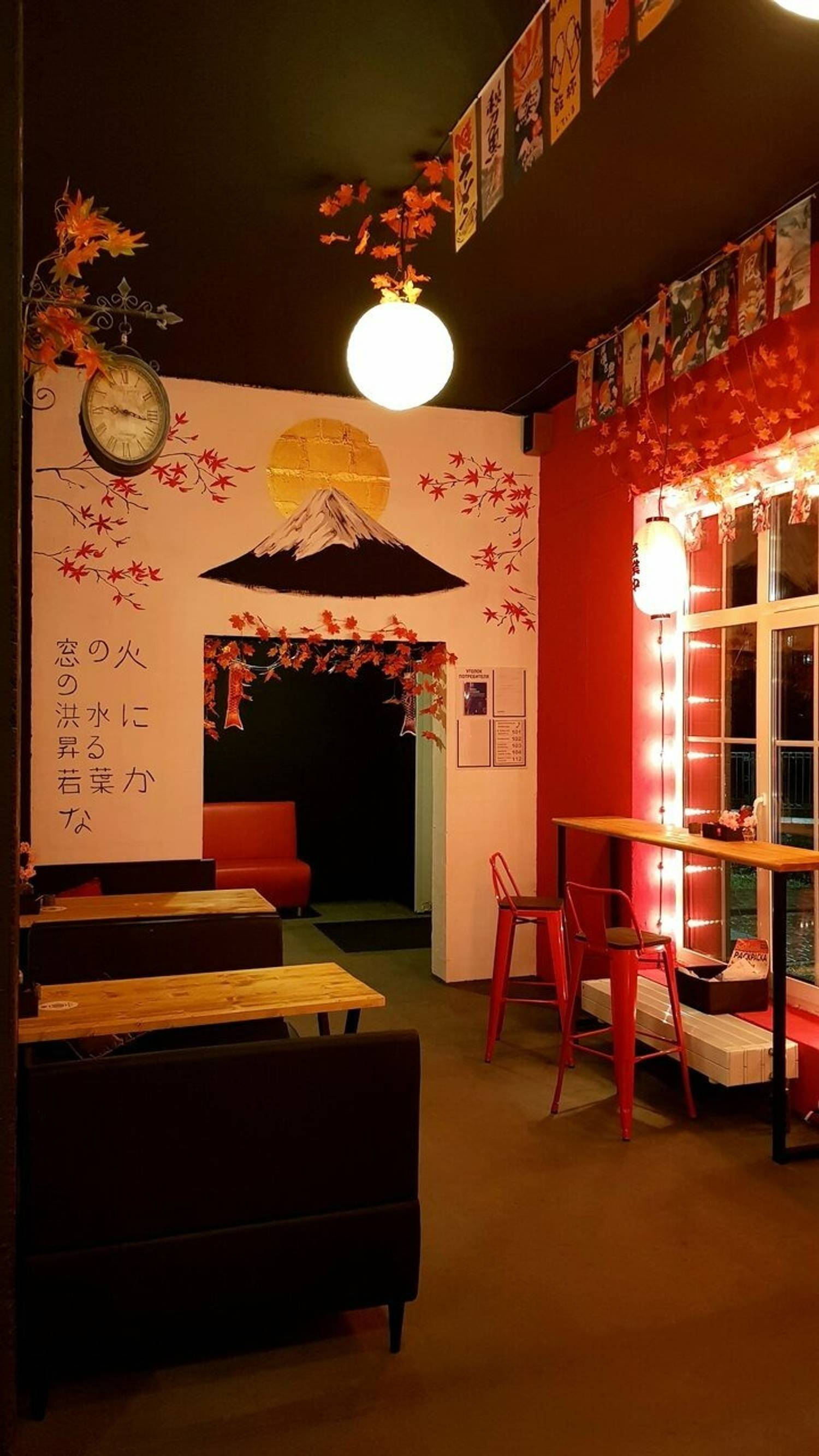 Атмосфера. Небольшой зал оформлен в японской эстетике: красные фонарики, ветви сакуры, кленовые листья и афиши на японском языке создают эффект уютного токийского заведения.