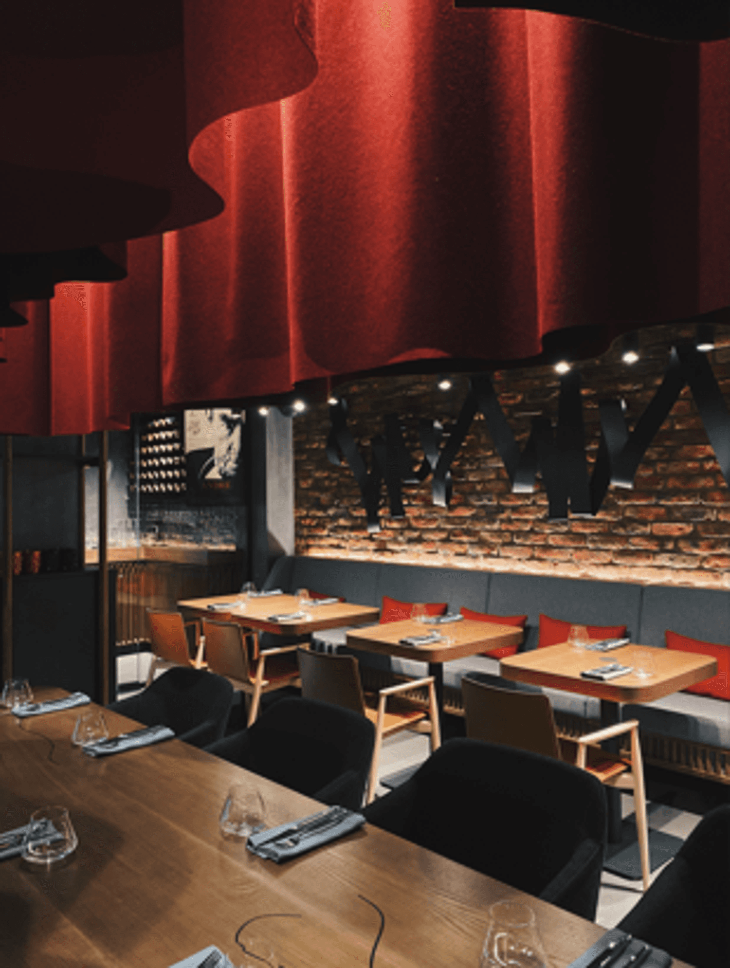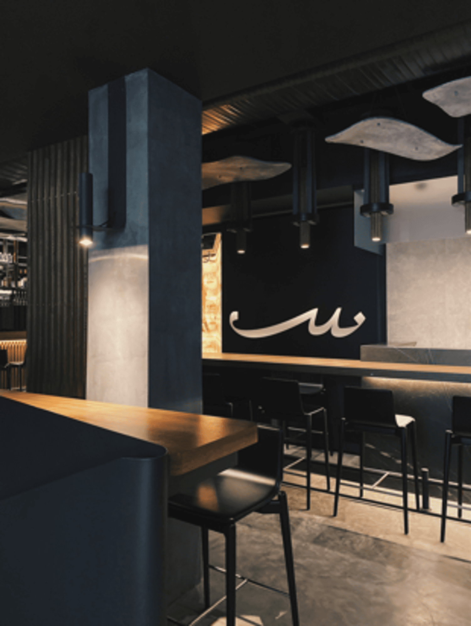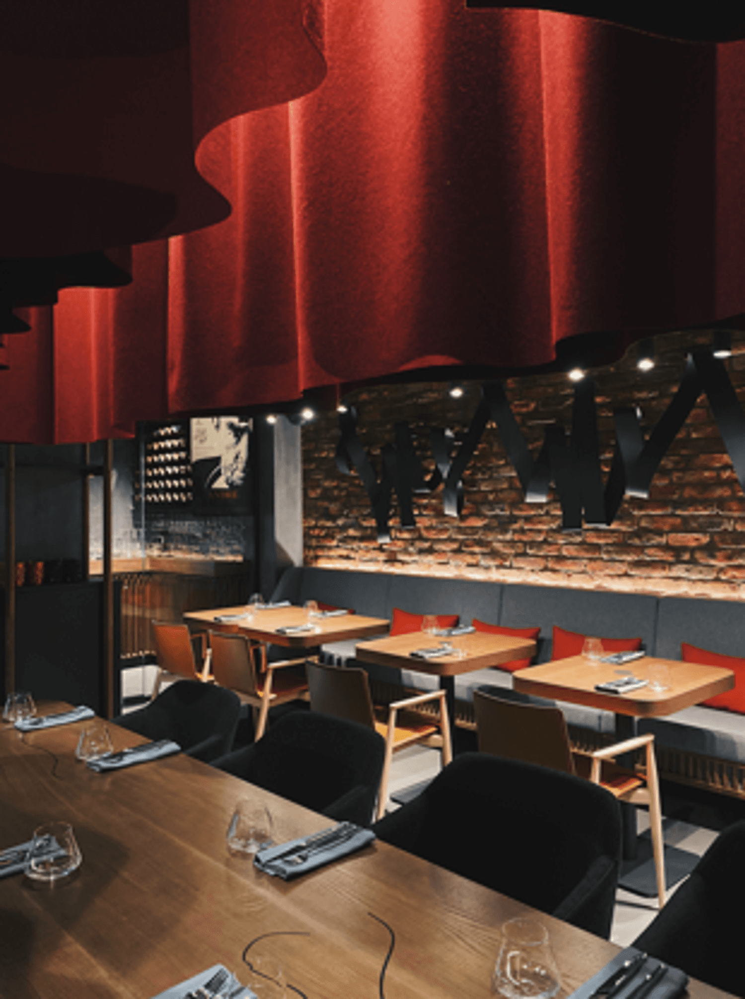 Атмосфера. Интерьер в темных, глубоких тонах с деревянной мебелью и акцентами винного цвета создает настроение спокойной таинственности. Мягкий точечный свет располагает к неторопливому вечеру, позволяя сосредоточиться на общении и вкусе.