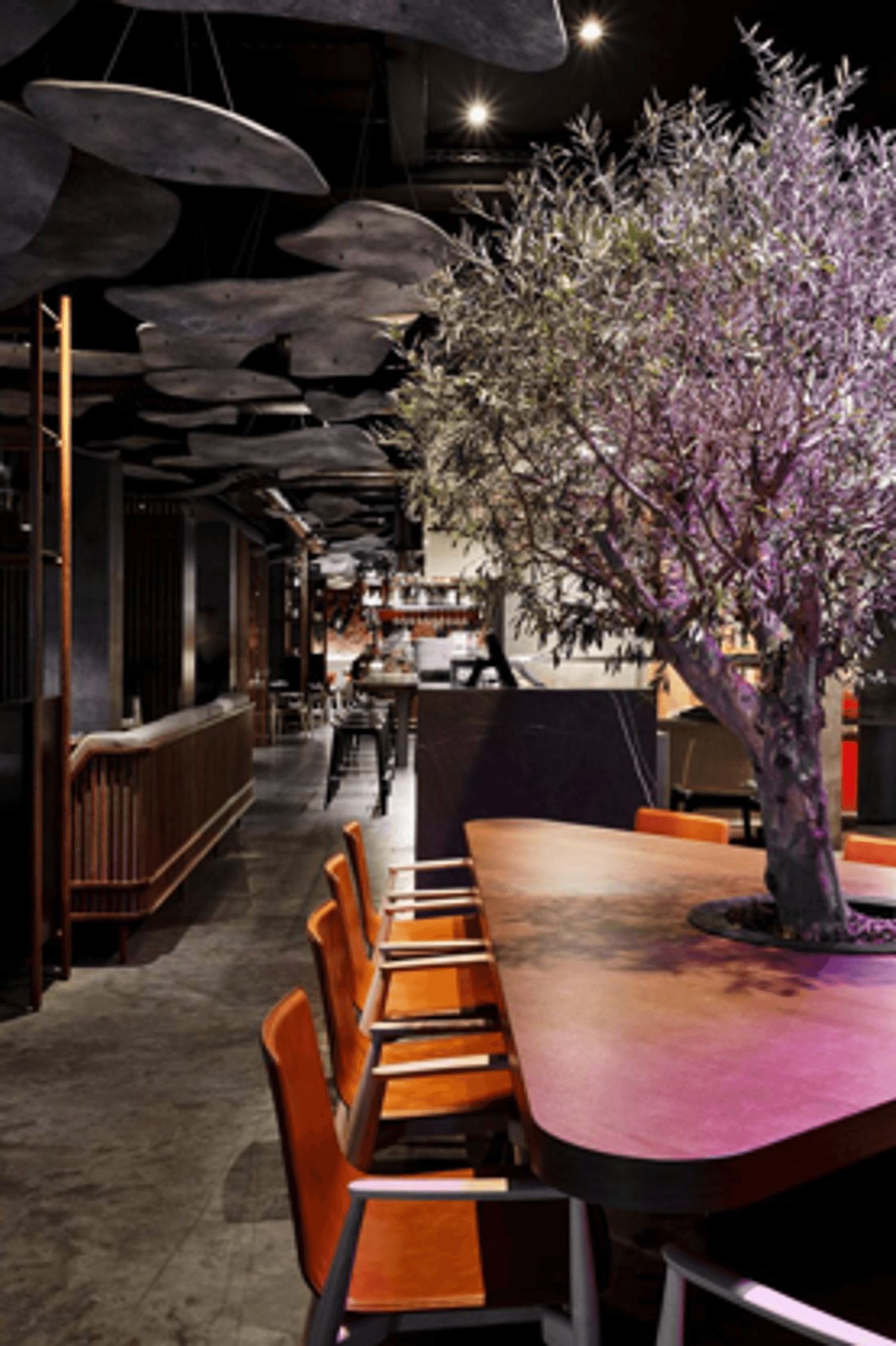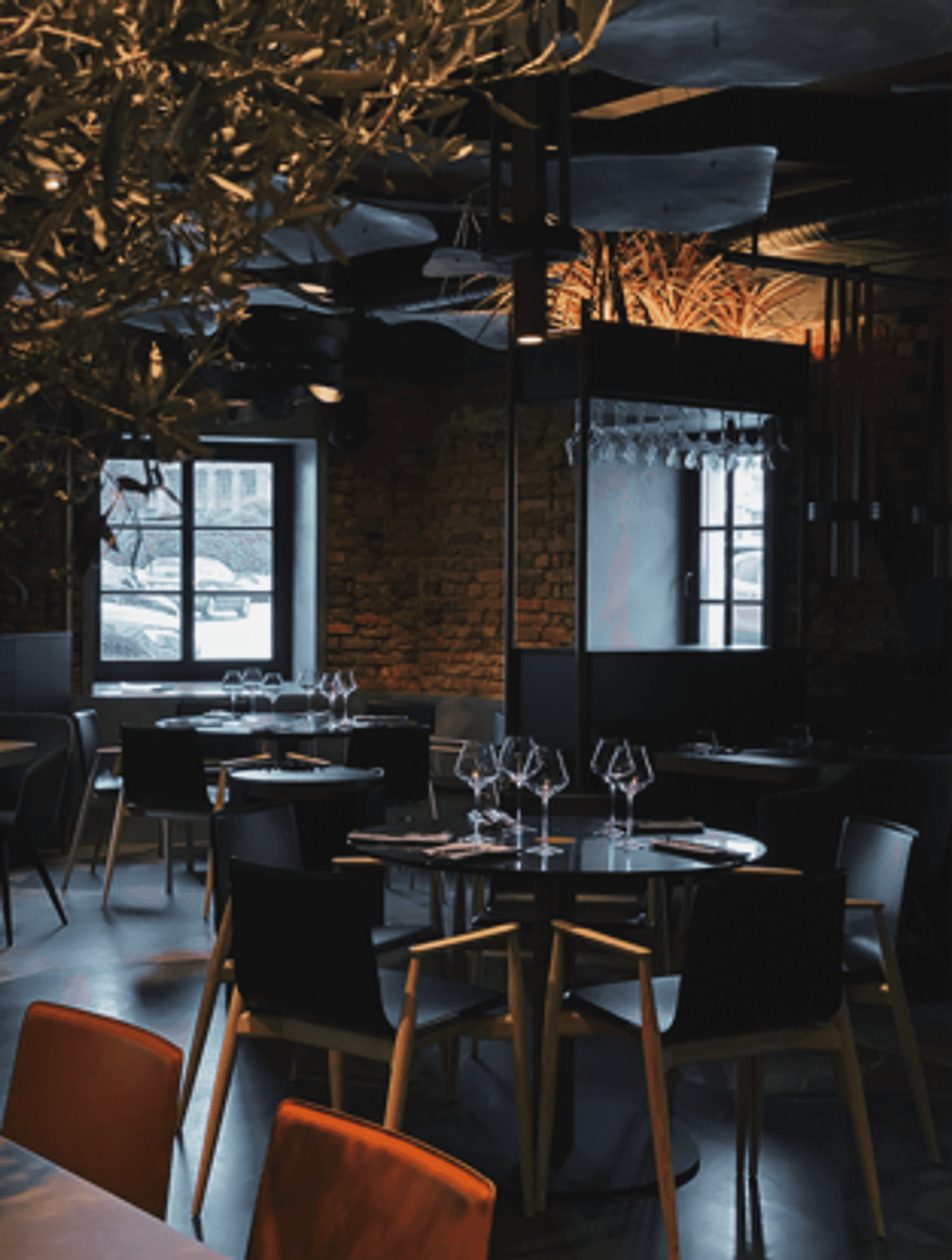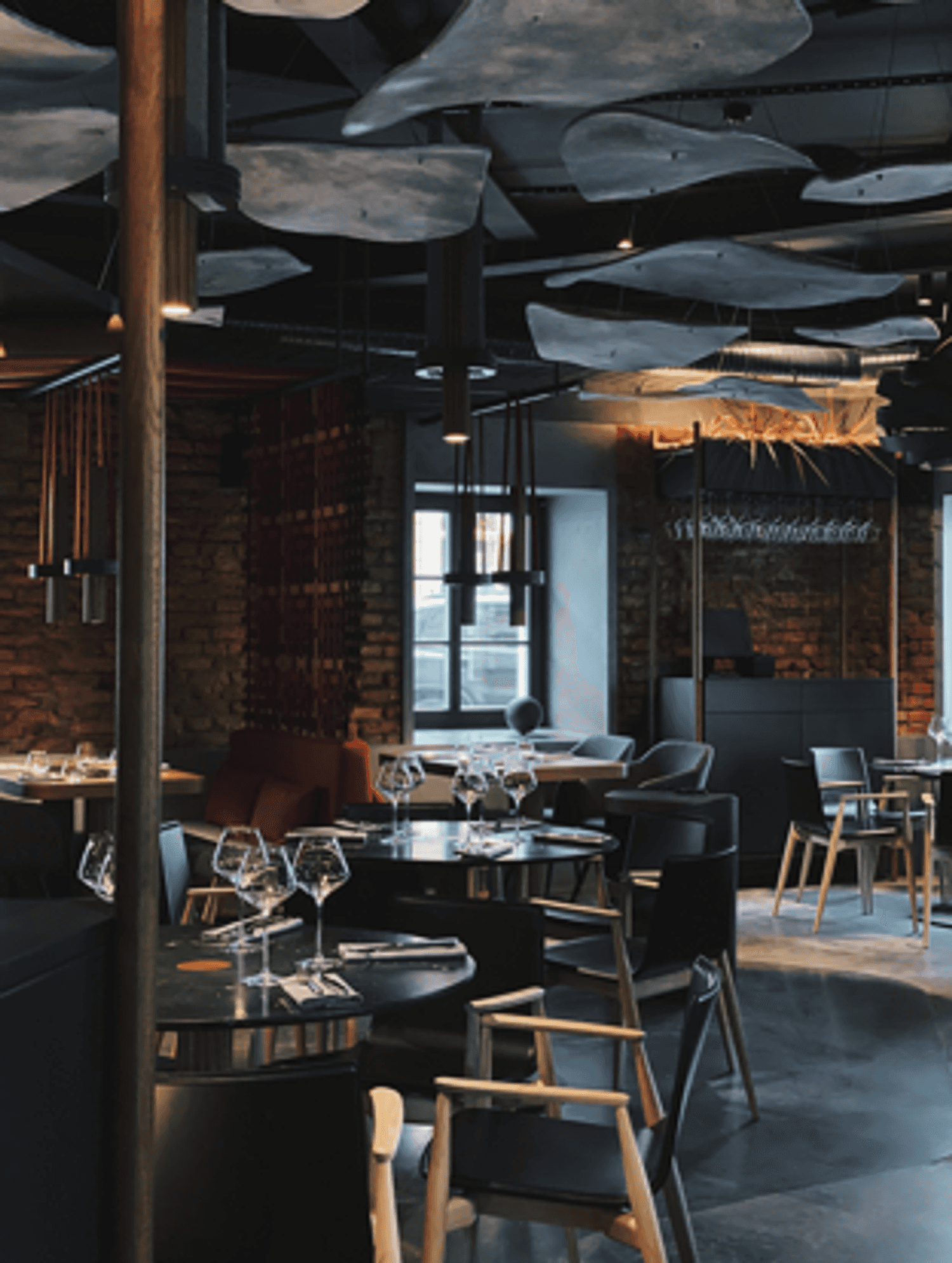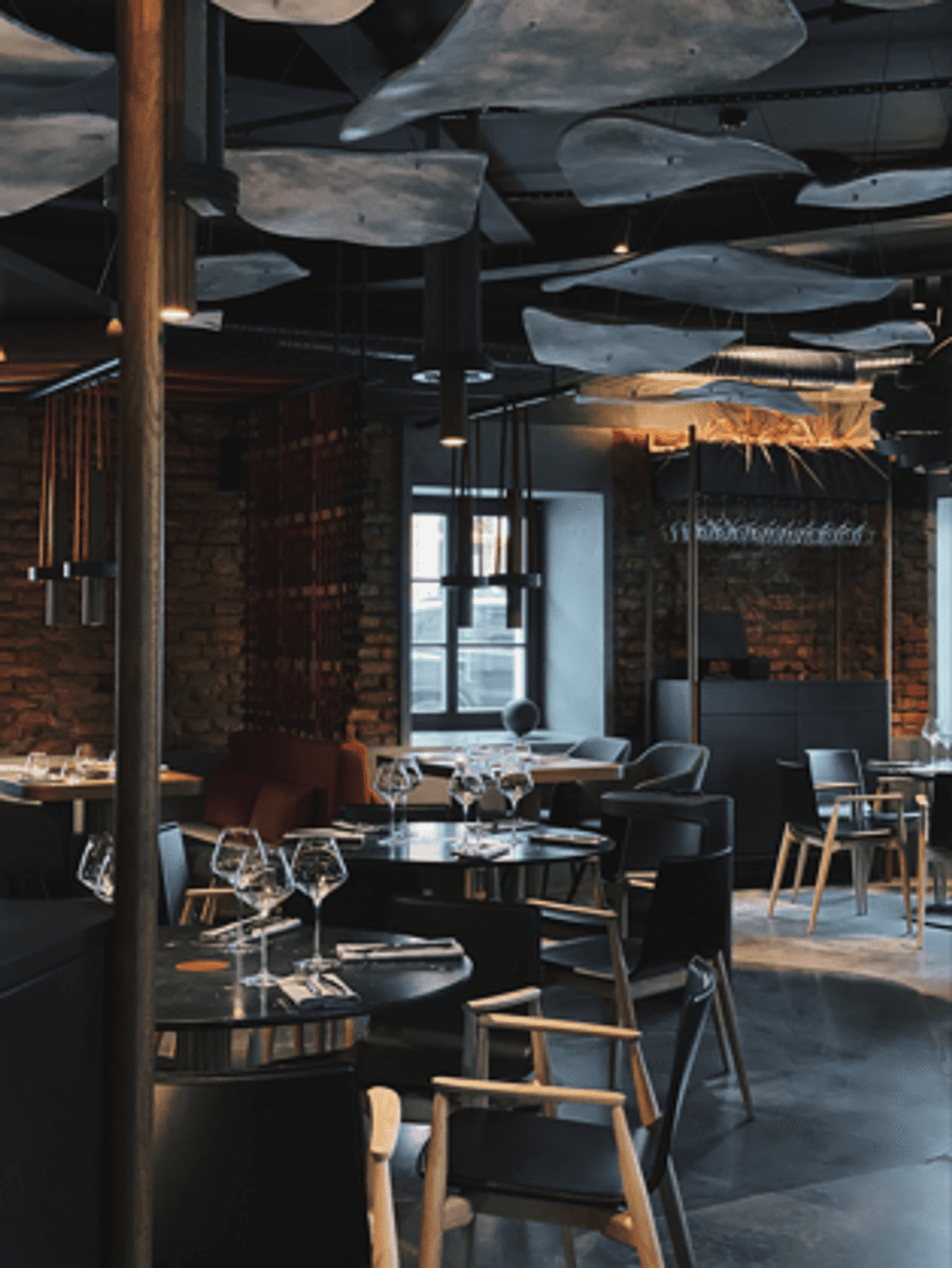 Атмосфера. Интерьер в темных, глубоких тонах с деревянной мебелью и акцентами винного цвета создает настроение спокойной таинственности. Мягкий точечный свет располагает к неторопливому вечеру, позволяя сосредоточиться на общении и вкусе.