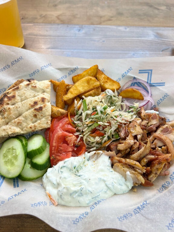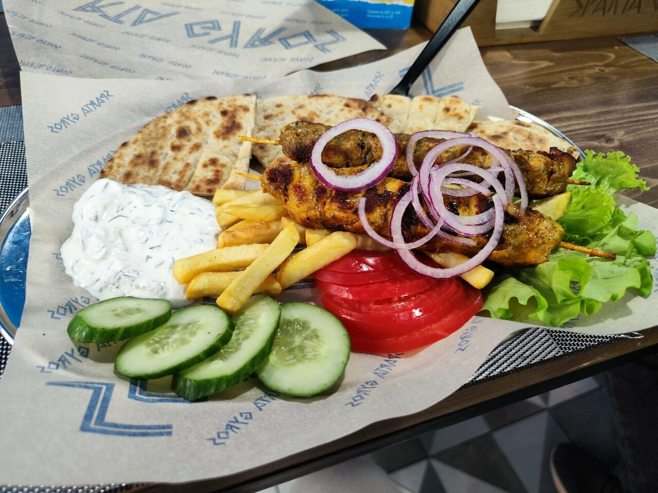 Еда и напитки. В меню — классические гирос с курицей, свининой или фалафелем, которые подают в лаваше с овощами, соусом и картофелем. Его готовят как в пите, так и в киприаки. Также можно заказать греческий салат, картофель по-деревенски и напитки. Из напитков есть сок, лимонад, пиво, чай и классический кофе.