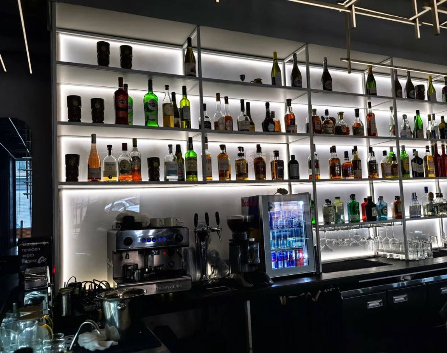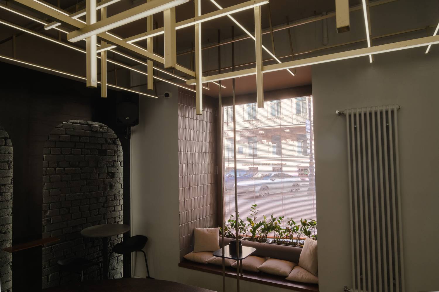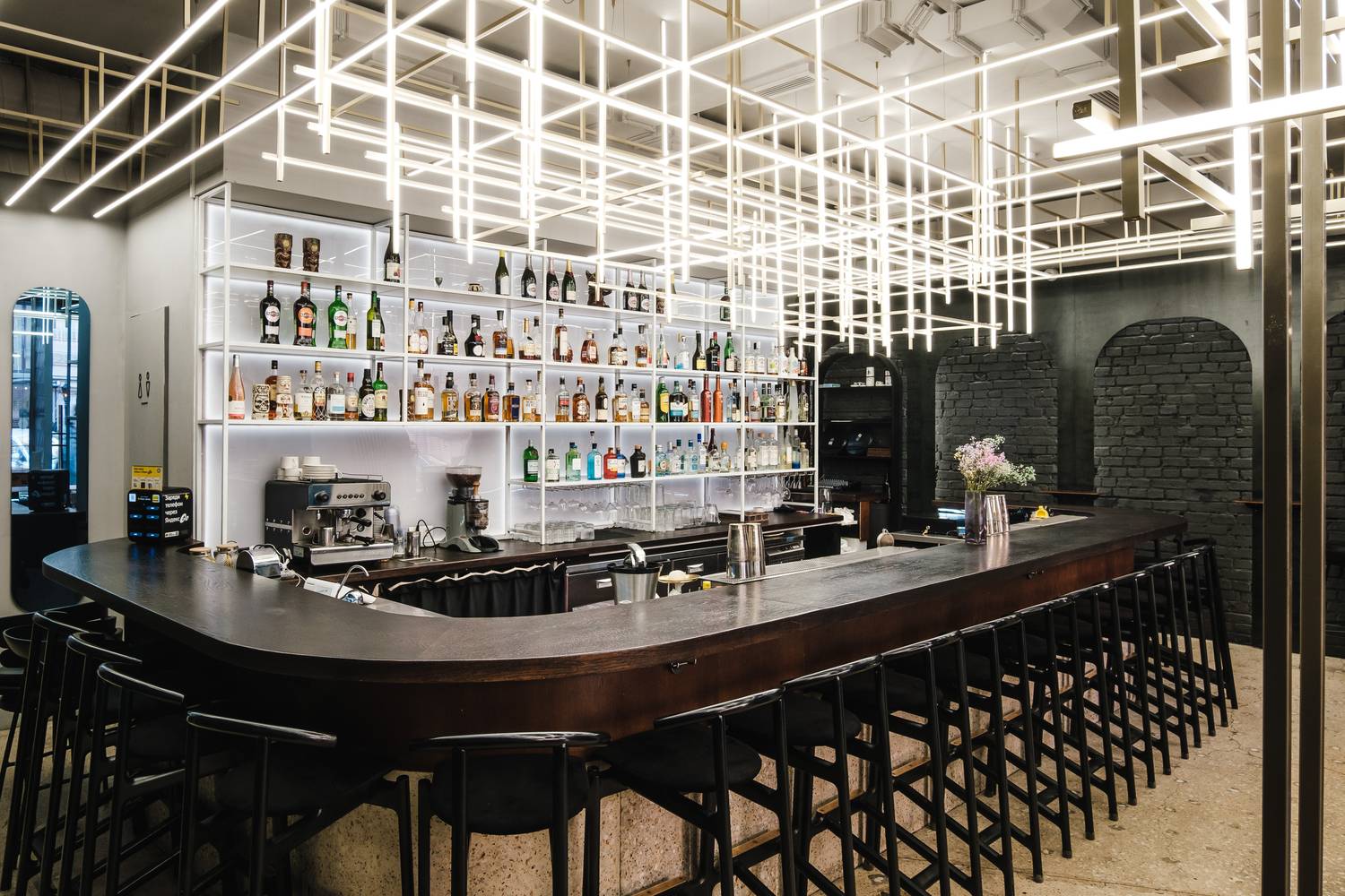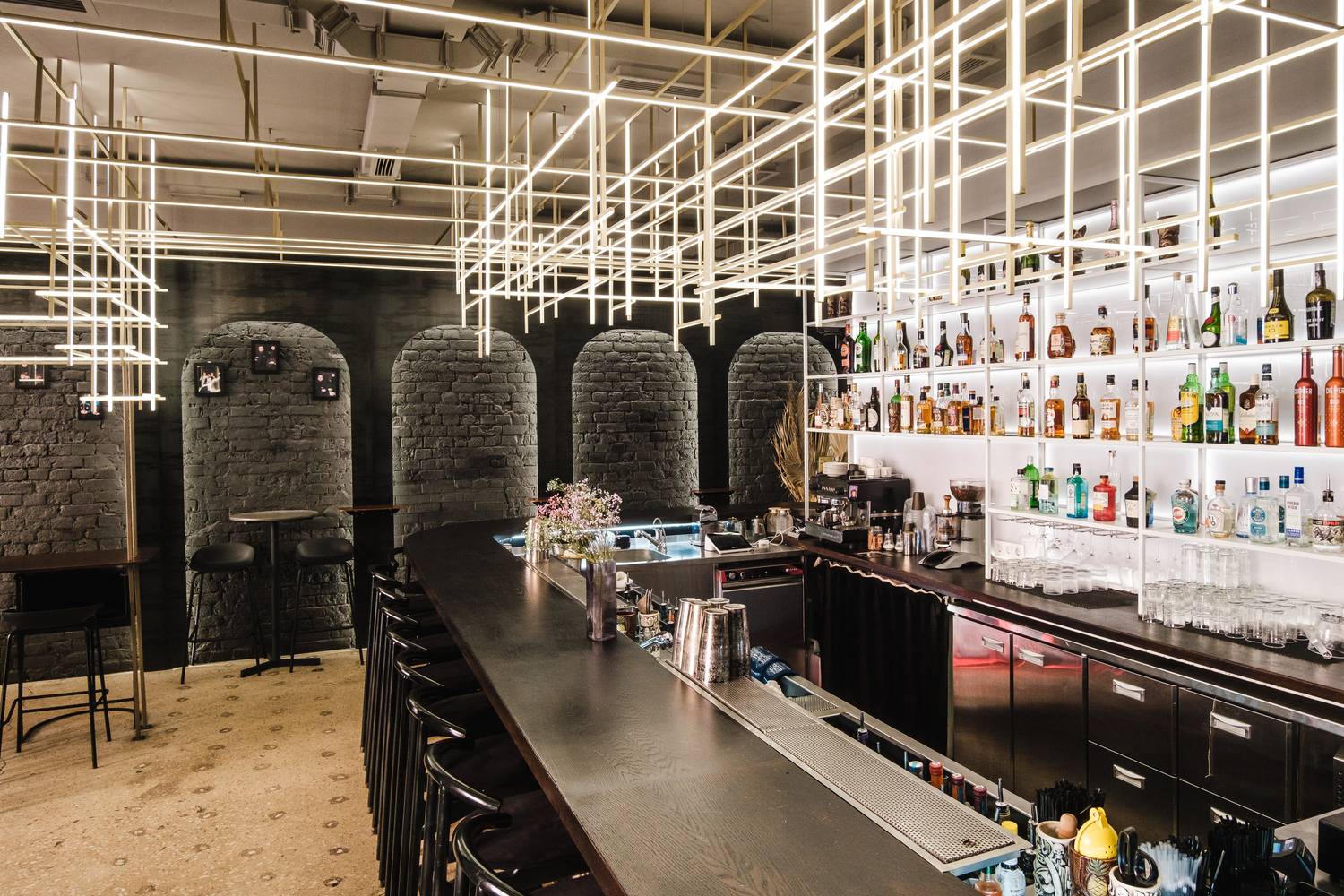 Атмосфера. Интерьер в духе конструктивизма с бетоном, металлом и нейтральными оттенками создает лаконичный фон. Пространство преображает инсталляция из перекрещивающихся светильников — они создают причудливую текстуру, напоминающую игровую графику и добавляющую помещению сюрреалистичности. Главные точки притяжения — бар, где работают миксологи, и сцена с живыми выступлениями.