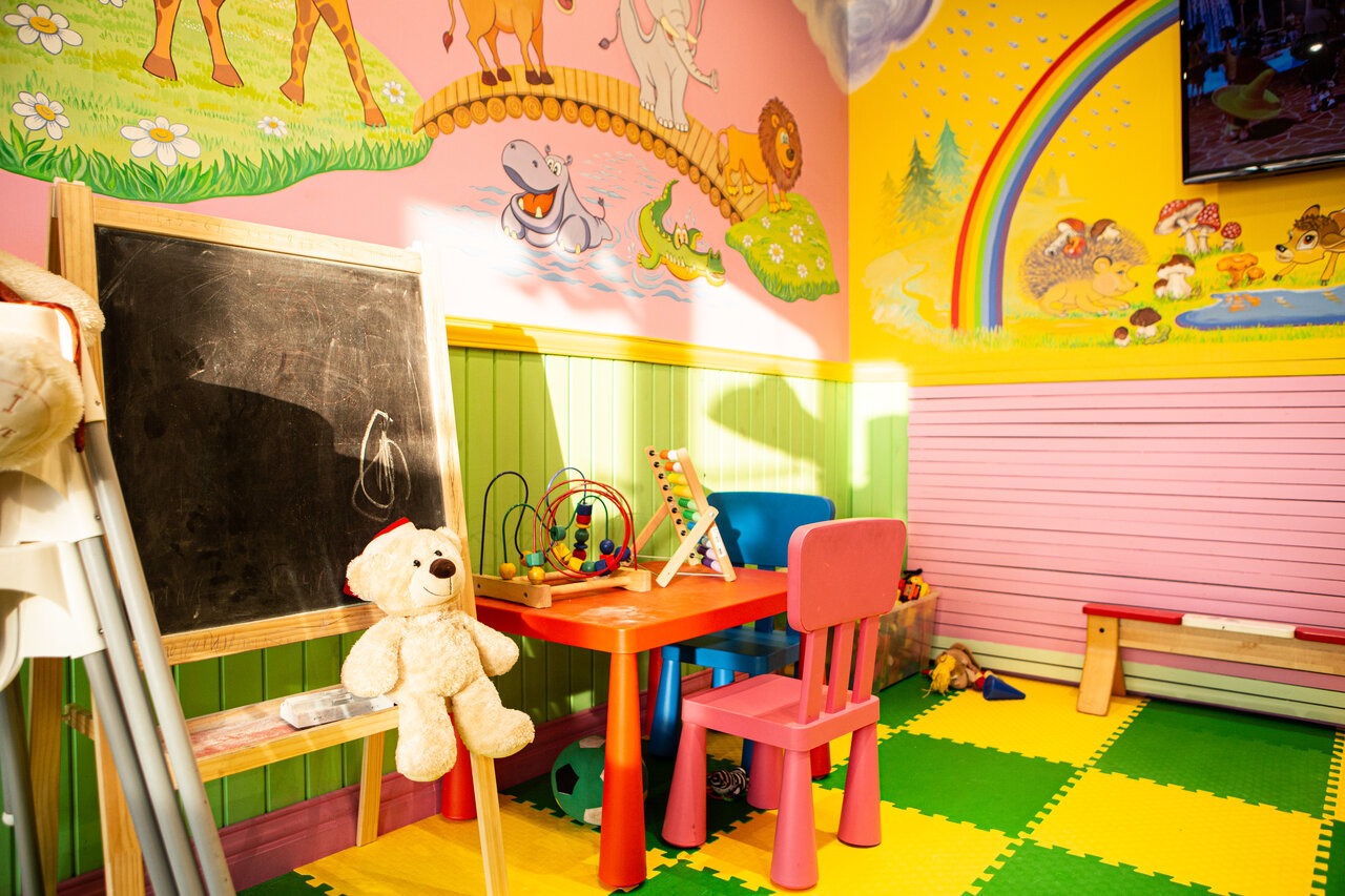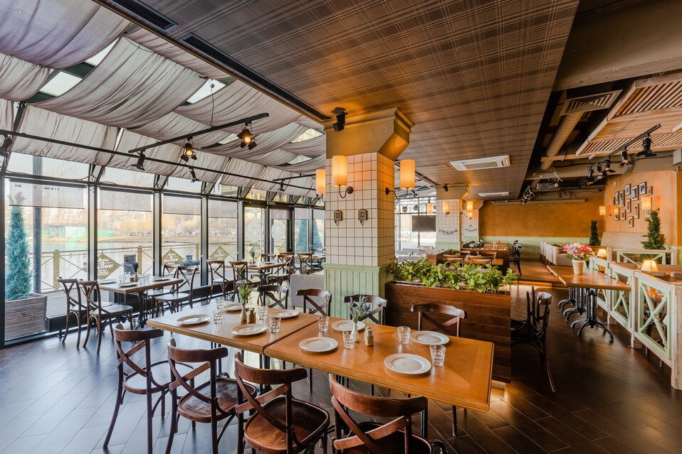 Атмосфера. Светлый интерьер с природными элементами: живыми растениями, деревянными в виде шкафов и сетчатыми бирюзовыми перегородками. Внимание гостей привлекают белоснежные полотна на потолке, напоминающие паруса кораблей, и колонна, отделанная белой плиткой. Для детей есть игровая комната с рисунками животных, мольбертом и горкой.