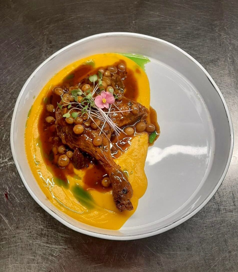 Еда и напитки. В меню — европейская, грузинская и азиатская: тыквенный крем-суп с пшеничным тостом, палтус с овощами и кремом юдзу, тигровые креветки в азиатском стиле и стейк стриплоин с вишневым демиглас и ролл с угрем и авокадо. Также здесь собрали авторские десерты: боровик на поляне и кокос с пюре из маракуйи.