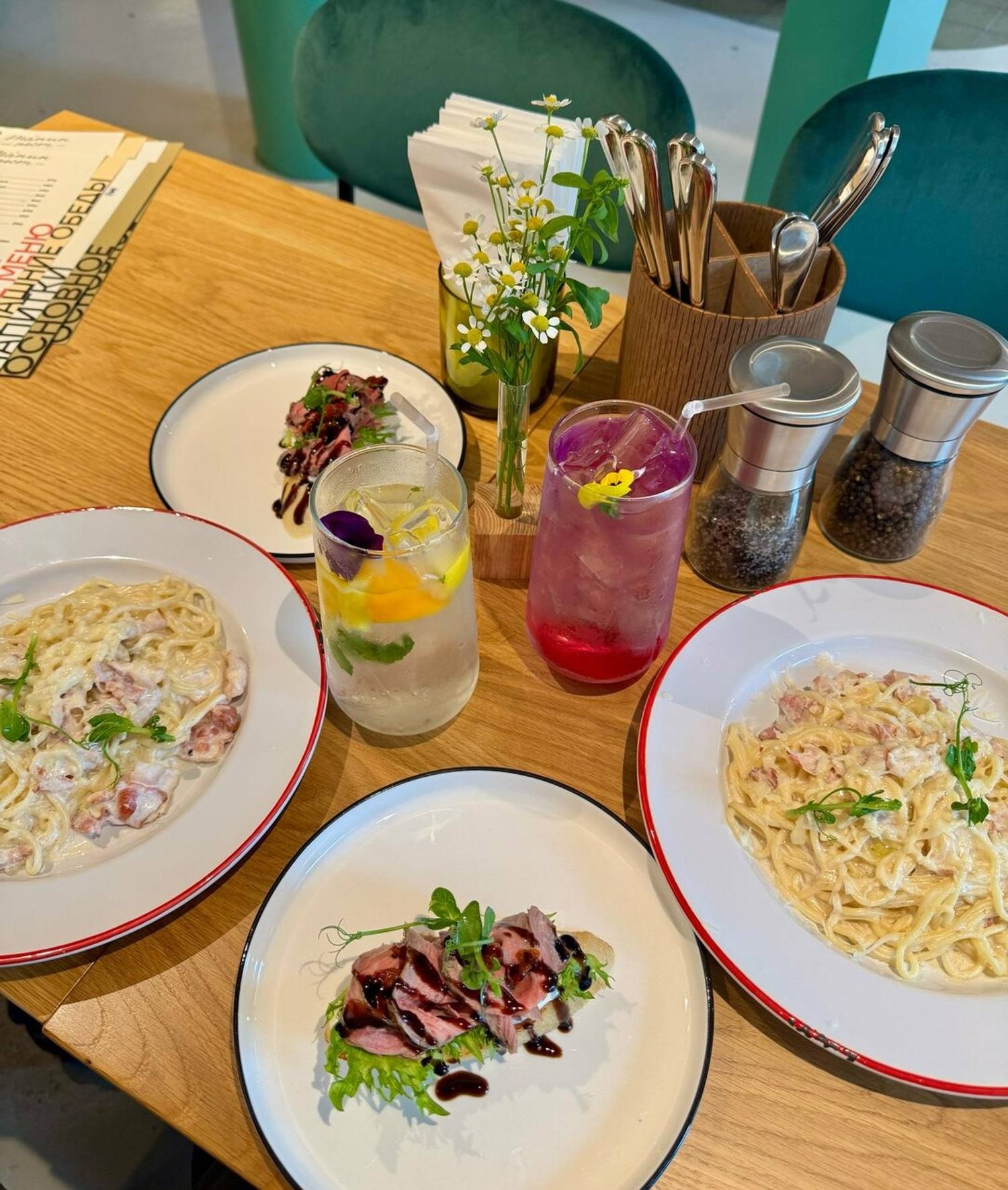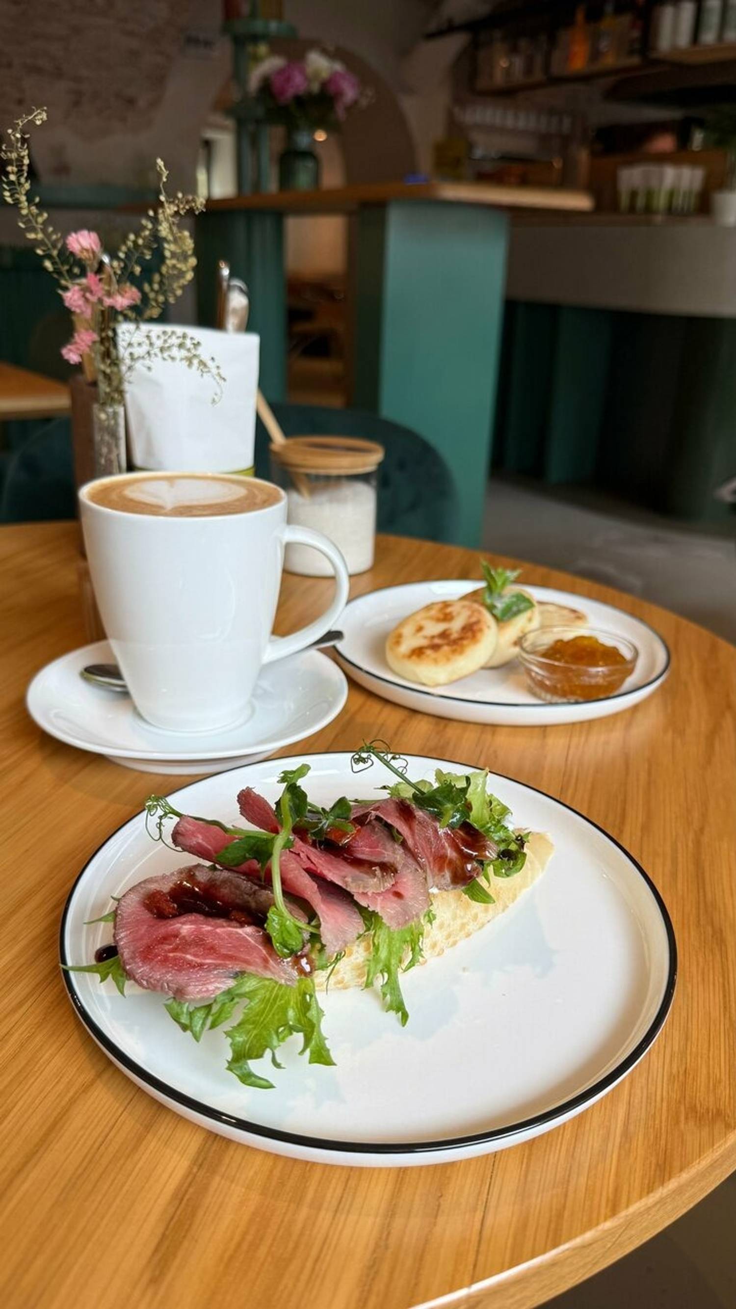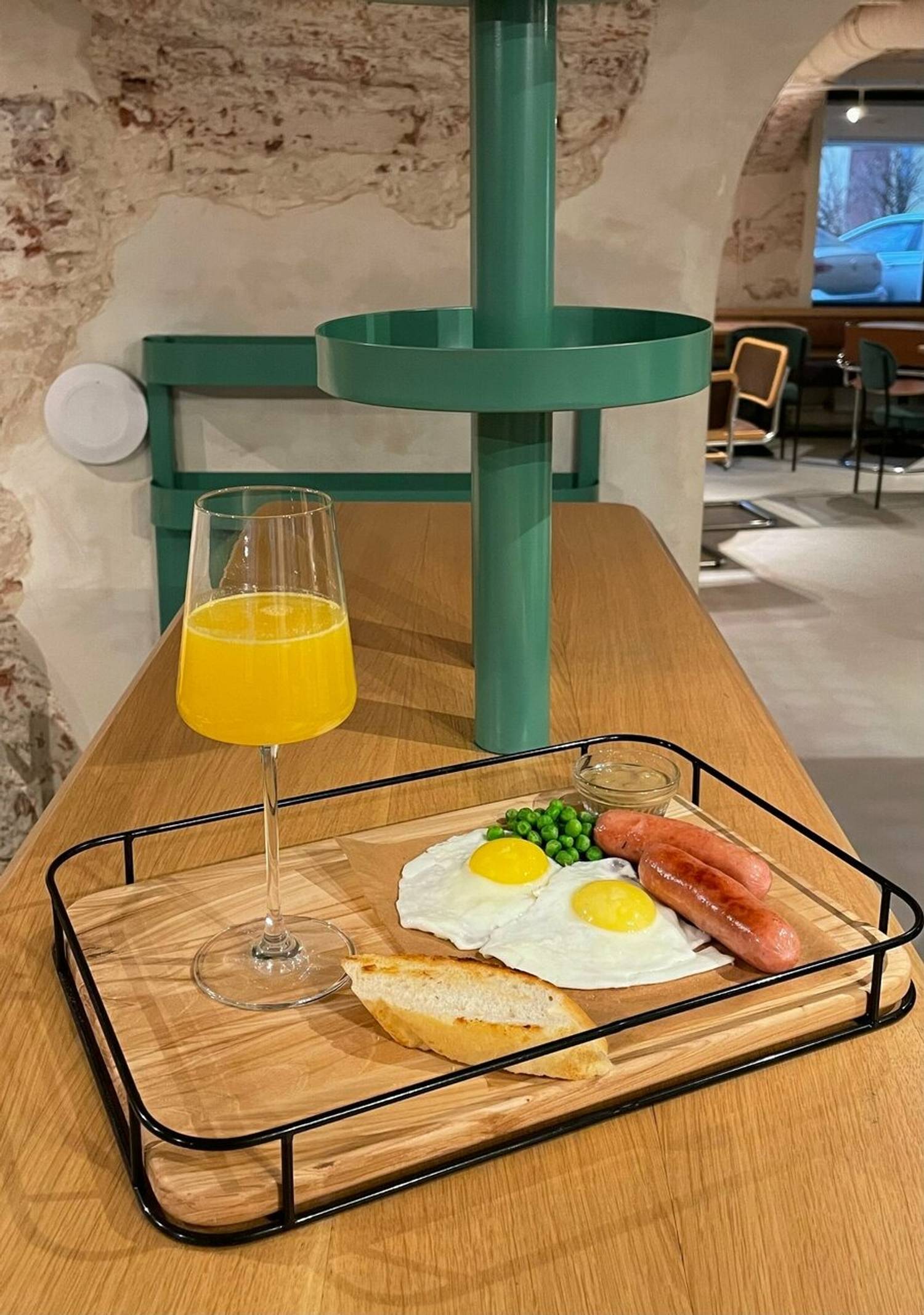 Еда и напитки. В меню — привычные блюда на каждый день: от мимозы с угрем и борща с говяжьей грудинкой и шпиком. Завтраки действуют в течение всего дня: глазунья с сосисками и горошком, омлет с моцареллой. Также есть обеды с супом, салатом и горячим на выбор.