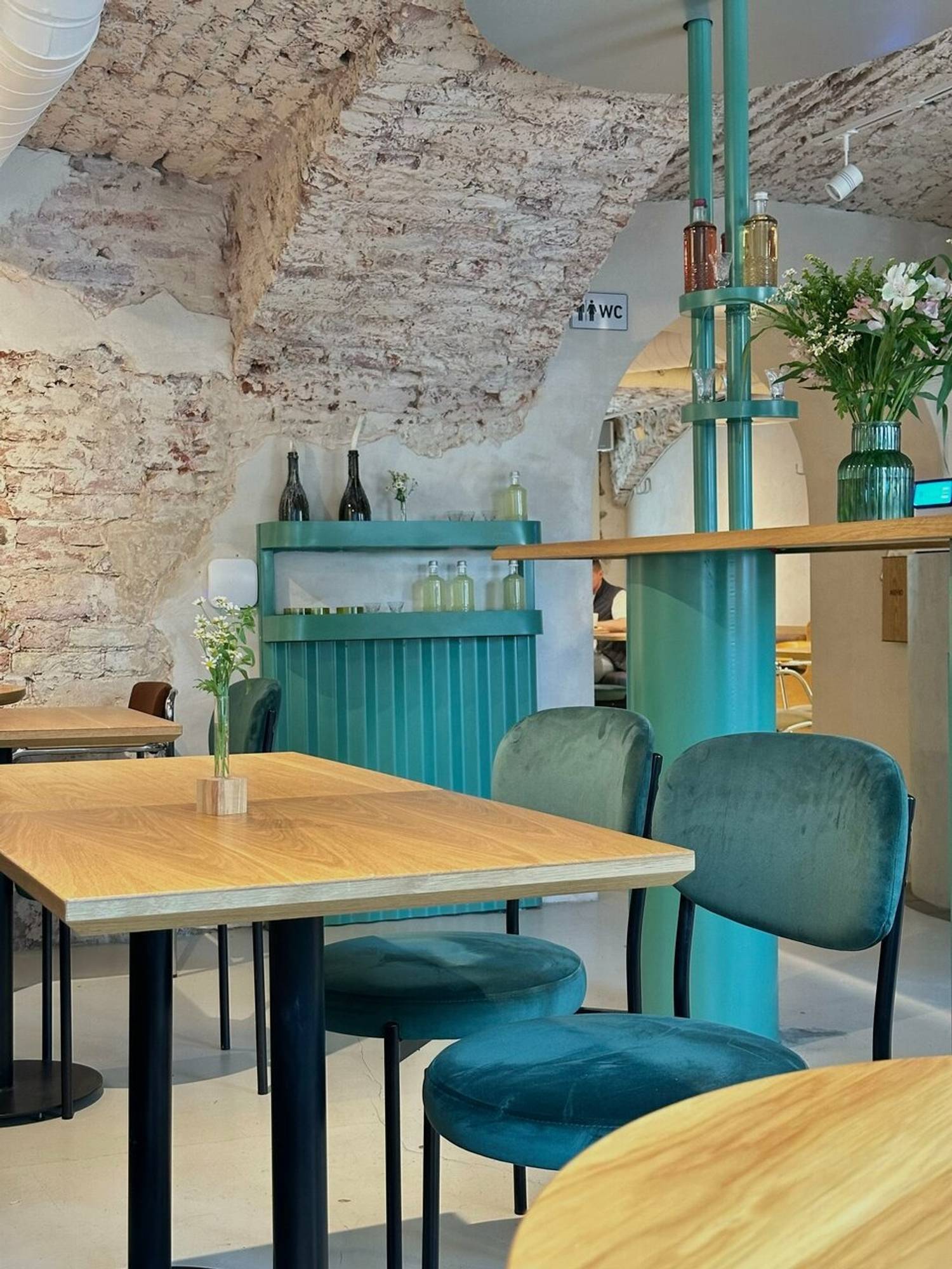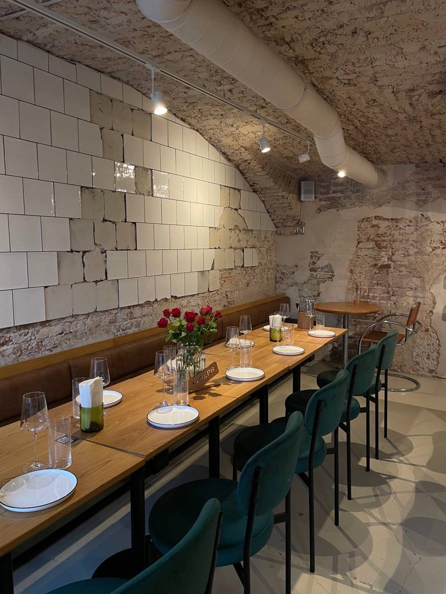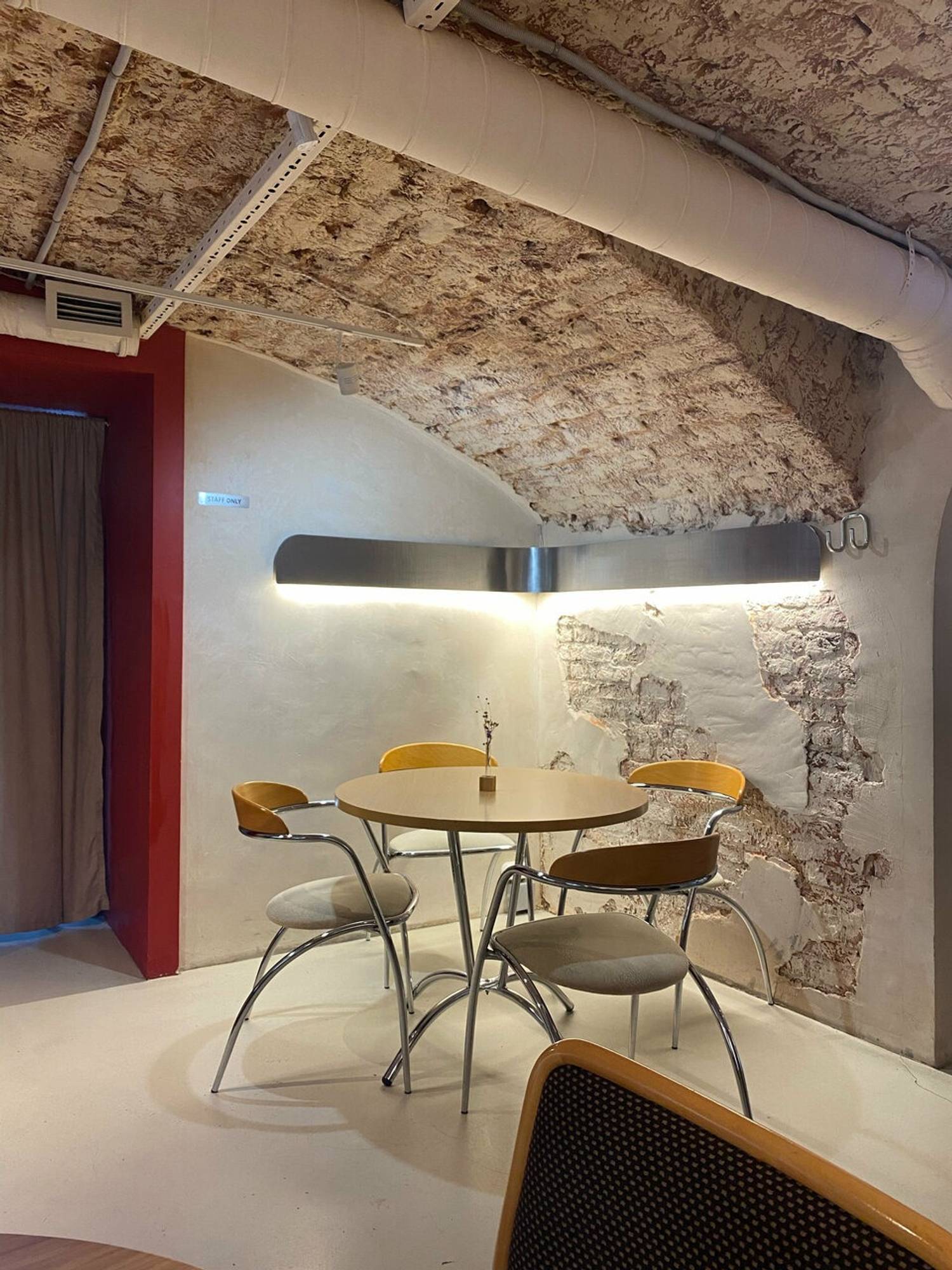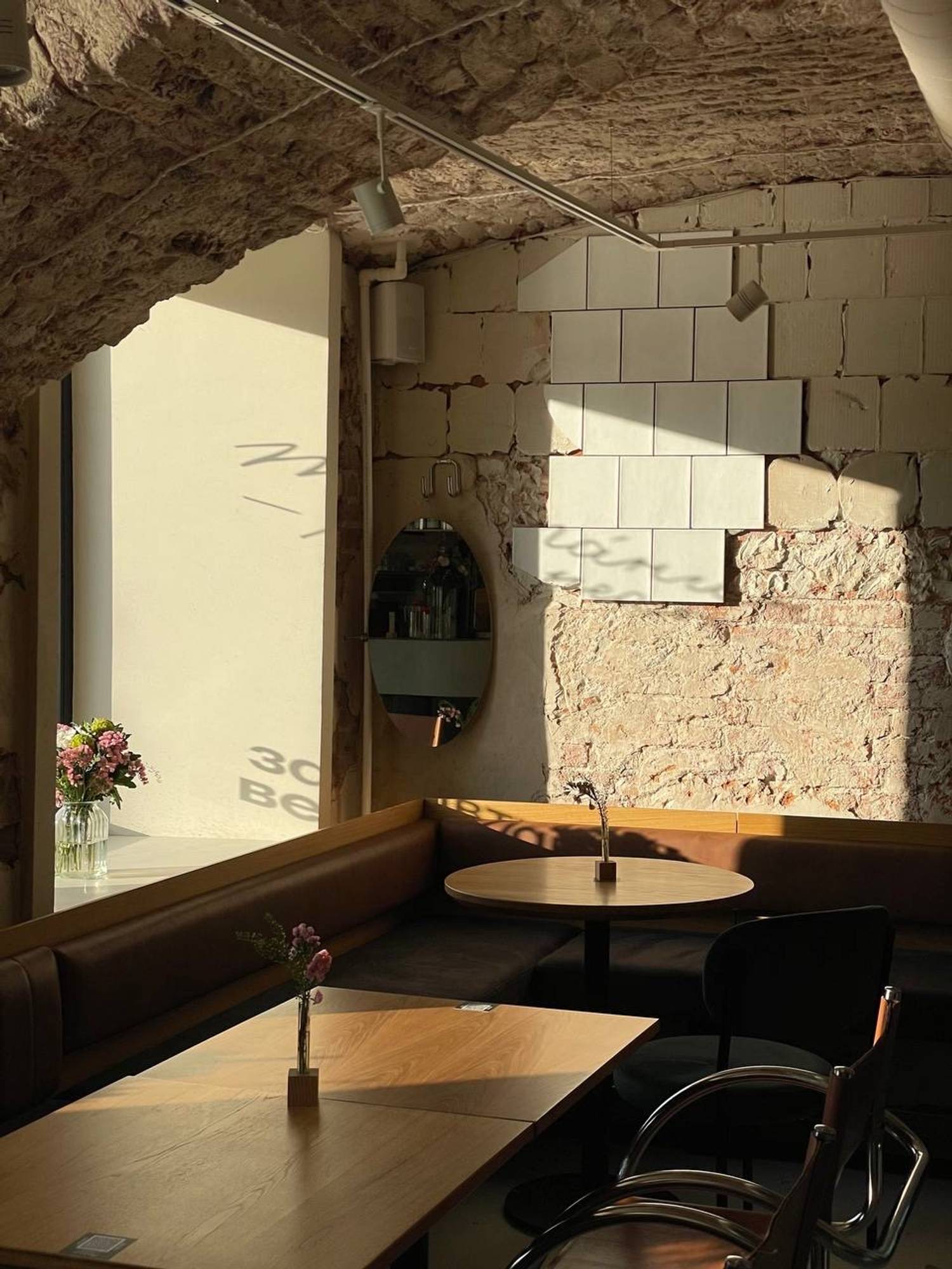 Атмосфера. Светлое камерное пространство с кирпичными арочными сводами, большими окнами, которые выходят на Фонтанку. Мягкое освещение и винтажные стулья подчеркивают сдержанный стиль и располагают к неспешным завтракам.