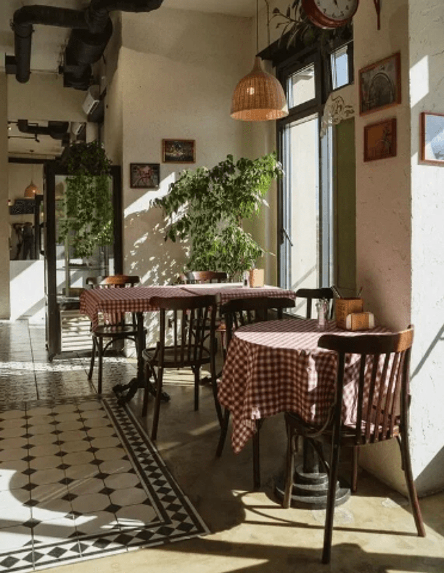 Атмосфера. Пространство со светлым деревом, узорчатой плиткой и панорамными окнами создает ощущение легкости и простора. Здесь удобные кожаные стулья, минималистичный декор и мягкое освещение: все это формирует нейтральную, но уютную обстановку, подходящую как для быстрого ланча, так и для спокойного ужина.