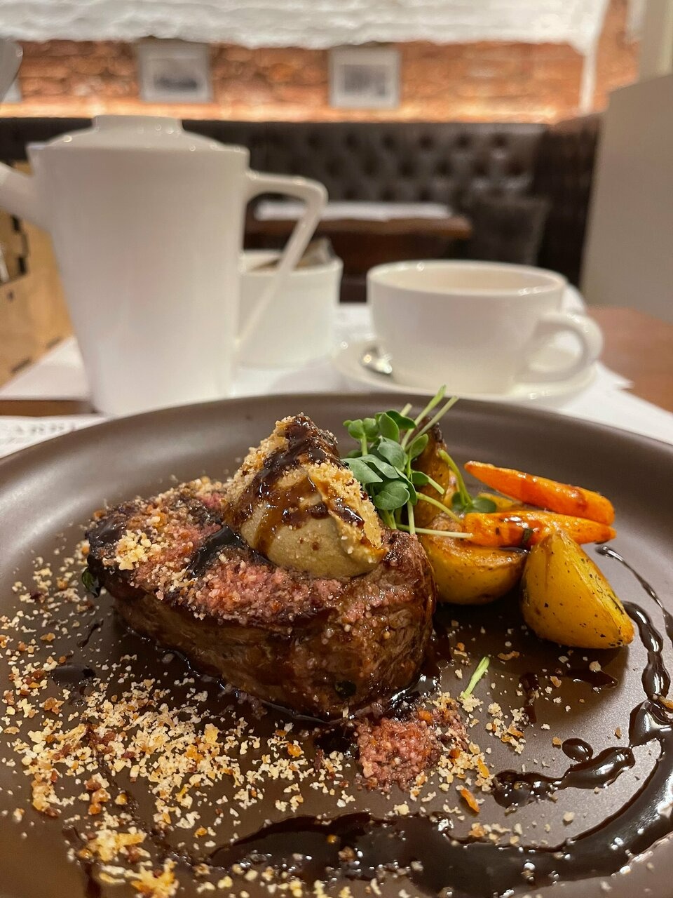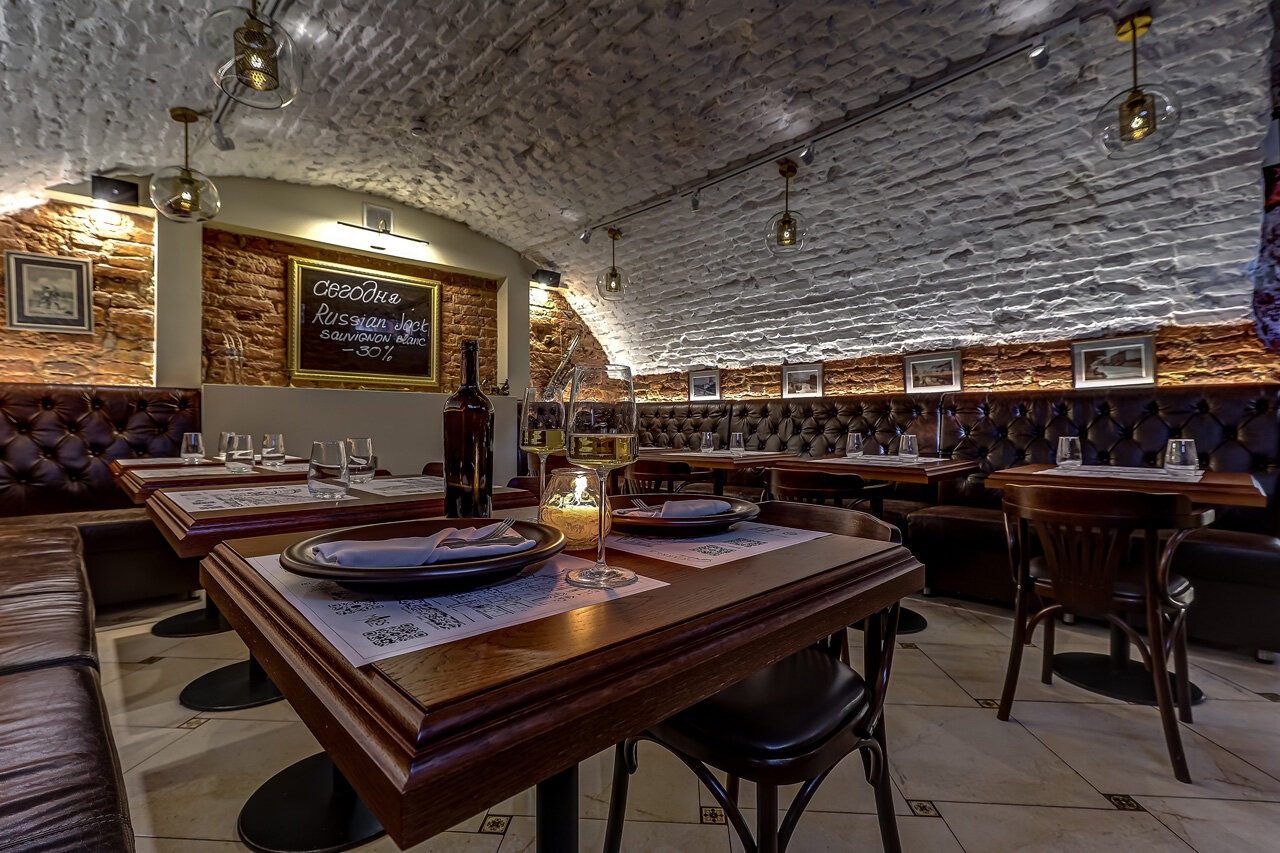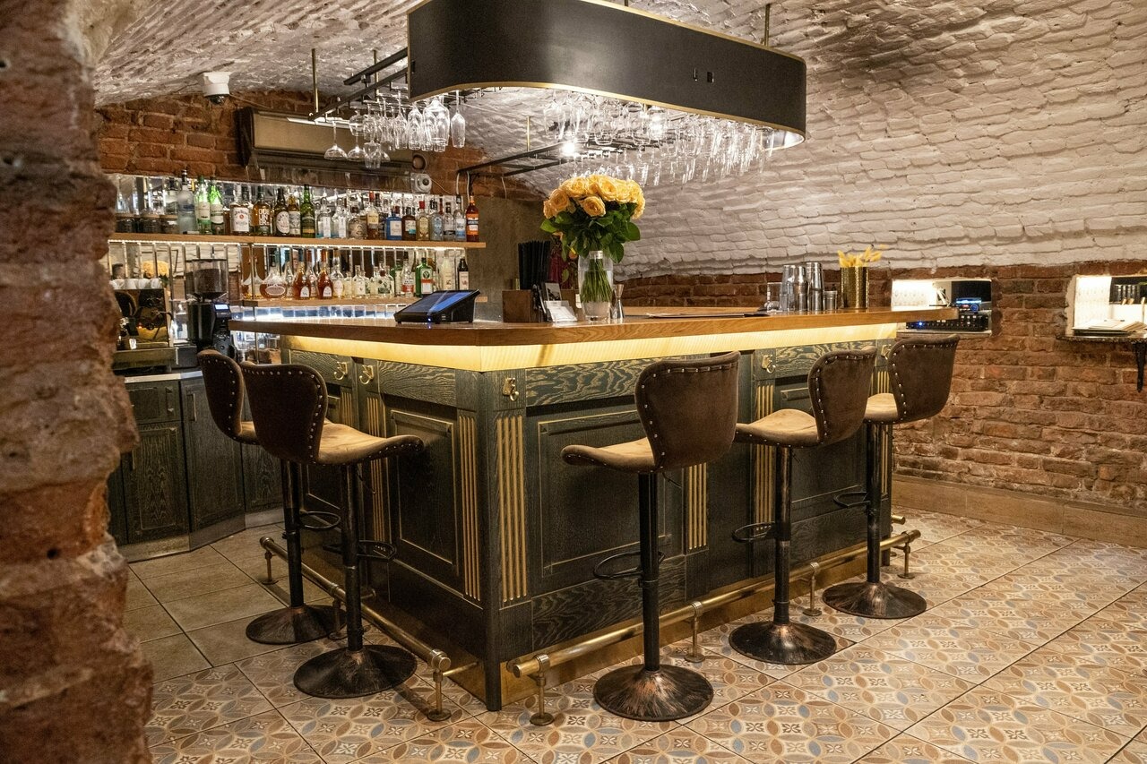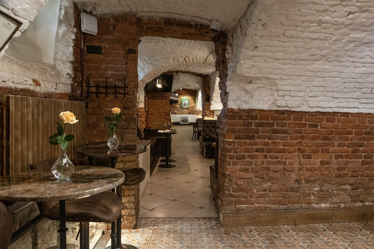 Атмосфера. Обстановку цокольного этажа поддерживают кирпичные стены и своды, а роскоши добавляют кожаные диваны и фигуры в античном стиле. Гости могут расположиться не только за столами в кирпичных залах с винтажными фотографиями, но и барной стойкой с подсветкой.