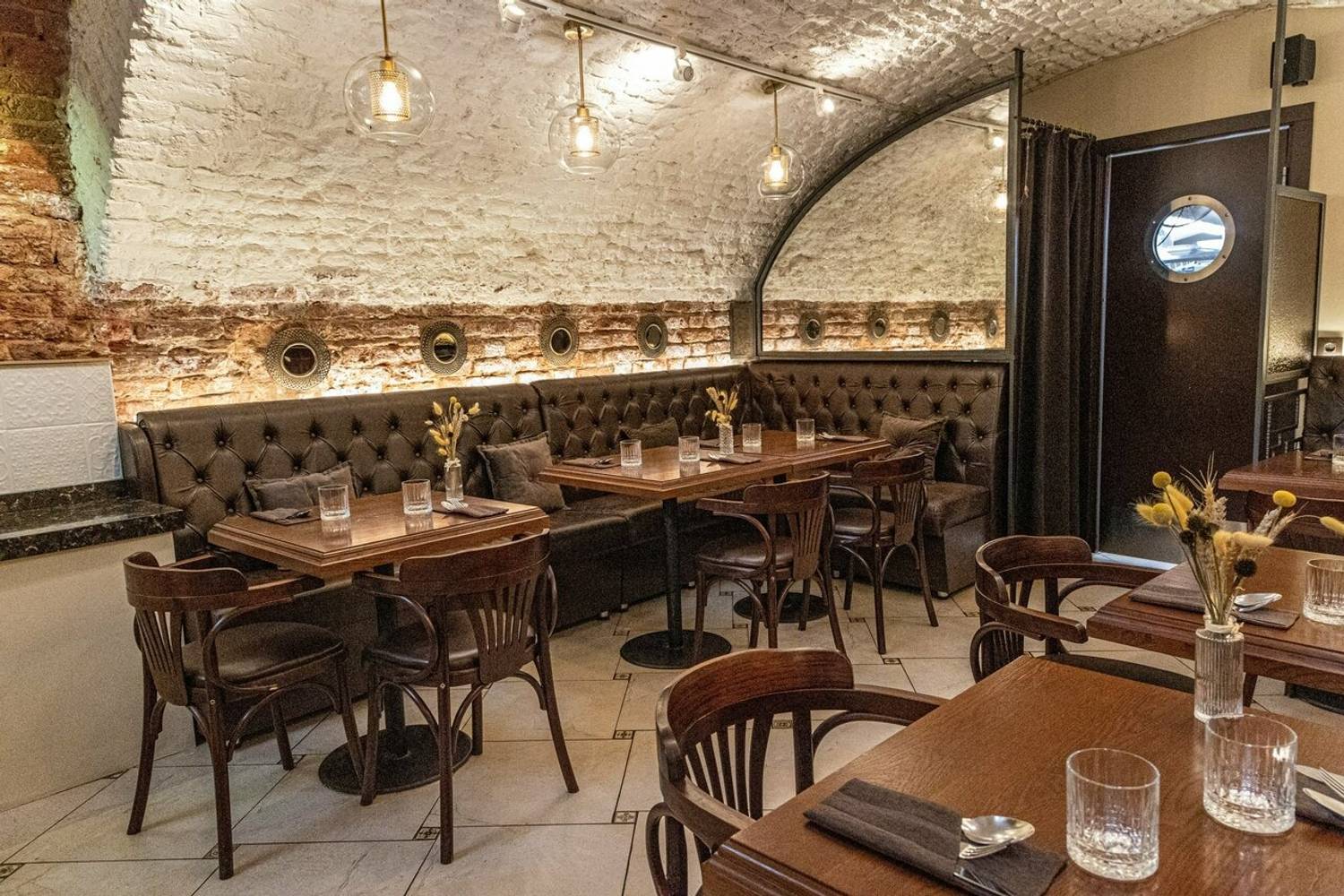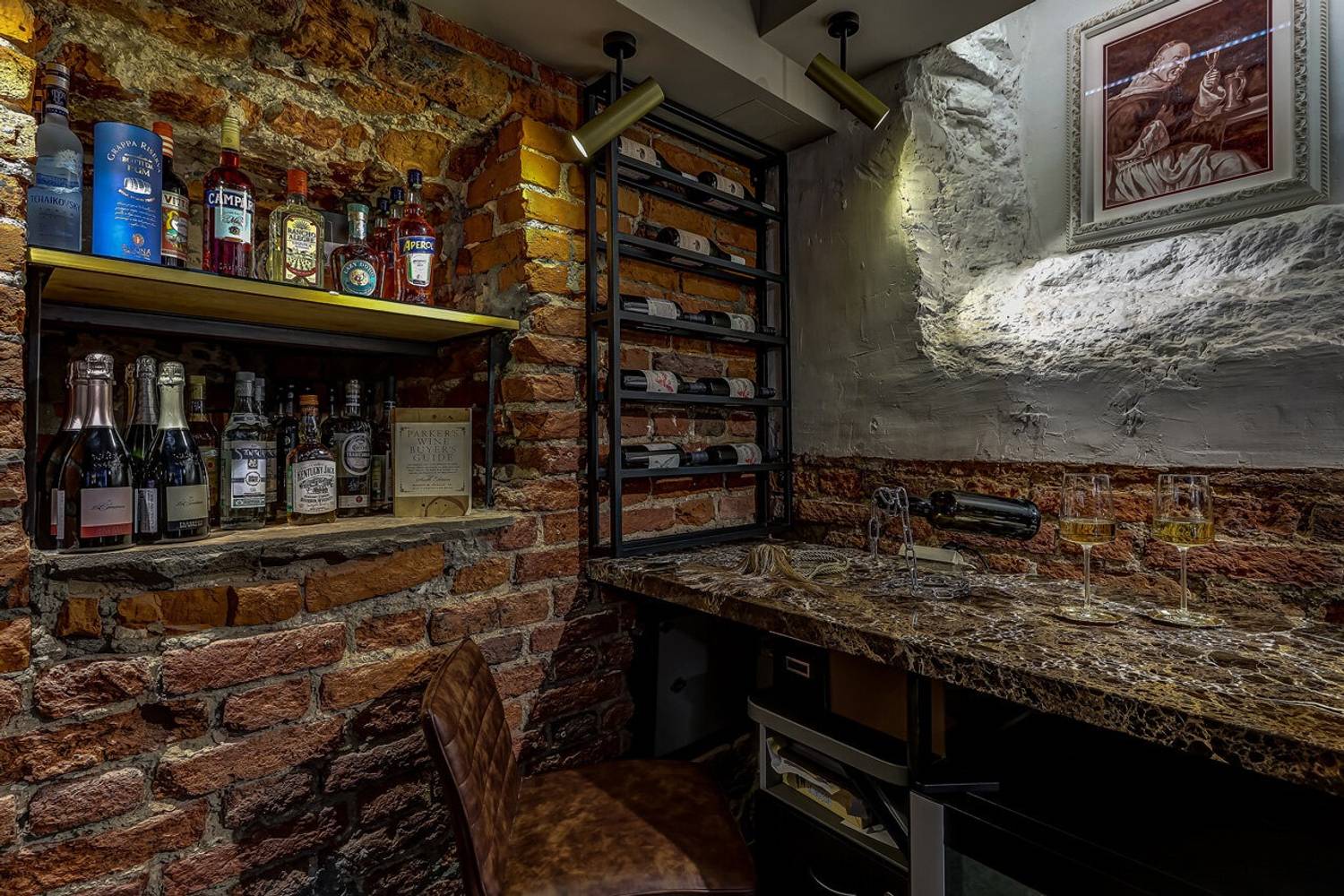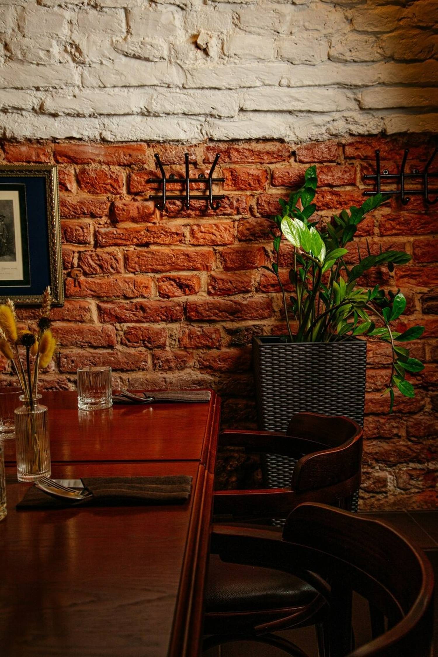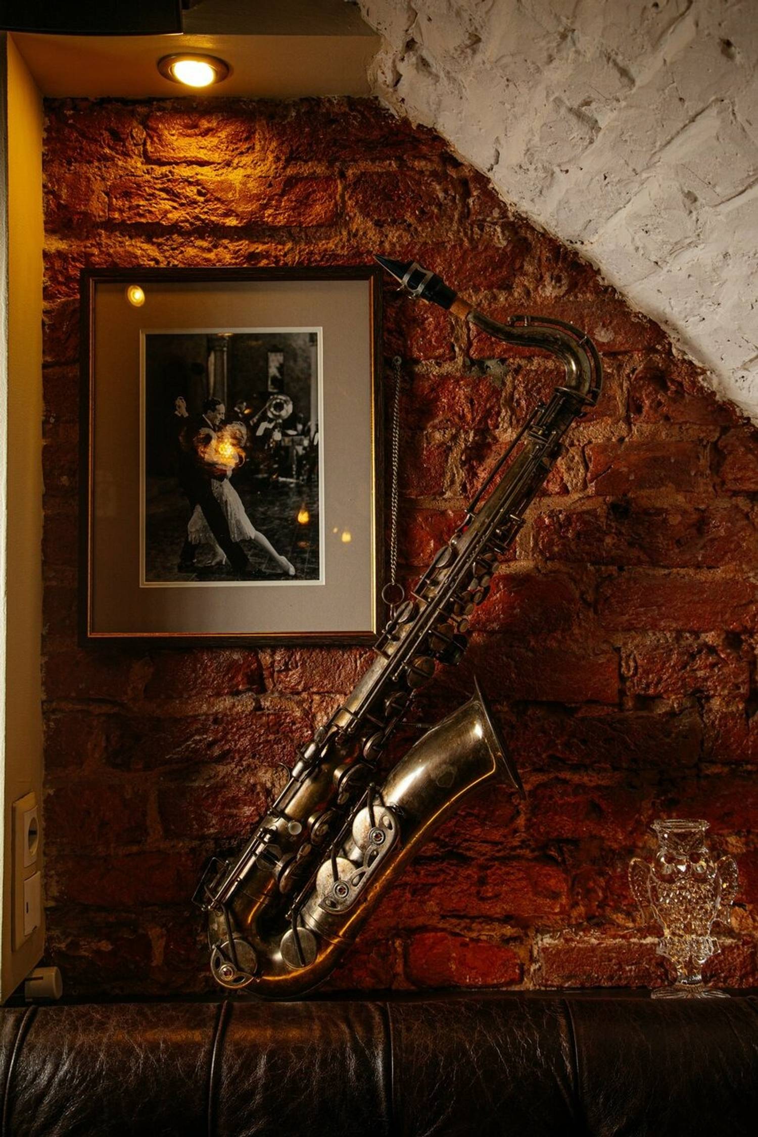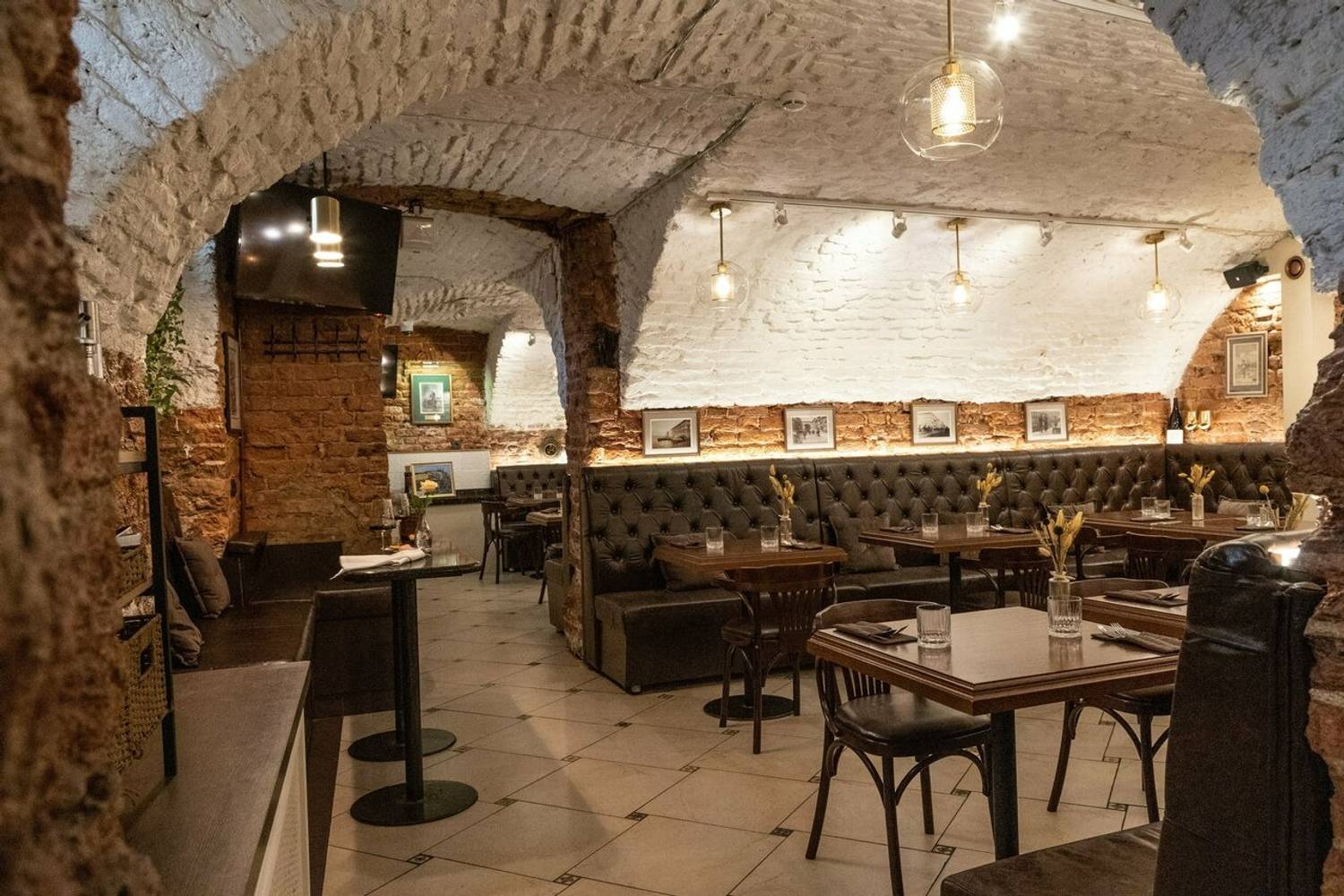 Атмосфера. Обстановку цокольного этажа поддерживают кирпичные стены и своды, а роскоши добавляют кожаные диваны и фигуры в античном стиле. Гости могут расположиться не только за столами в кирпичных залах с винтажными фотографиями, но и барной стойкой с подсветкой.