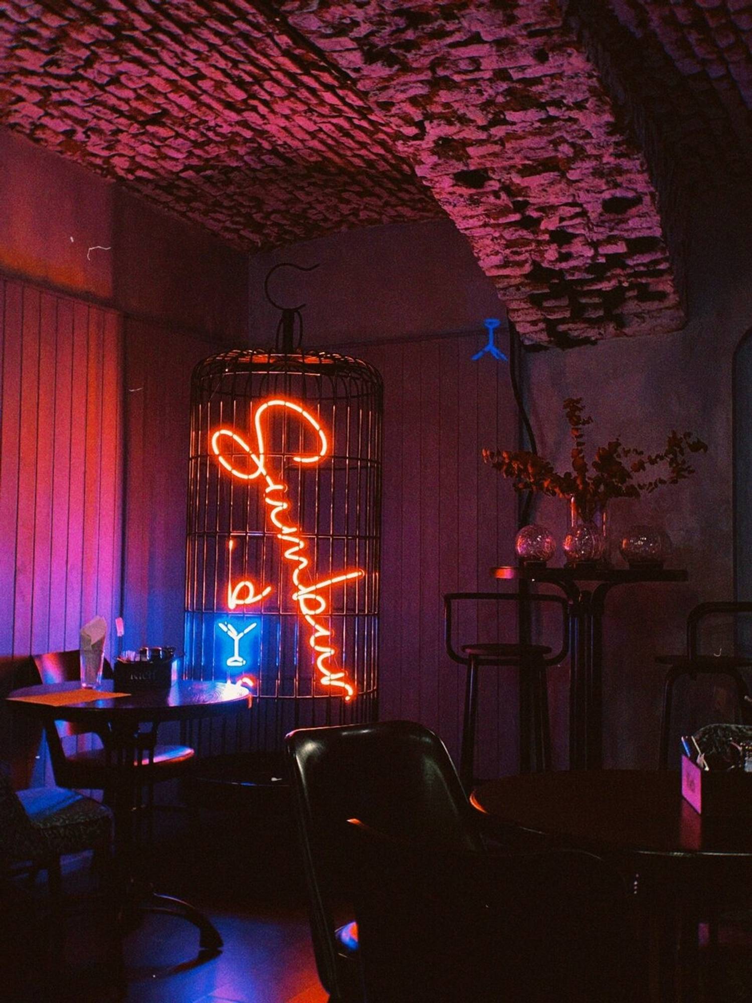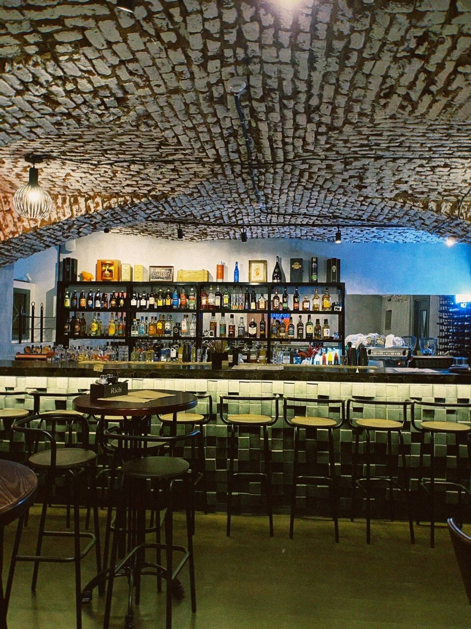 Атмосфера. Три зала в индустриальном стиле: сводчатые кирпичные потолки, граффити и черная клетка с неоновой надписью названия бара. Есть контактный бар, лаунж-зона и основной зал с диджейской зоной.
