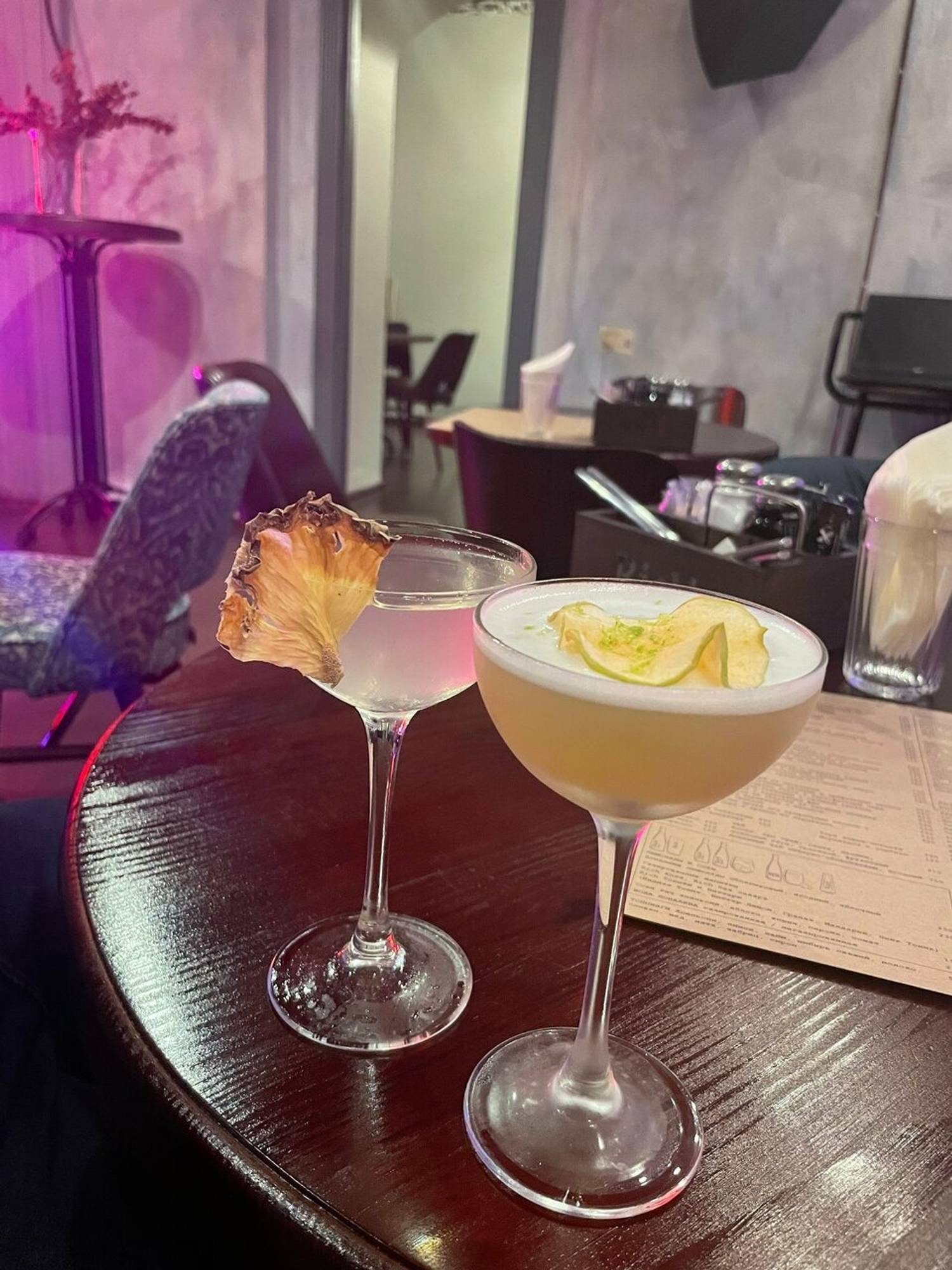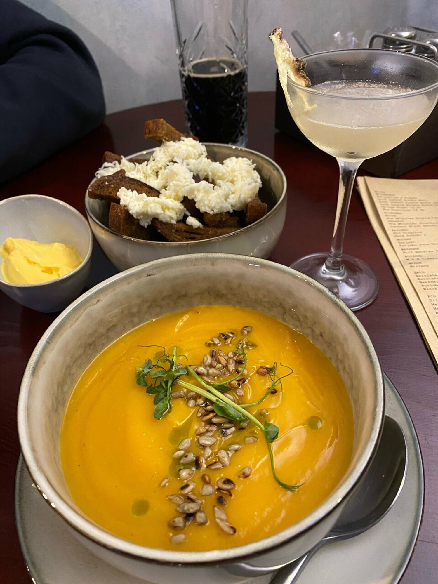 Еда и напитки. В меню европейская кухня: котлеты из щуки с пюре из сельдерея, шницель по-питерски, паста black pepper с говядиной и клецки в муссе из пармезана с беконом. Среди напитков крафтовое пиво, сидр, настойки на печеных яблоках, карамели, джине с малиной и коктейли с ананасом и кокосом.