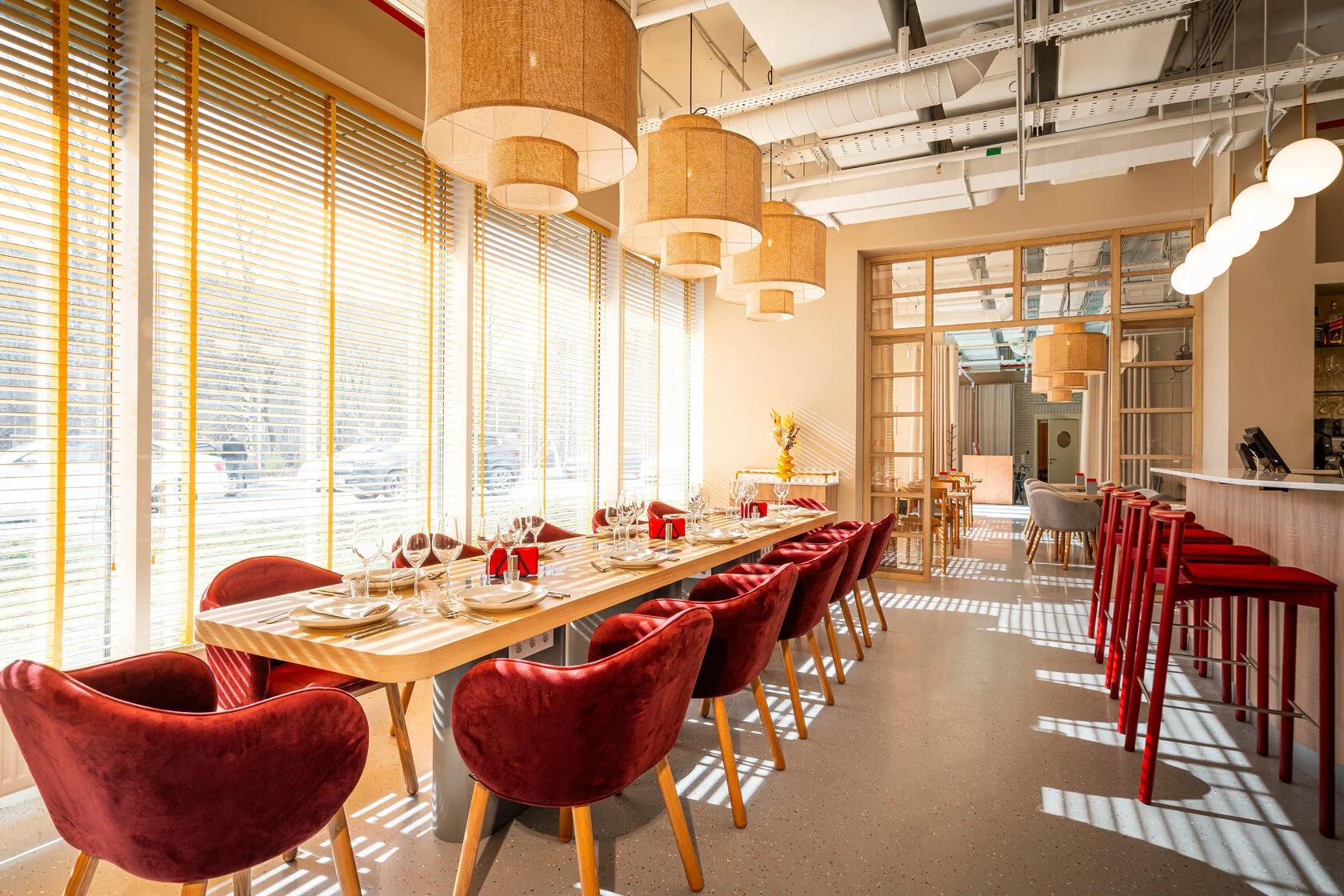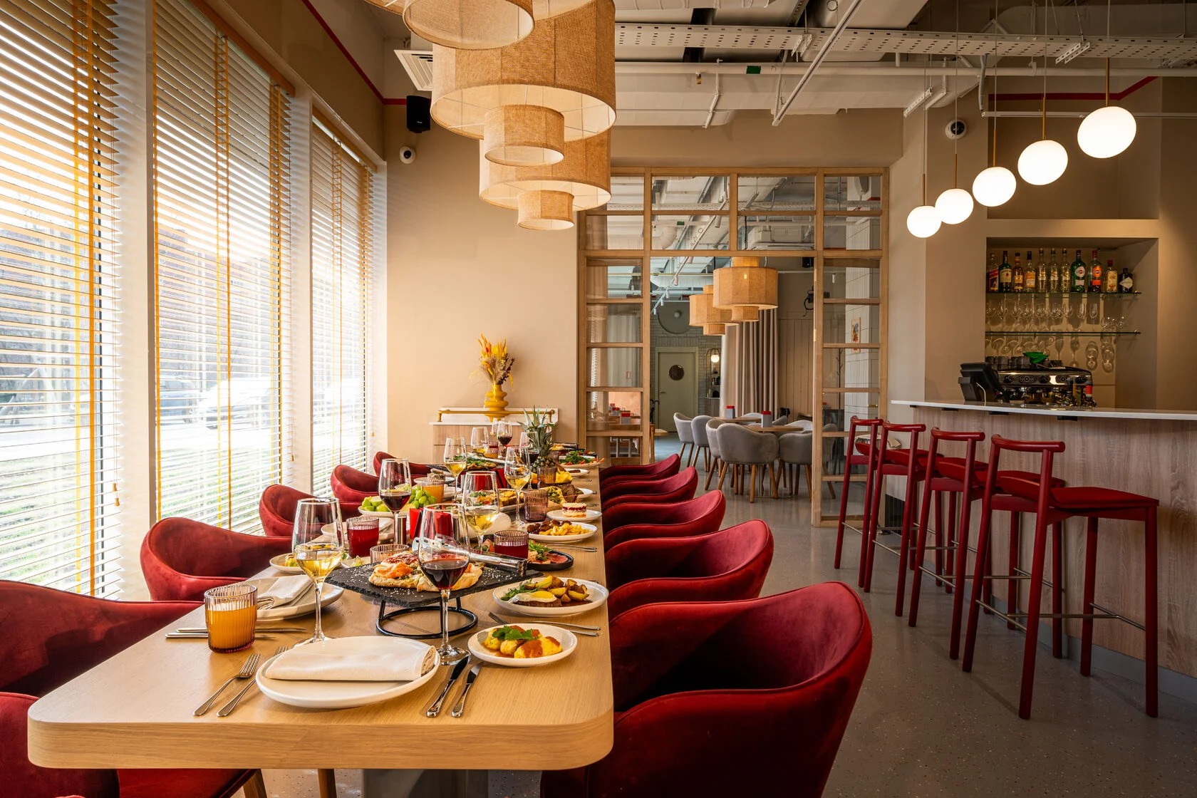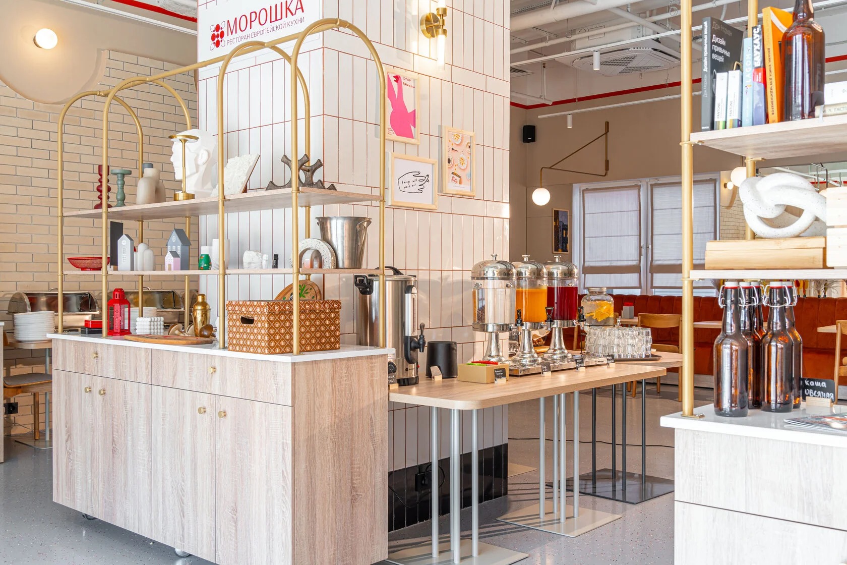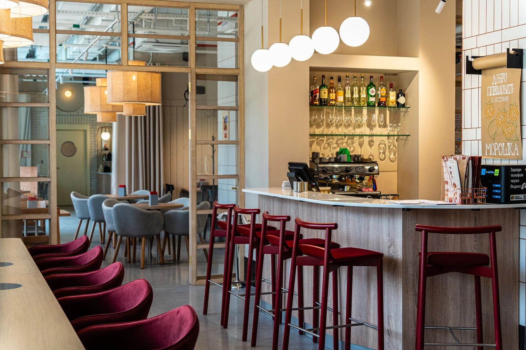 Атмосфера. Здесь три зала в светлом скандинавском стиле. Дизайн дополняют яркие акценты: красные стулья у барной стойки, картины с цветочными мотивами и белая колонна.
