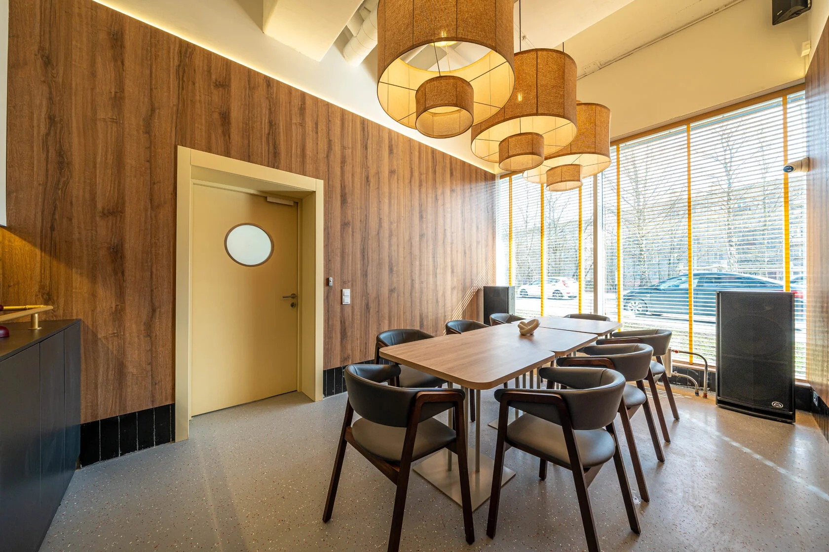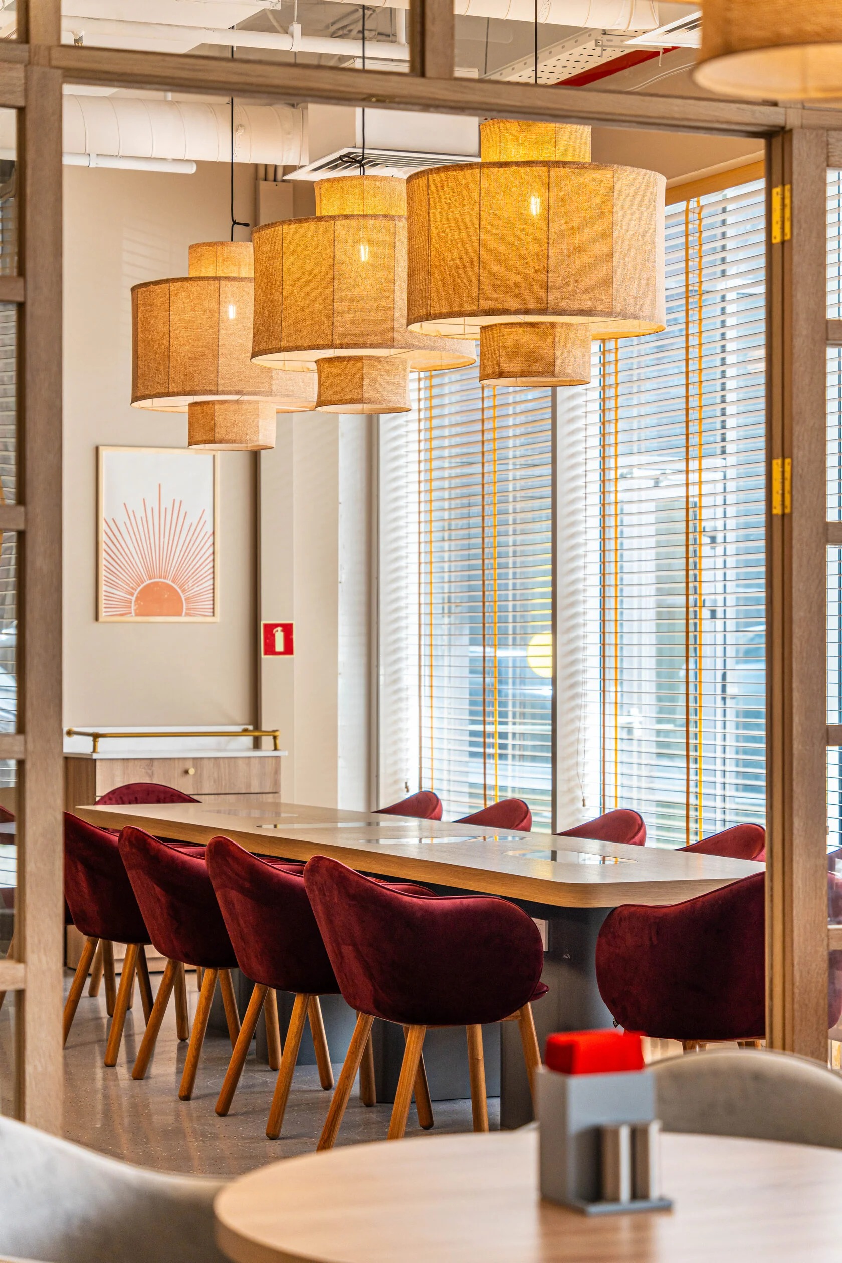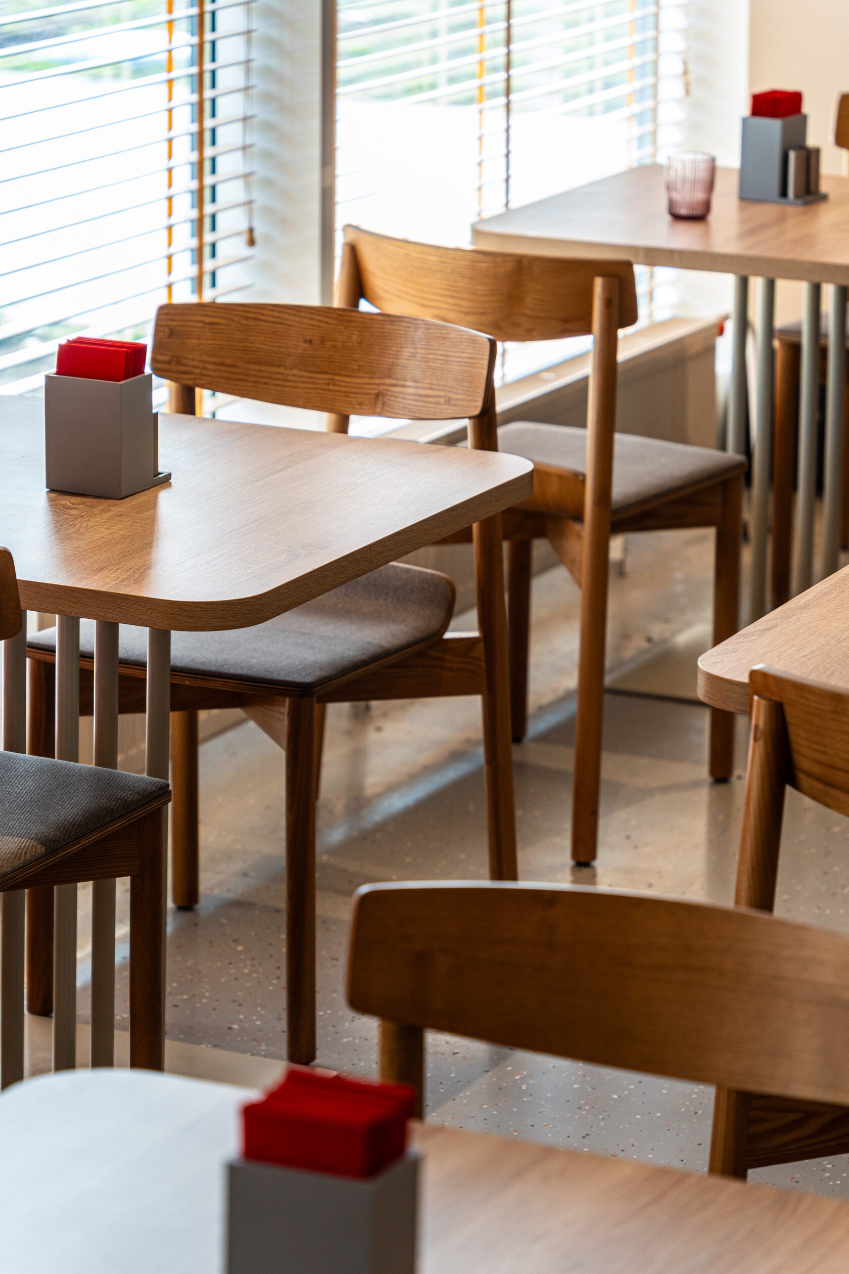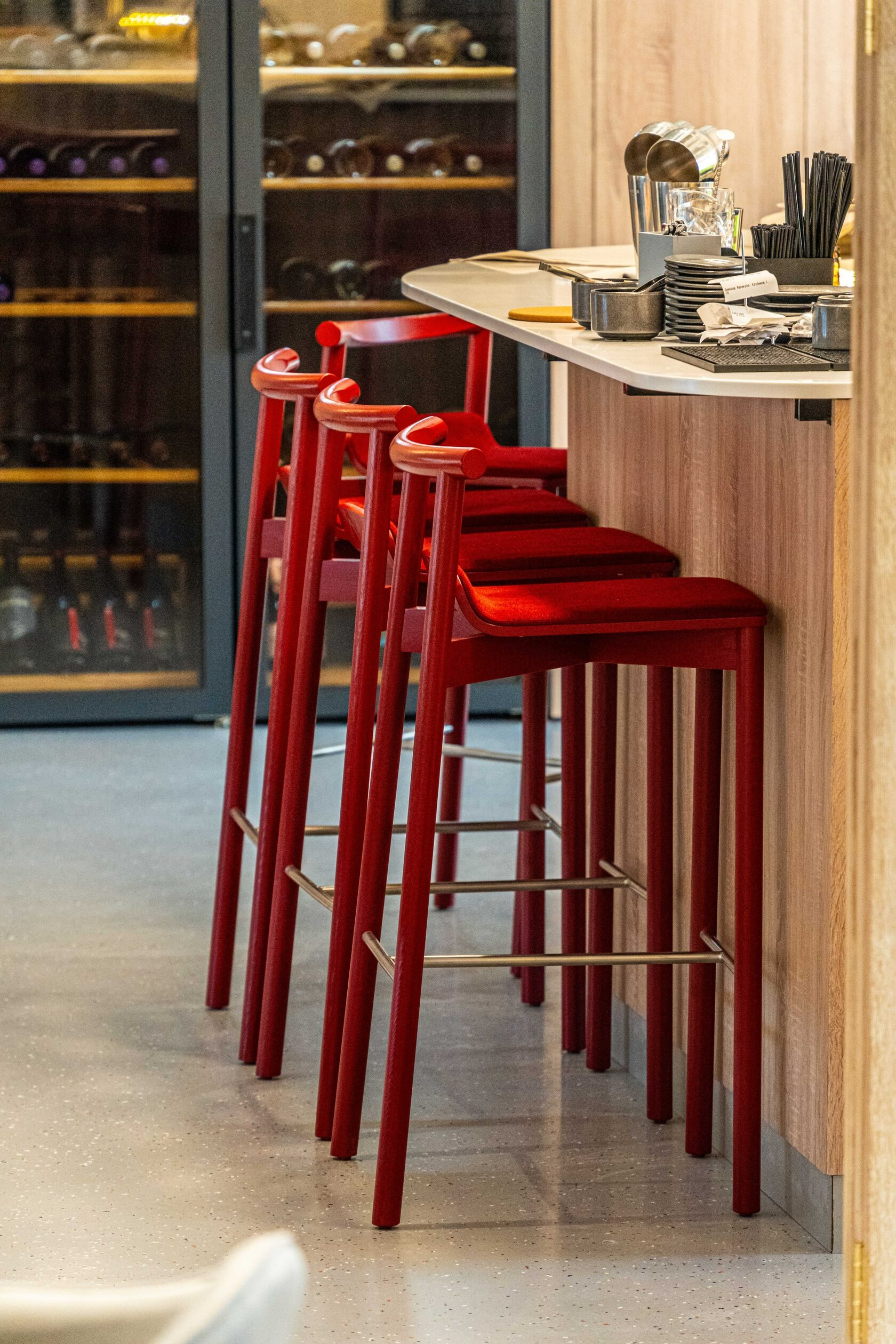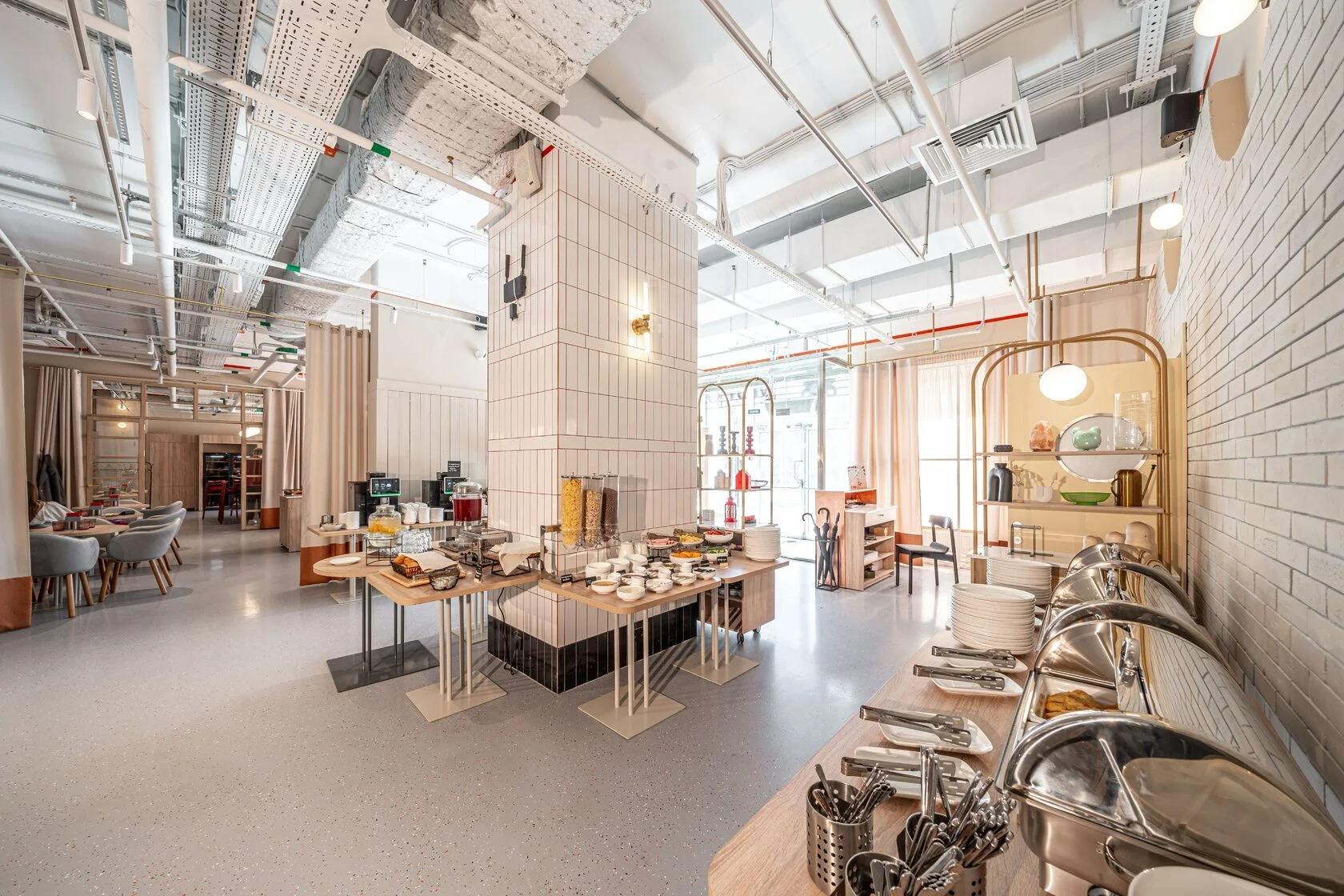 Атмосфера. Здесь три зала в светлом скандинавском стиле. Дизайн дополняют яркие акценты: красные стулья у барной стойки, картины с цветочными мотивами и белая колонна.