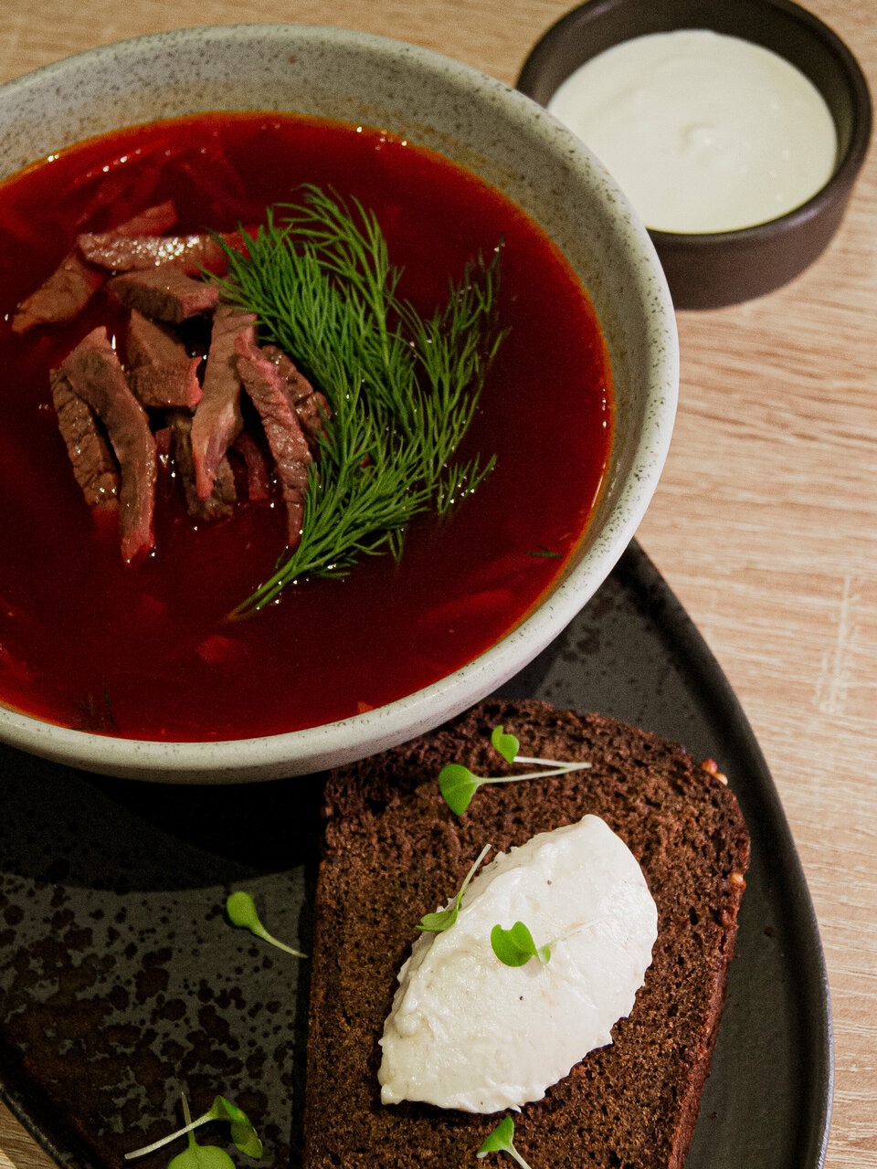 Еда и напитки. В меню — смешанная кухня: балтийские голубцы, говяжья грудина со стейком из капусты, гребешки с кремом из сельдерея и соусом бер блан, ладожский судак с азиатским соусом, паста страчателла. На десерт предлагают булочка шу со сливочным кремом и шоколадный ганаш с вишней в коньяке.