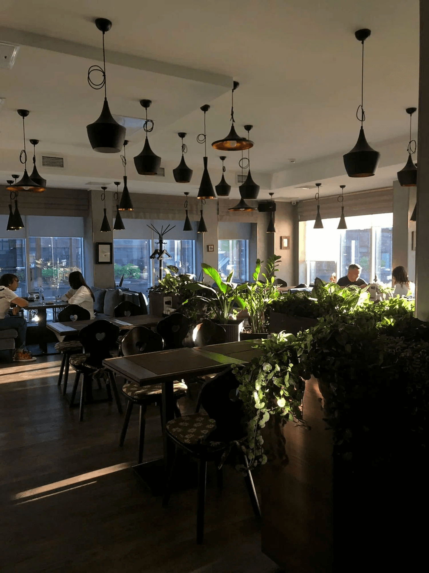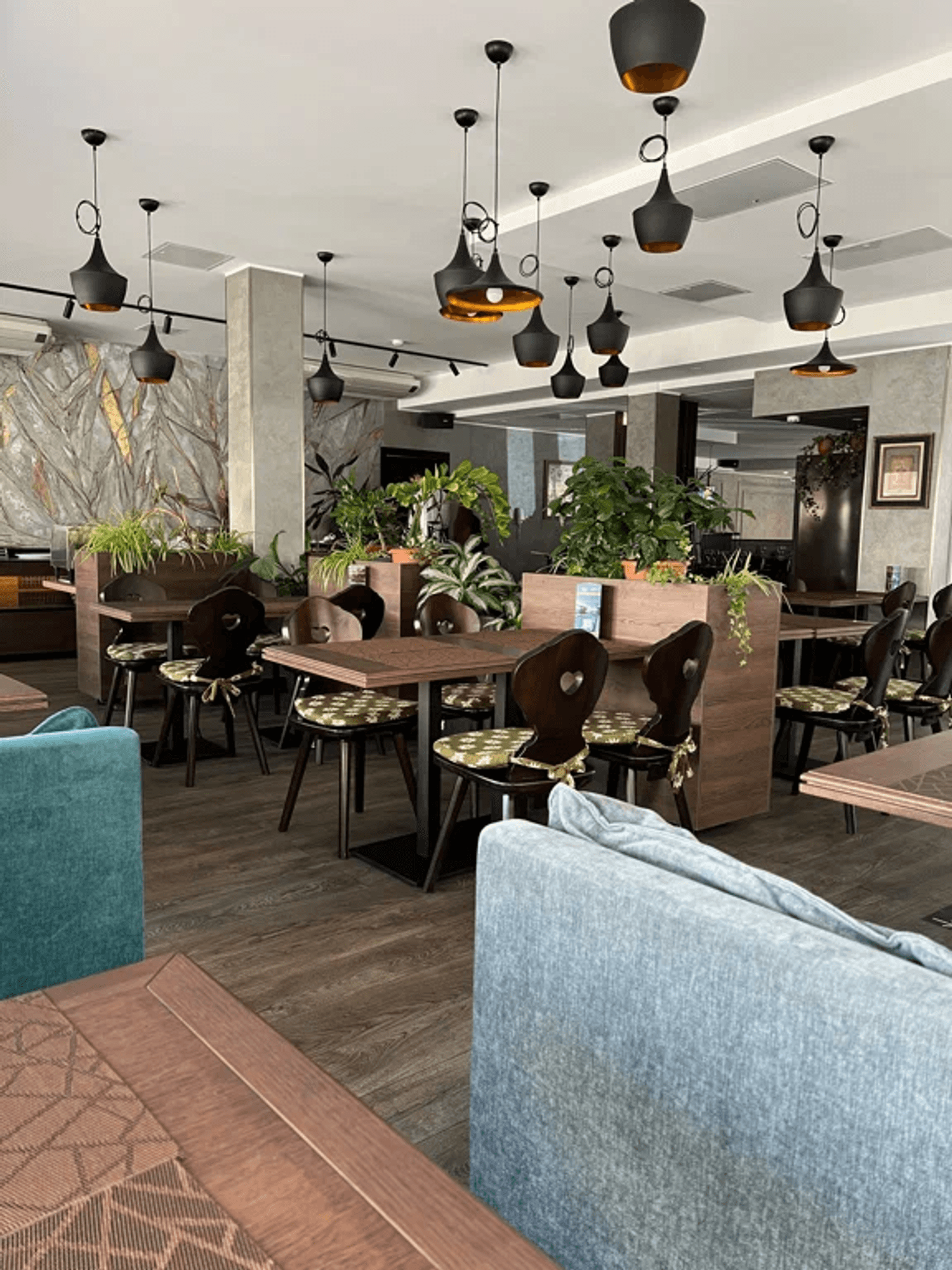 Атмосфера. Интерьер оформлен с акцентом на натуральные материалы: дерево, текстиль, живые растения и сухоцветы. В теплое время года открыта веранда, увитая лозами винограда, где приятно провести обед или вечер.