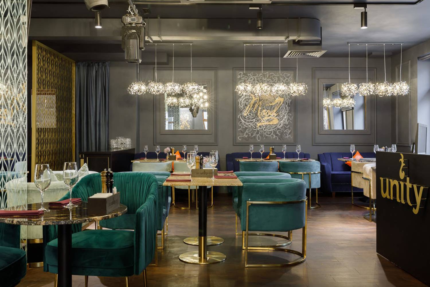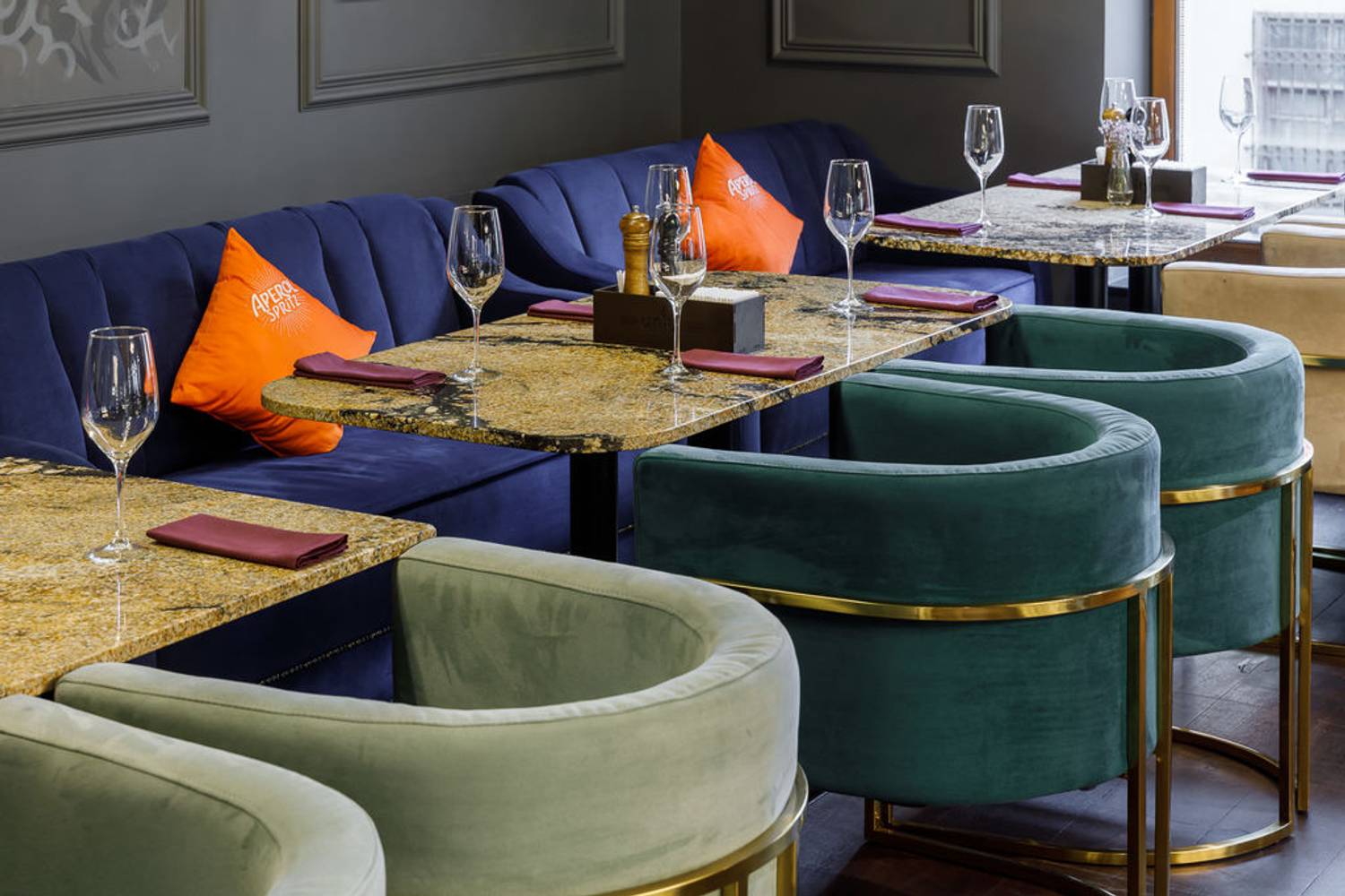 Атмосфера. Внутри мраморные столики, золотые люстры и разноцветные кресла, которые создают атмосферу лофта с элементами роскоши. Кроме основного зала, есть VIP на 20 человек.