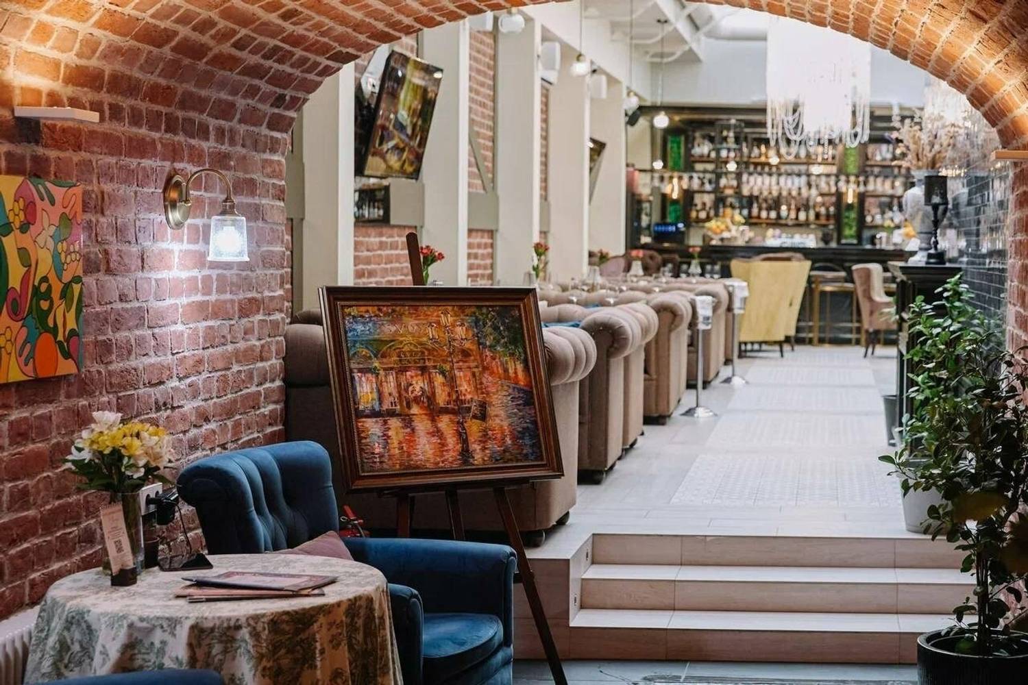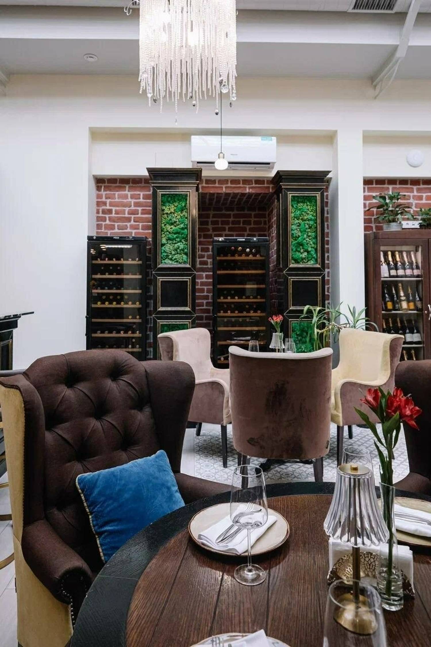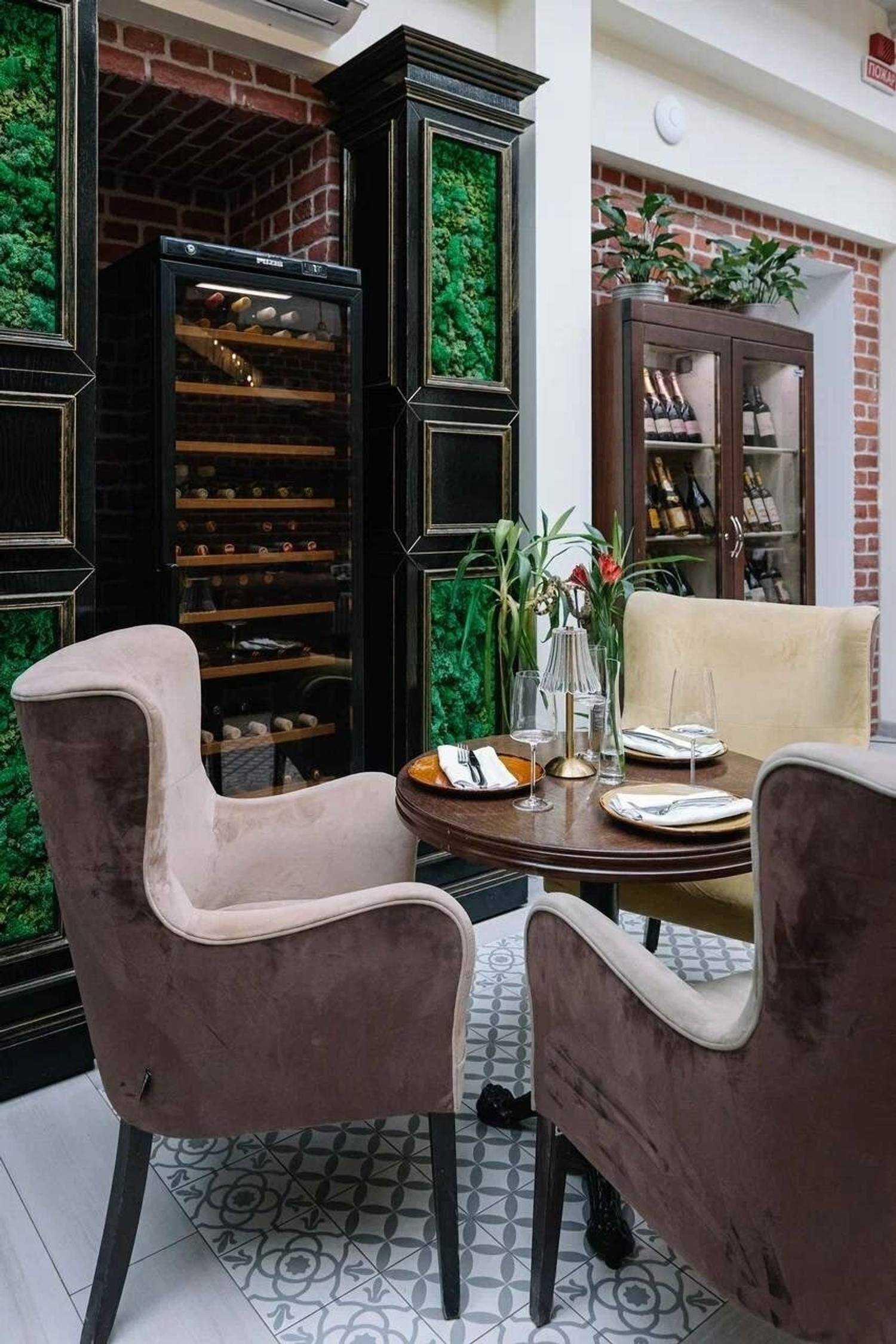 Атмосфера. Здесь несколько залов с разными характерами. «Дворик» под стеклянной крышей с кирпичными стенами, деревянными шкафами для вина и жемчужными люстрами, в зале «Бордо» гостей ждут караоке и живая музыка, а в «Шампань» — мебель в стиле ампир. Также есть отдельный камерный кабинет для небольших компаний.