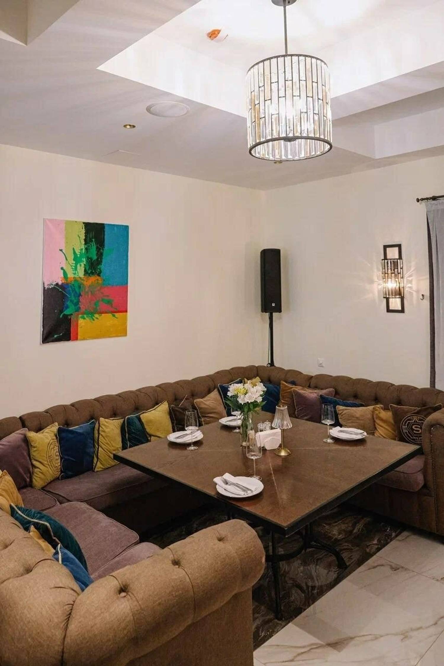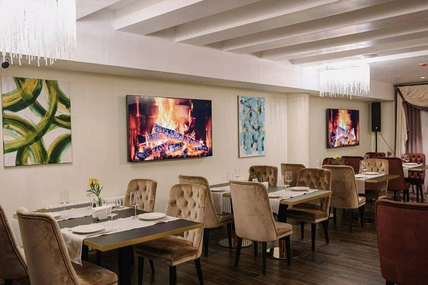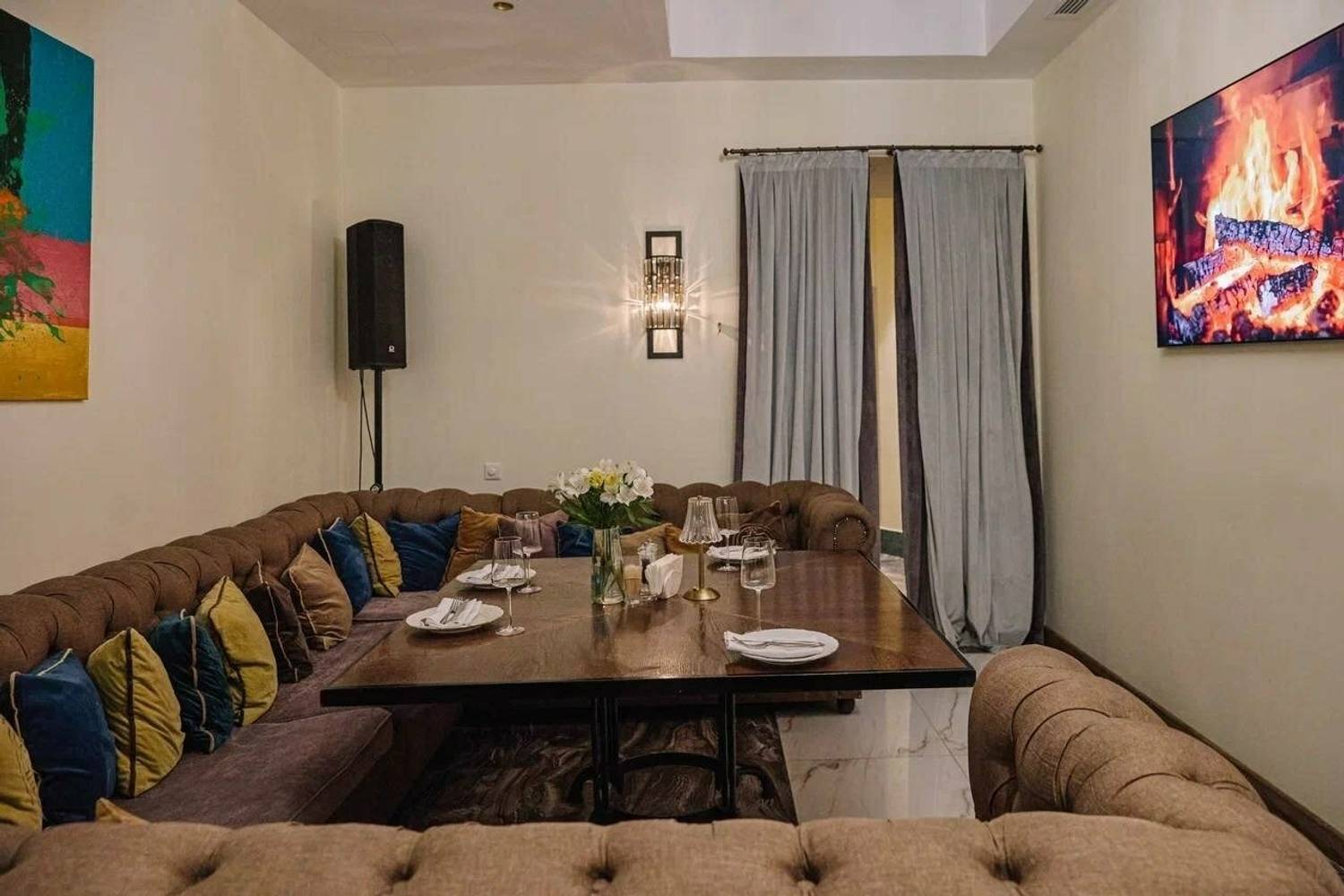 Атмосфера. Здесь несколько залов с разными характерами. «Дворик» под стеклянной крышей с кирпичными стенами, деревянными шкафами для вина и жемчужными люстрами, в зале «Бордо» гостей ждут караоке и живая музыка, а в «Шампань» — мебель в стиле ампир. Также есть отдельный камерный кабинет для небольших компаний.