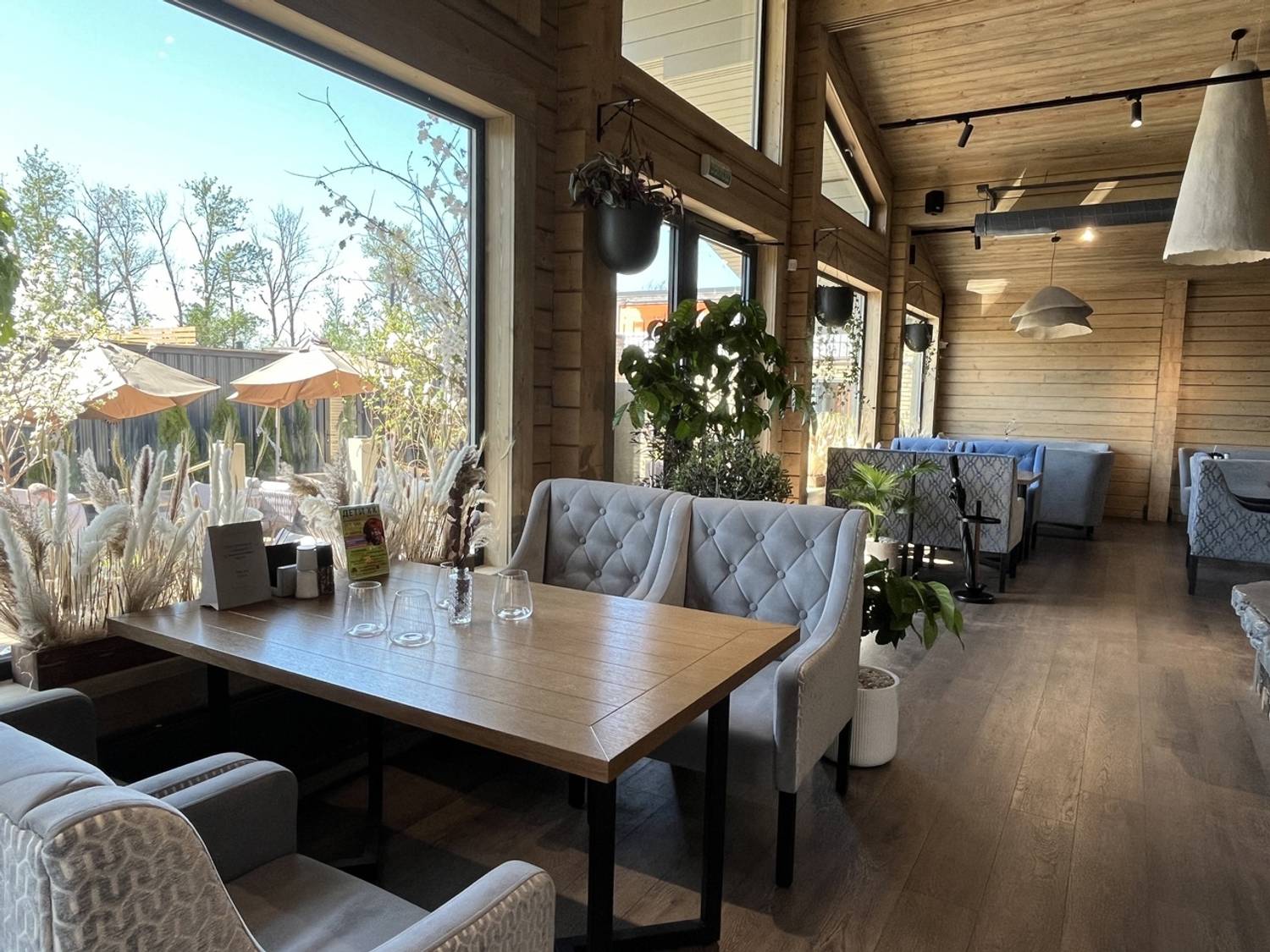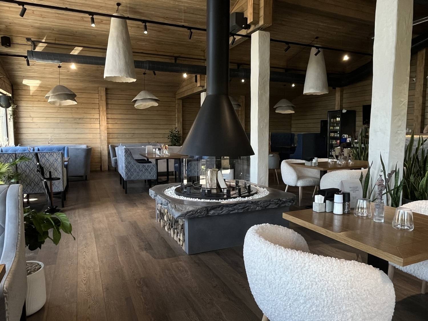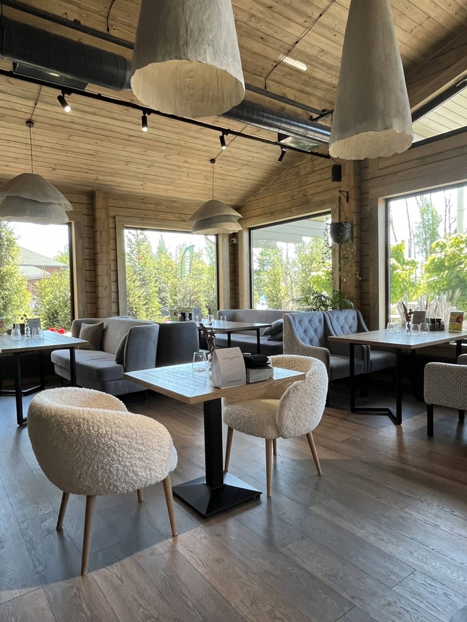 Атмосфера. Вы словно оказались на даче: пространство в стиле загородного дома со светлой деревянной отделкой, камином, дизайнерскими светильниками и живыми растениями. Также на территории расположен открытый бассейн, зеленые зоны и детская игровая площадка.